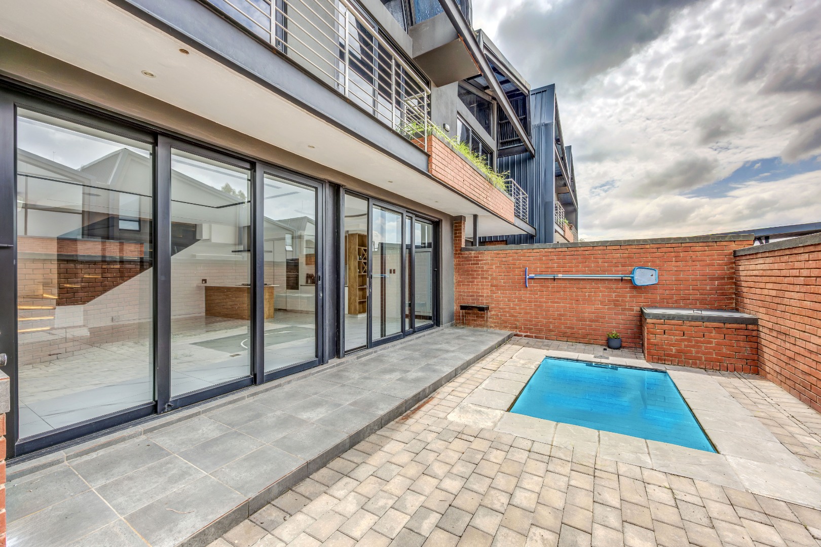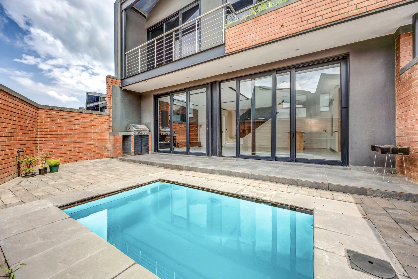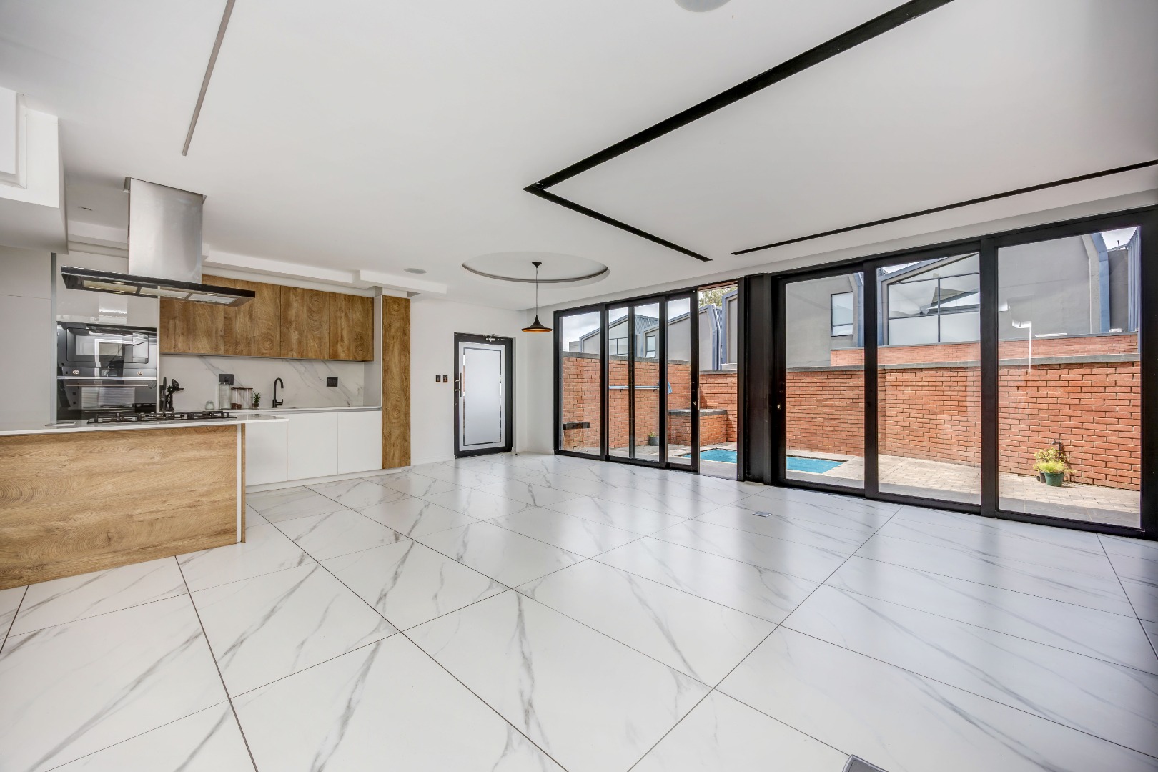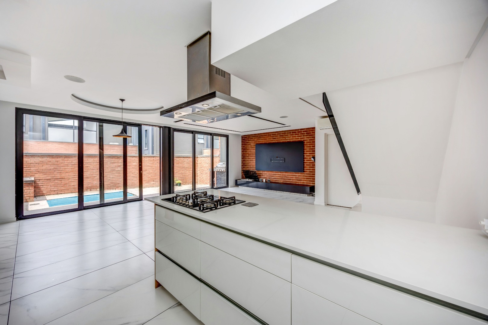 As you enter the house, you will be greeted by a spacious living area with ample natural light and a sleek design. The open plan kitchen is fully equipped with SMEG appliances ( dishwasher, washing machine, dryer, microwave and an integrated fridge), making it perfect for cooking and entertaining guests. The outdoor terrace provides a relaxing space to enjoy a braai and pool area.