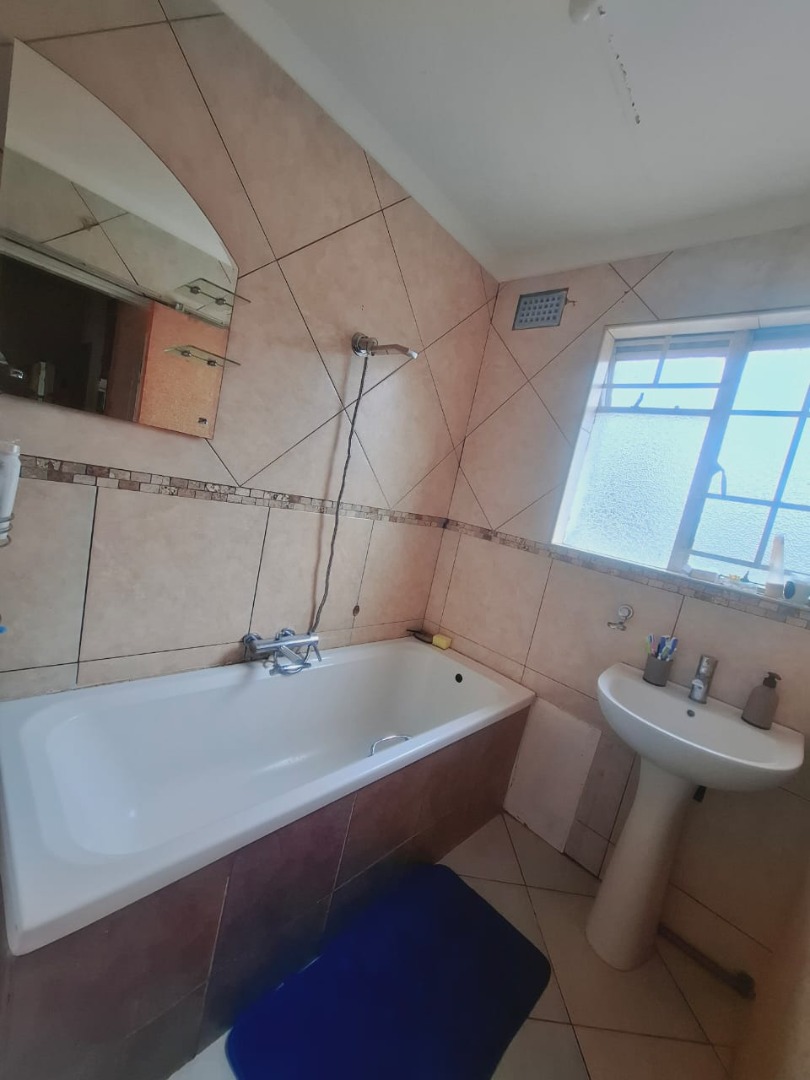 On the first floor you'll find three spacious bedrooms with laminated flooring, one of which has a built-in cupboard. The bathroom is fully tiled from floor to ceiling and features a bath, showerhead, and basin. A separate toilet area is also tiled and contains a single toilet."