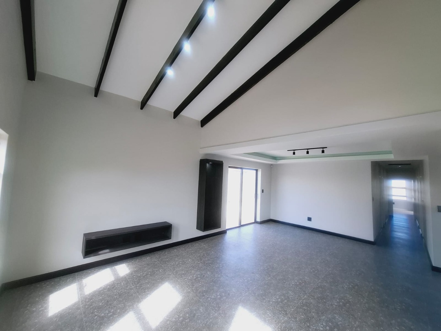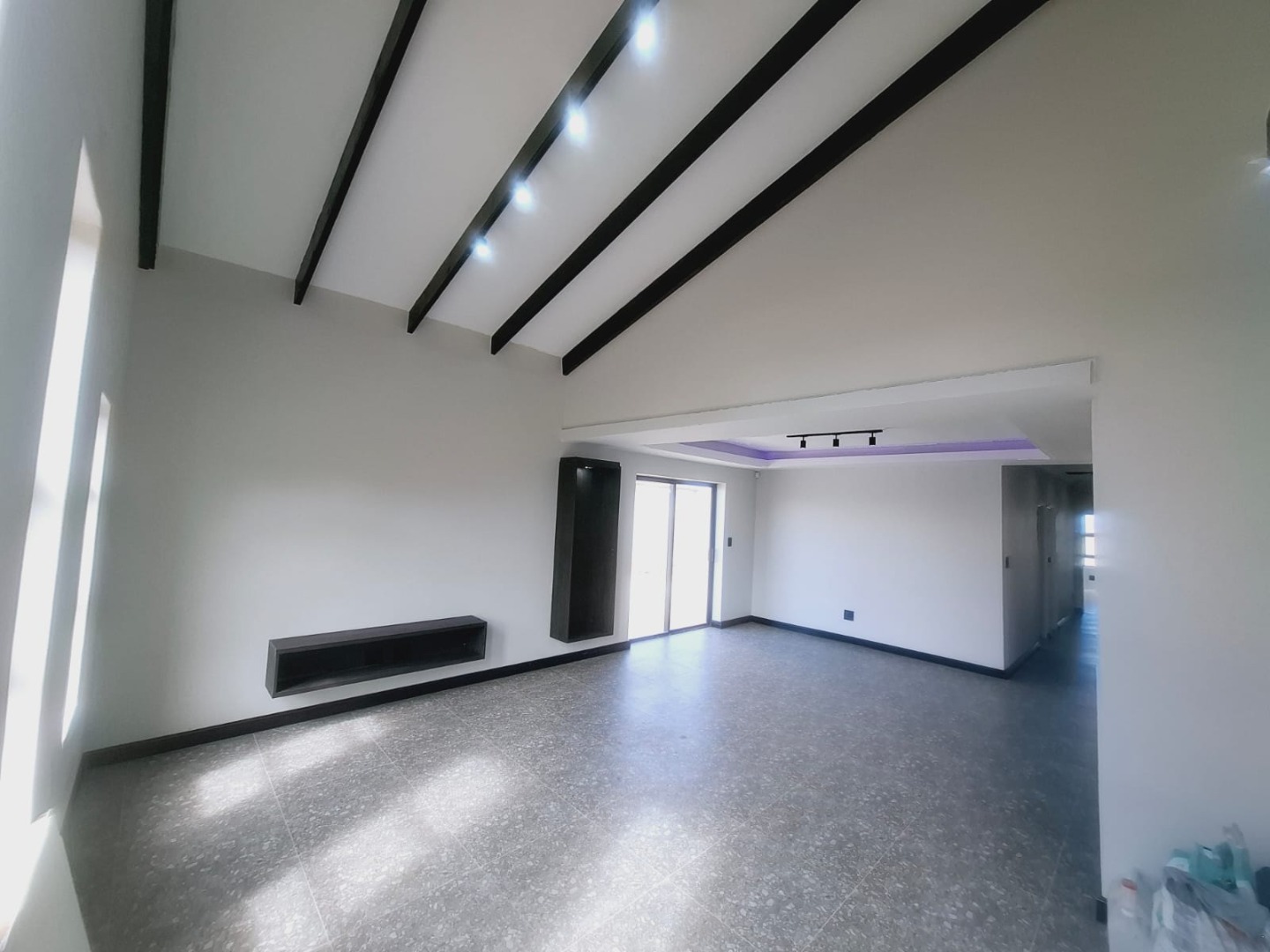 The main bedroom is a standout, boasting a spacious layout, ample cupboard space, and a sliding door entrance. The en-suite bathroom features a bath, private shower, and high ceilings, matching the grandeur of the main bedroom.