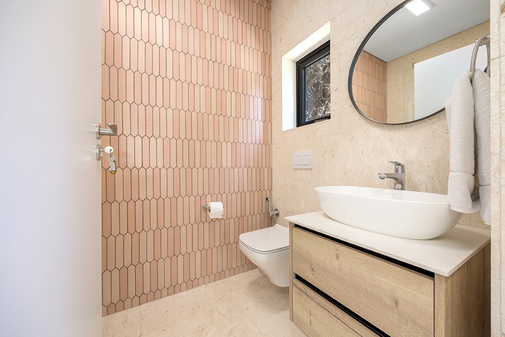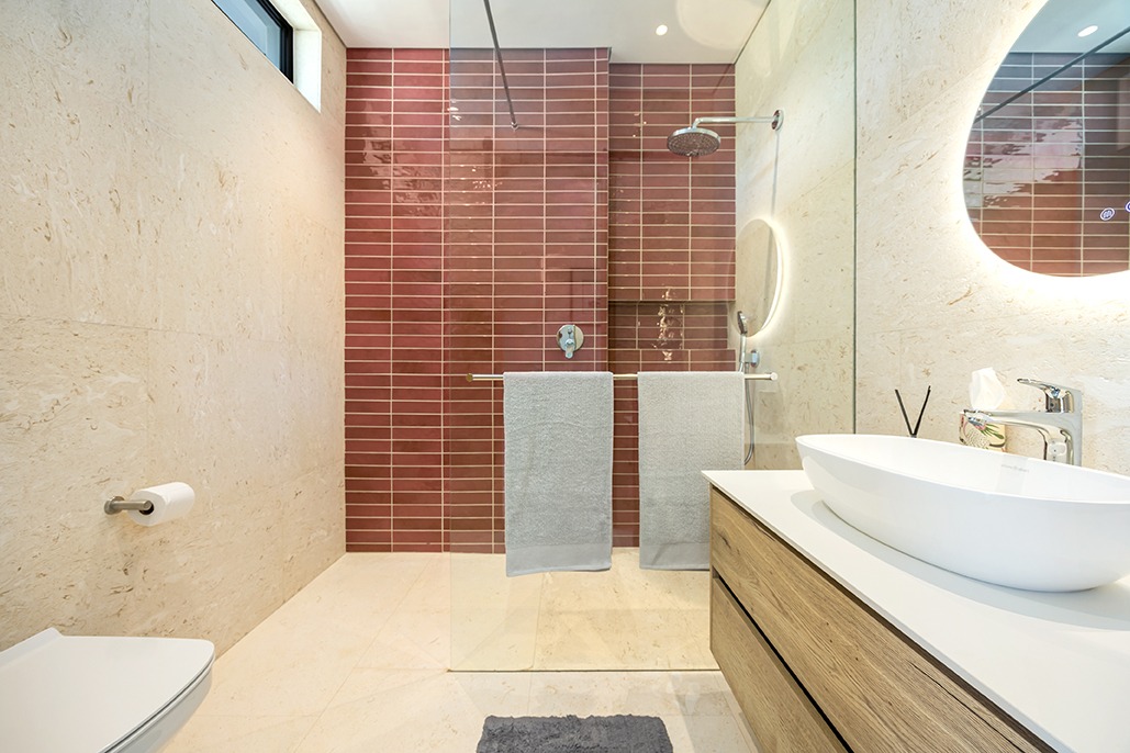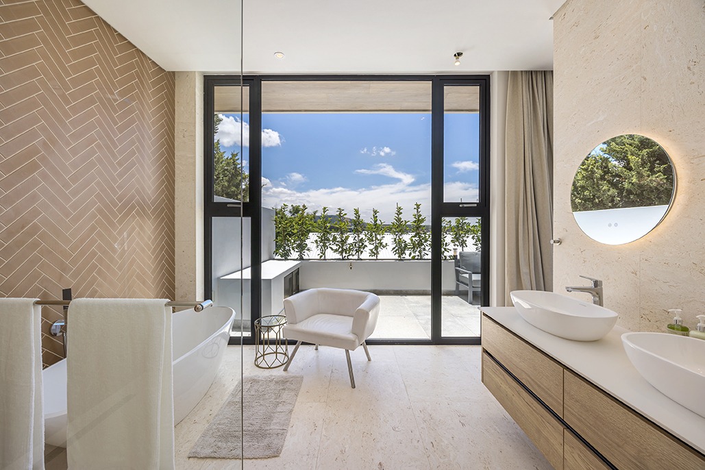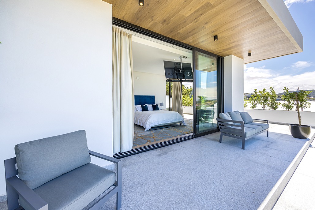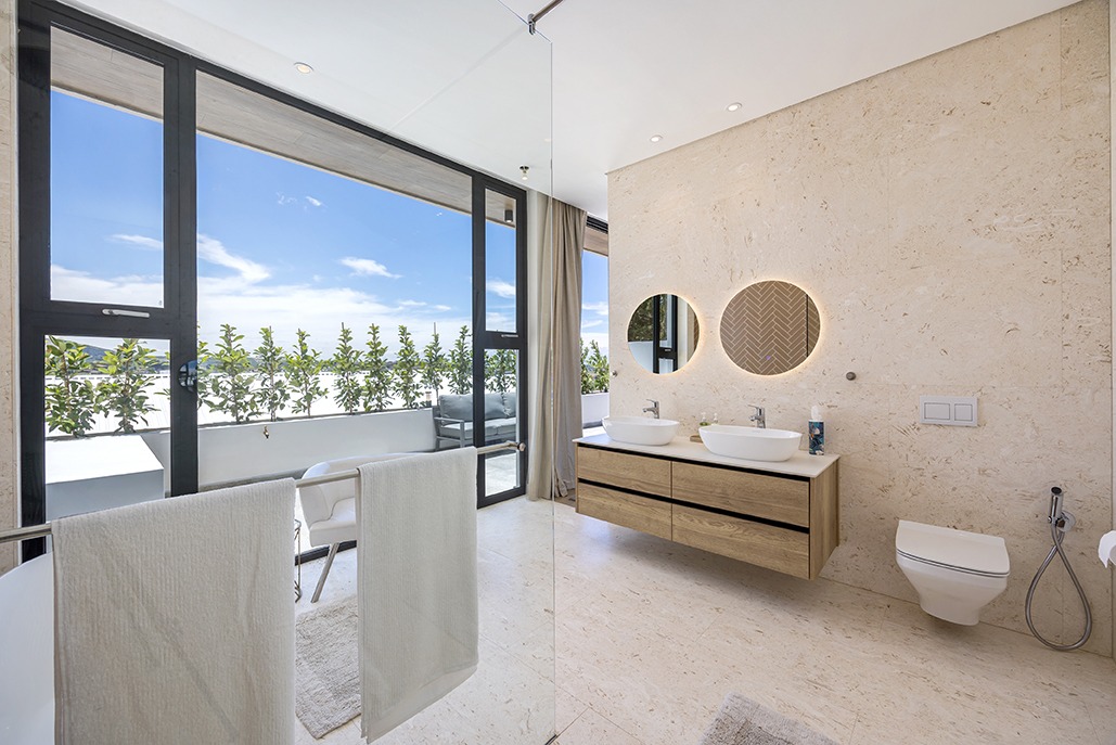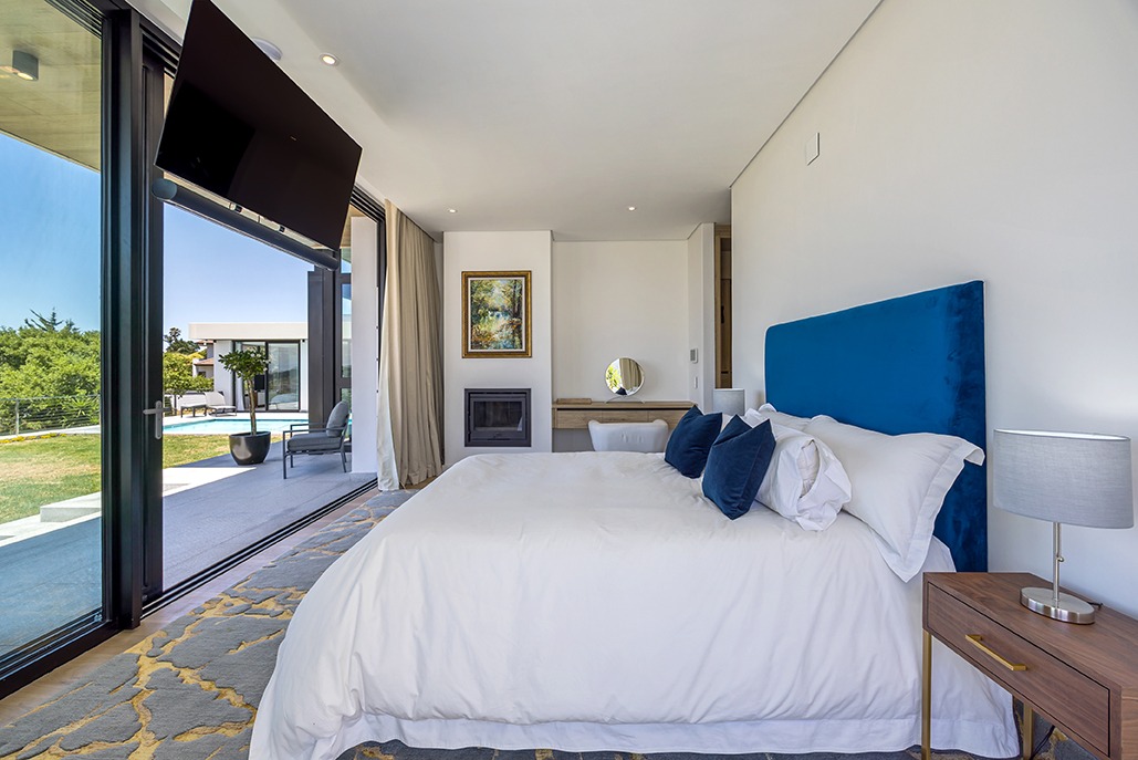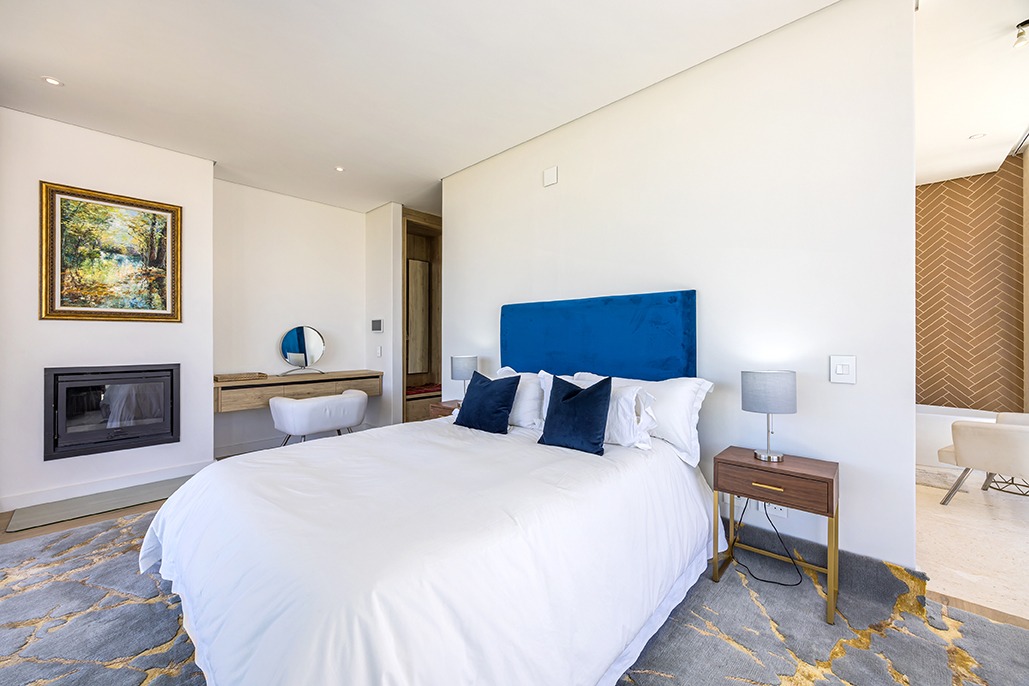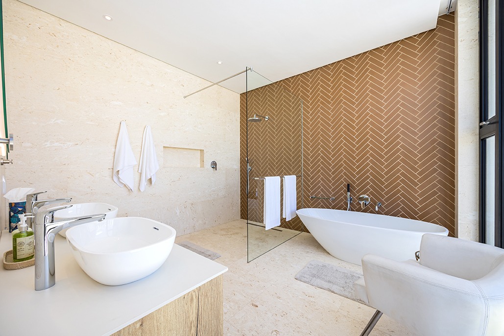 The villa offers five beautifully appointed en-suite bedrooms. The primary suite is a serene retreat tucked into the private northern wing, boasting a spacious walk-in closet, spa-style bathroom with a freestanding tub, walk-in shower and double vanity, fireplace and direct terrace access with captivating views. Three additional bedrooms in the opposite wing of the property provide equal comfort and style, with each bedroom opening directly onto the pool terrace—ideal for guests or family members seeking their own peaceful corner.