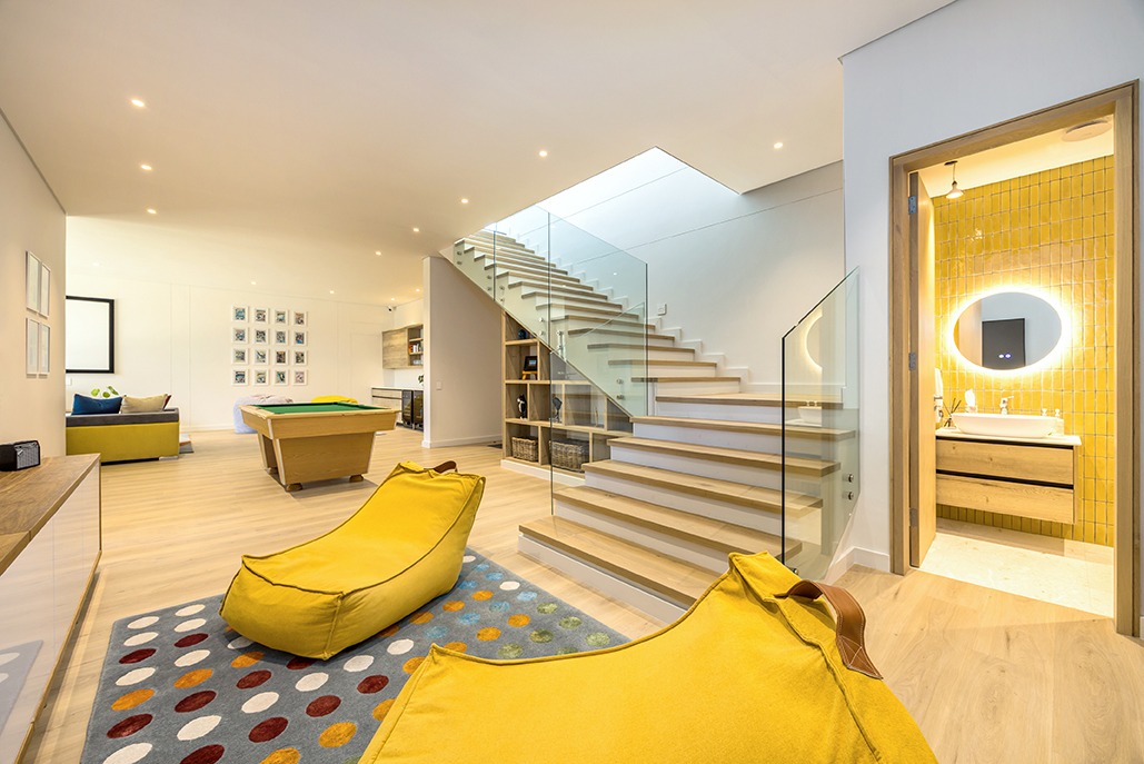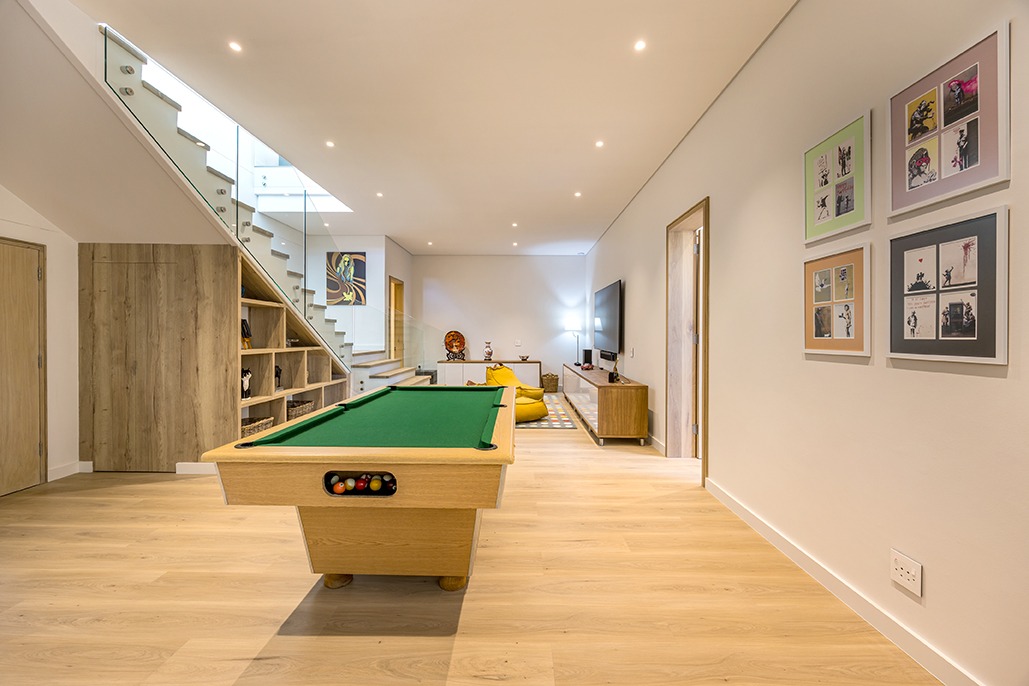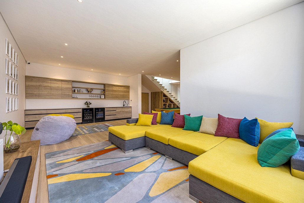 The lower level of the home is dedicated to leisure and indulgence. A guest loo and a state-of-the-art entertainment area which includes a cinema room, bar with built-in wine fridges, and an additional guest suite with its own bathroom complete the lower level. This level also offers seamless access to the four car garage.