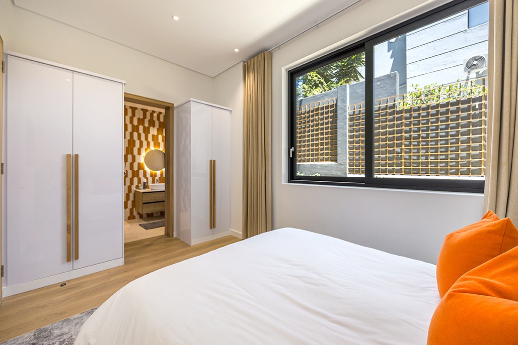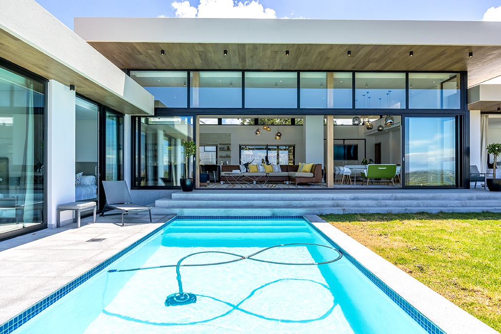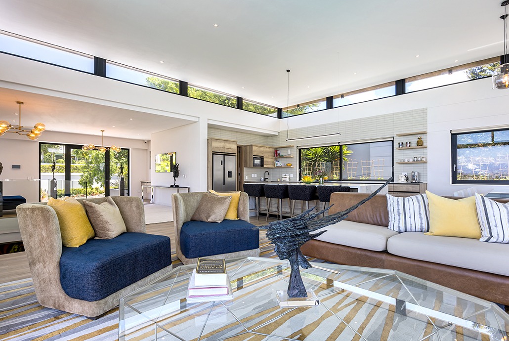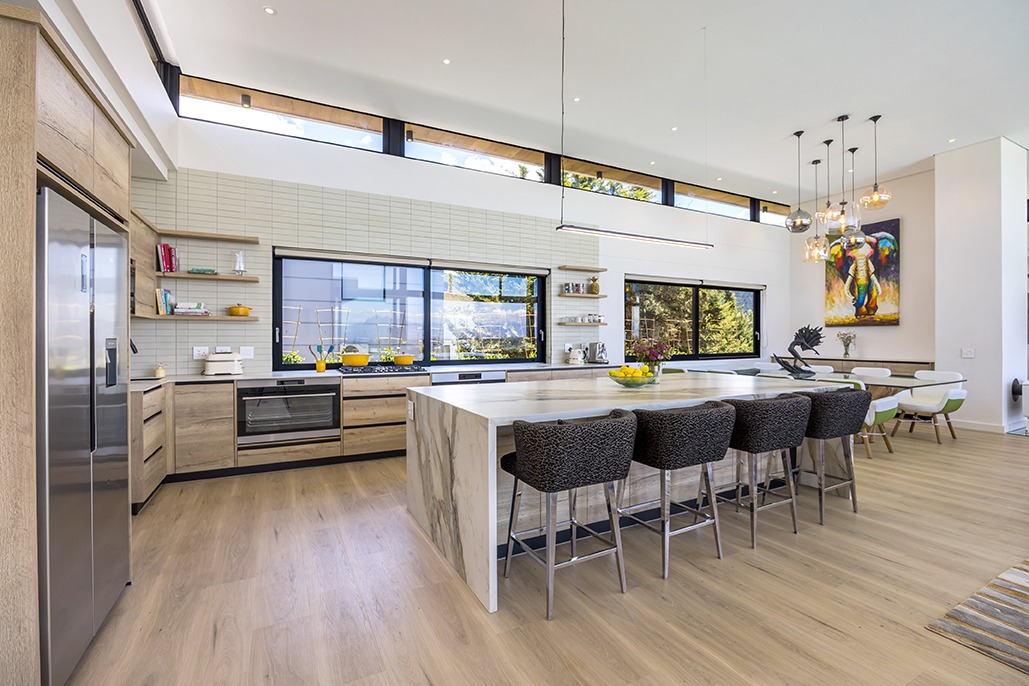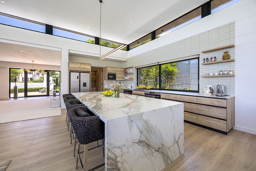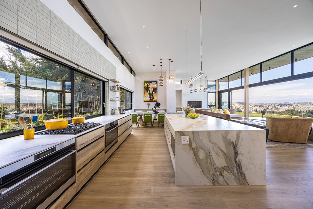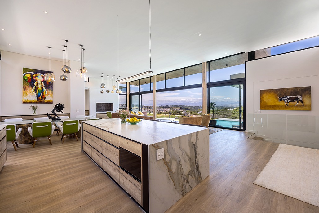 The heart of the villa is its open-plan living, dining, and kitchen area, featuring soaring double-volume ceilings, a beautiful fireplace, and large sliding doors that dissolve the boundary between indoor sophistication and outdoor leisure. The chef’s kitchen is a masterpiece, complete with a waterfall-edge island, double ovens, gas stove, hidden pop-up extractor fan, separate scullery and ample prep space—perfect for everyday family living or effortless entertaining. An indoor braai area further enhances the home’s entertainment appeal.