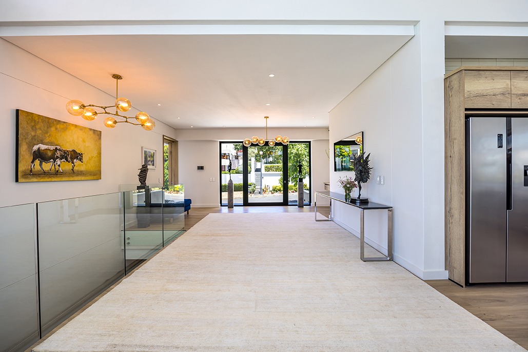As you enter the home, a striking glass entrance door opens into a spacious, grand foyer bathed in natural light from expansive windows. This sets the tone for the home’s refined aesthetic and flawless flow.