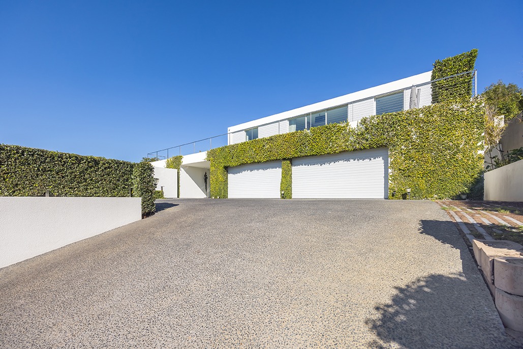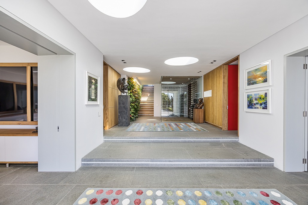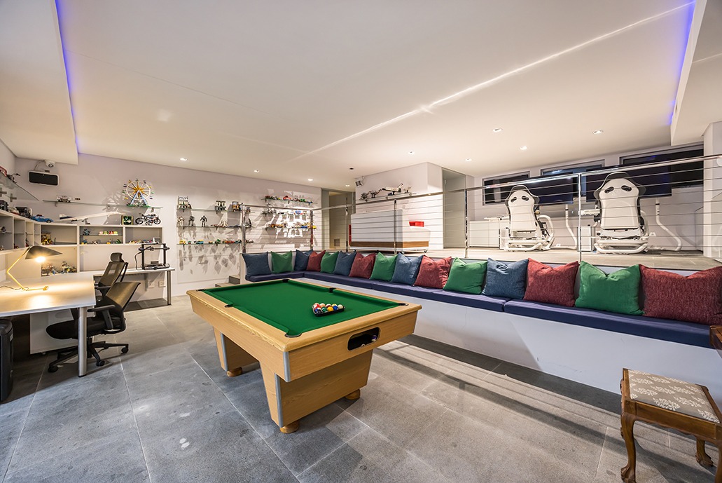 As you step inside, the first thing that captures your attention is the abundance of natural light flooding the space, thanks to three impressive skylights above the entrance hall. A lush green living wall commands admiration, perfectly positioned alongside the grand staircase that ascends through all three levels. To one side, an exquisite wine cellar awaits, while the other side reveals a spacious, private office with direct access to the garden, offering a peaceful view of the pond. The ground floor further impresses with a guest powder room and a quartet of garages, ensuring ample space for your prized vehicles.