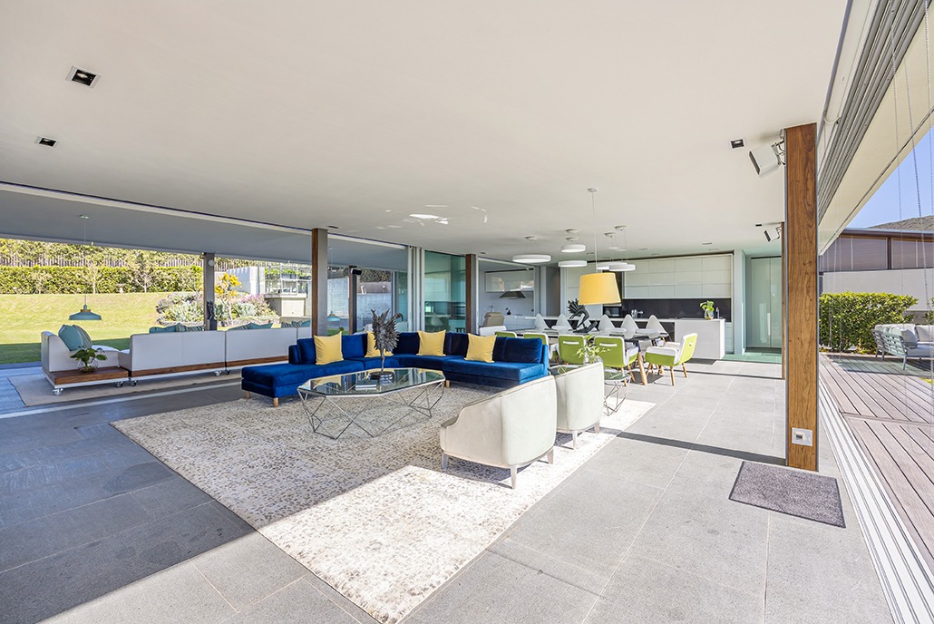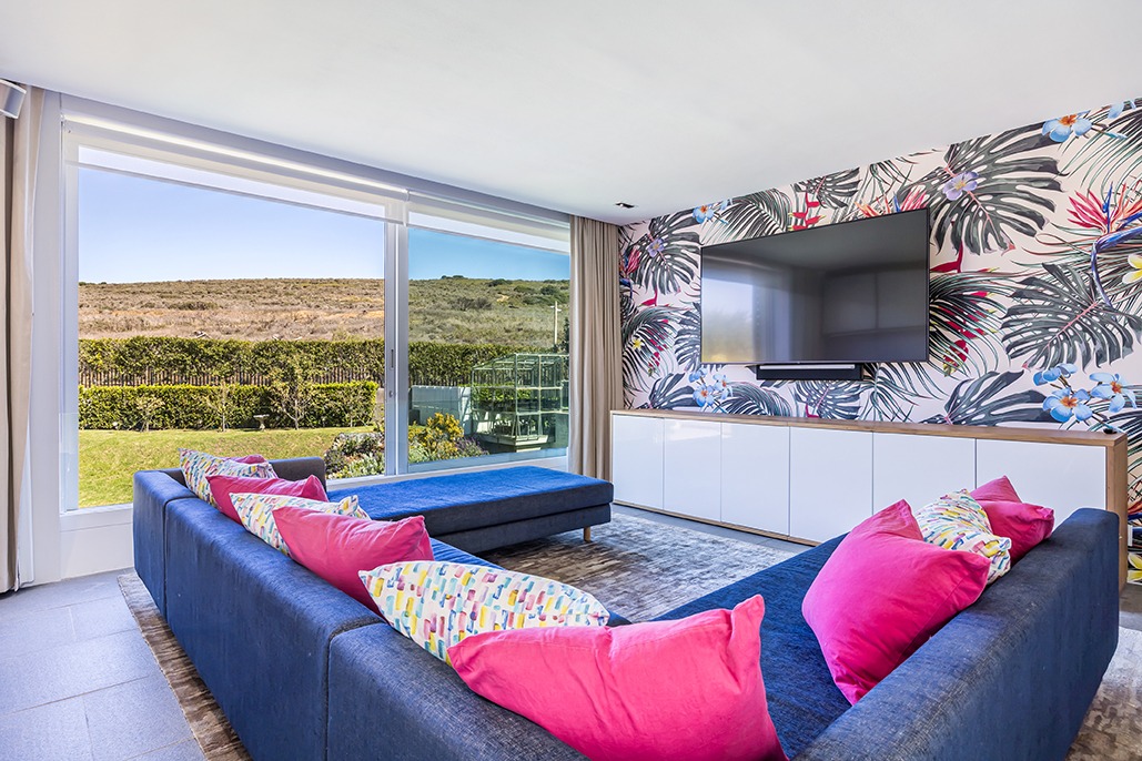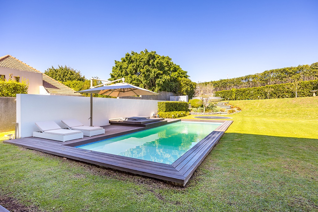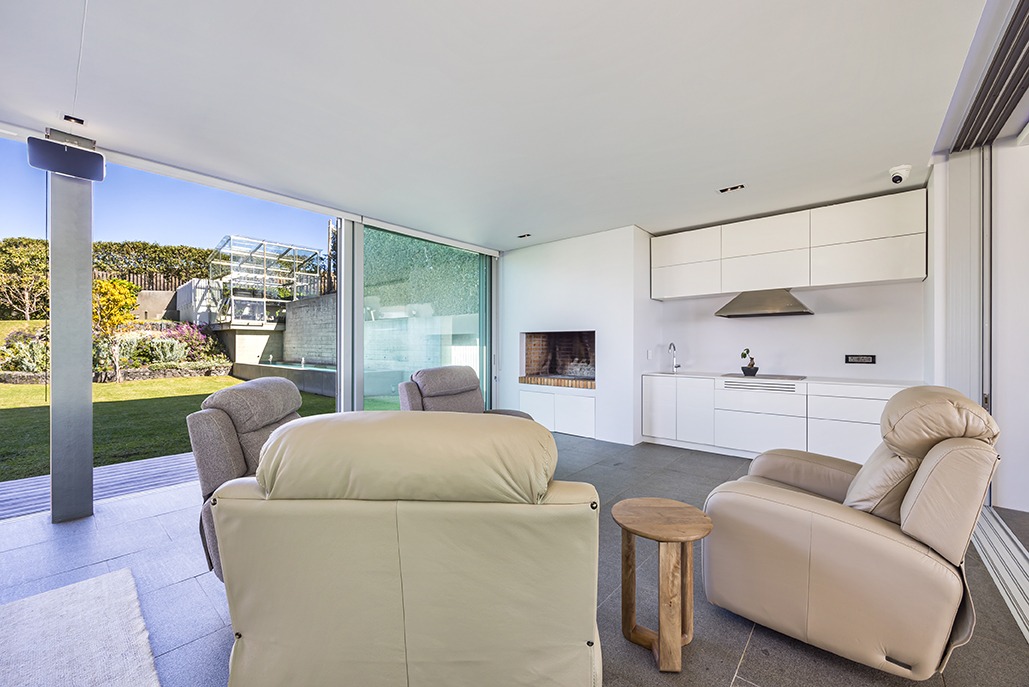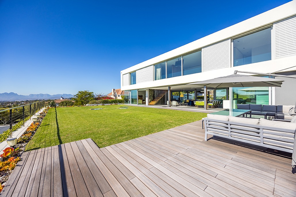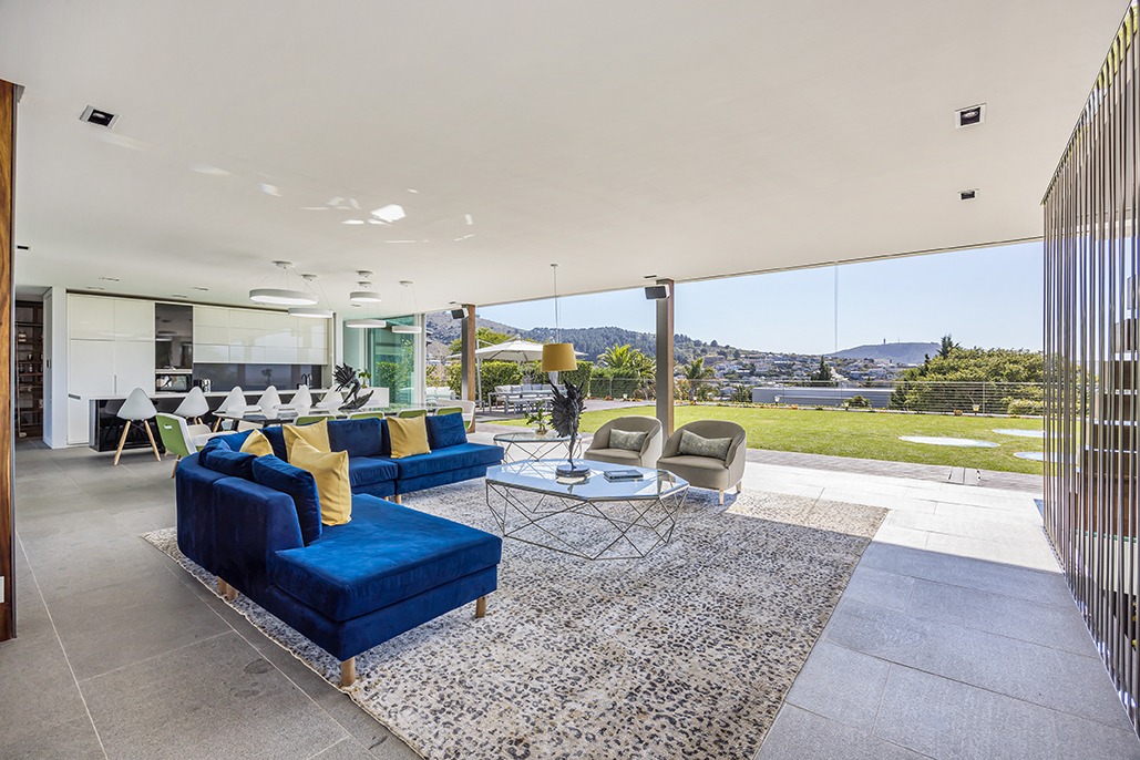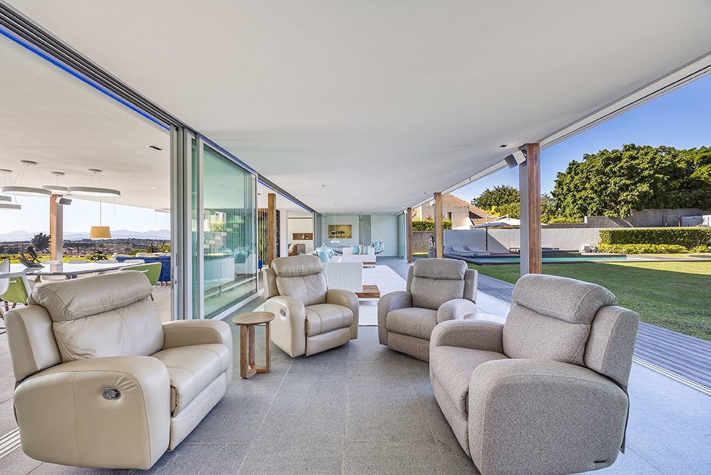 On the other side, an expansive entertainment space awaits, complete with a built-in braai, gas-grill, and surround sound system, offering the perfect setting for gatherings. This space opens up to the large garden, where your guests can enjoy the beautiful surroundings in style.
