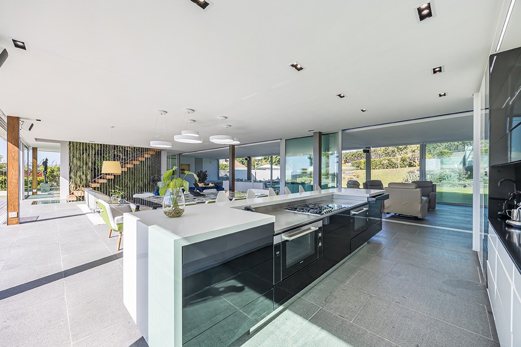 The first floor is an entertainer's paradise, where no detail has been overlooked. The kitchen is a culinary dream, featuring a massive centre island, dual Siemens ovens, integrated appliances, and abundant storage, all designed for effortless hosting. Adjacent to the kitchen, the formal dining and living areas are framed by a feature plant wall, creating an intimate yet open space that seamlessly flows to the outdoors through grand sliding doors.