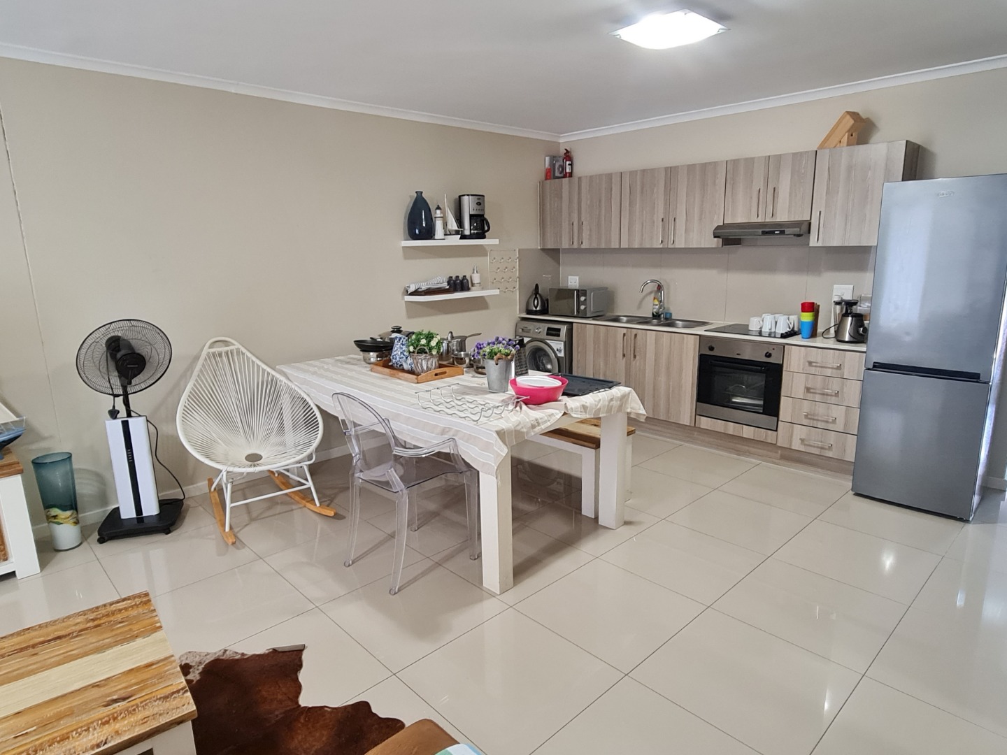 Sleek open - plan white Cesar stone kitchen tops and lounge that leads out on to your balcony for those afternoon sundowners.