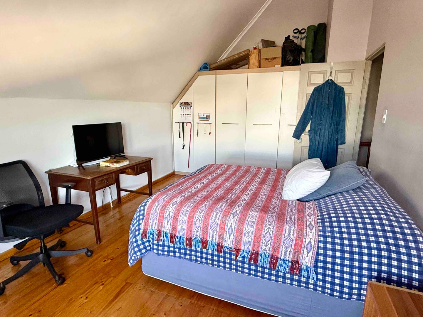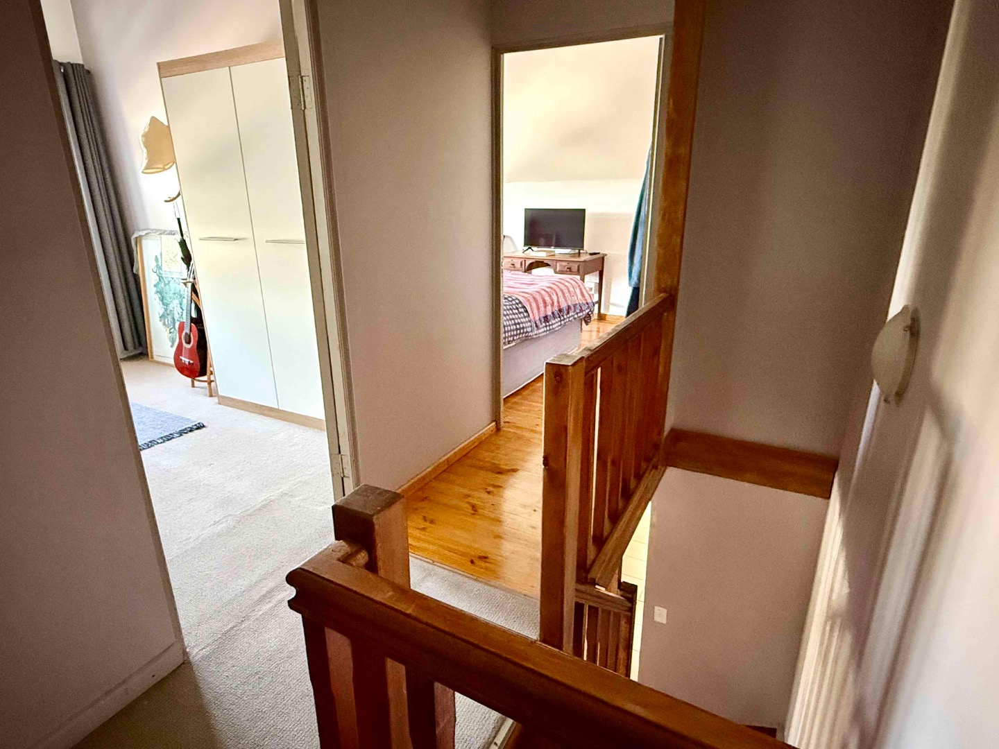 Walking up the beautiful wooden staircase to the first floor you'll find a spacious main bedroom with generous storage, along with a further well-sized bedroom featuring ample built-in cupboards.