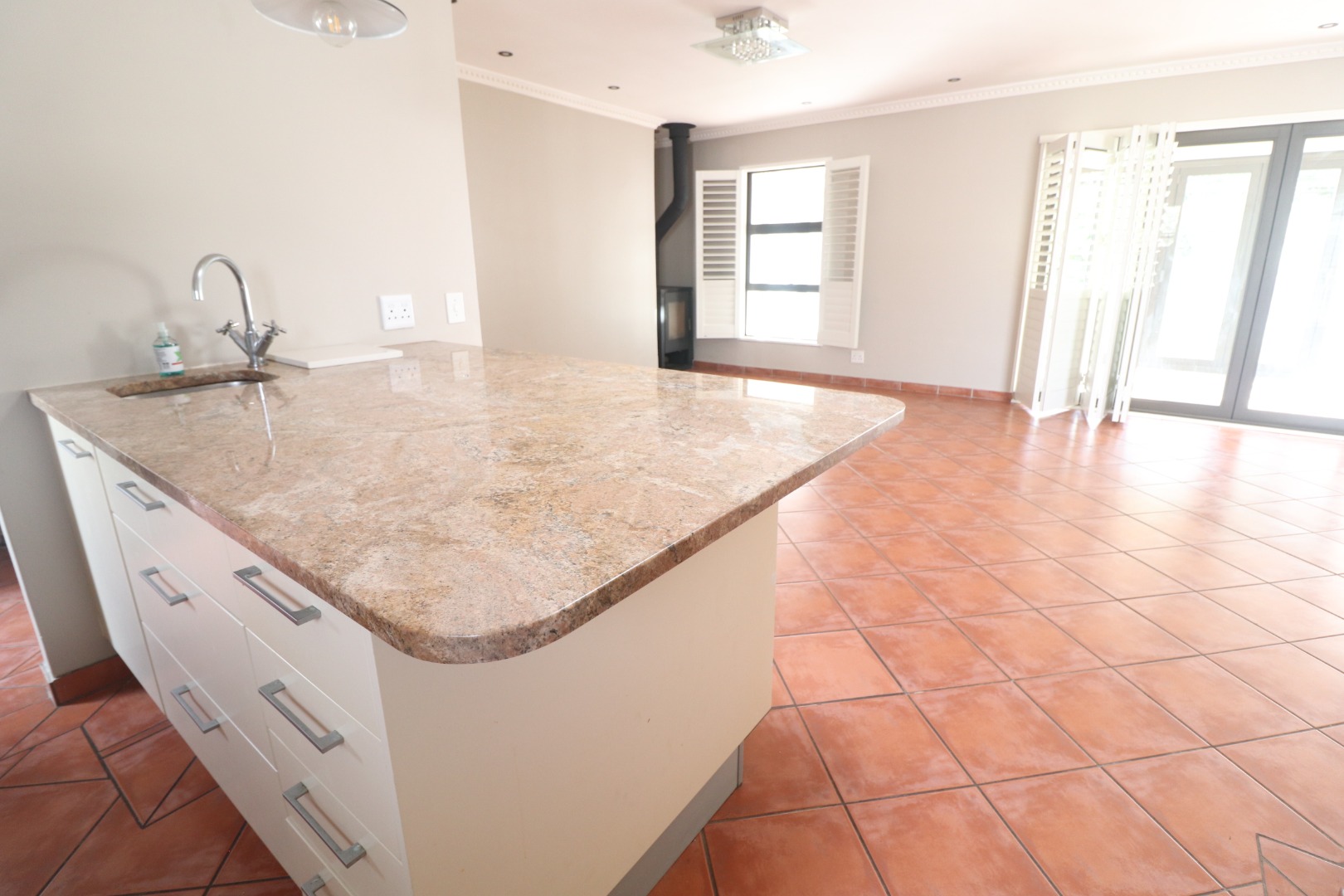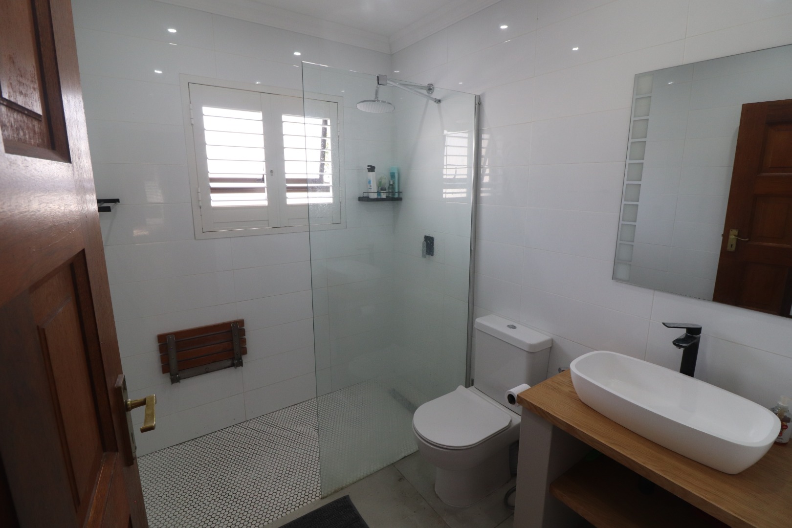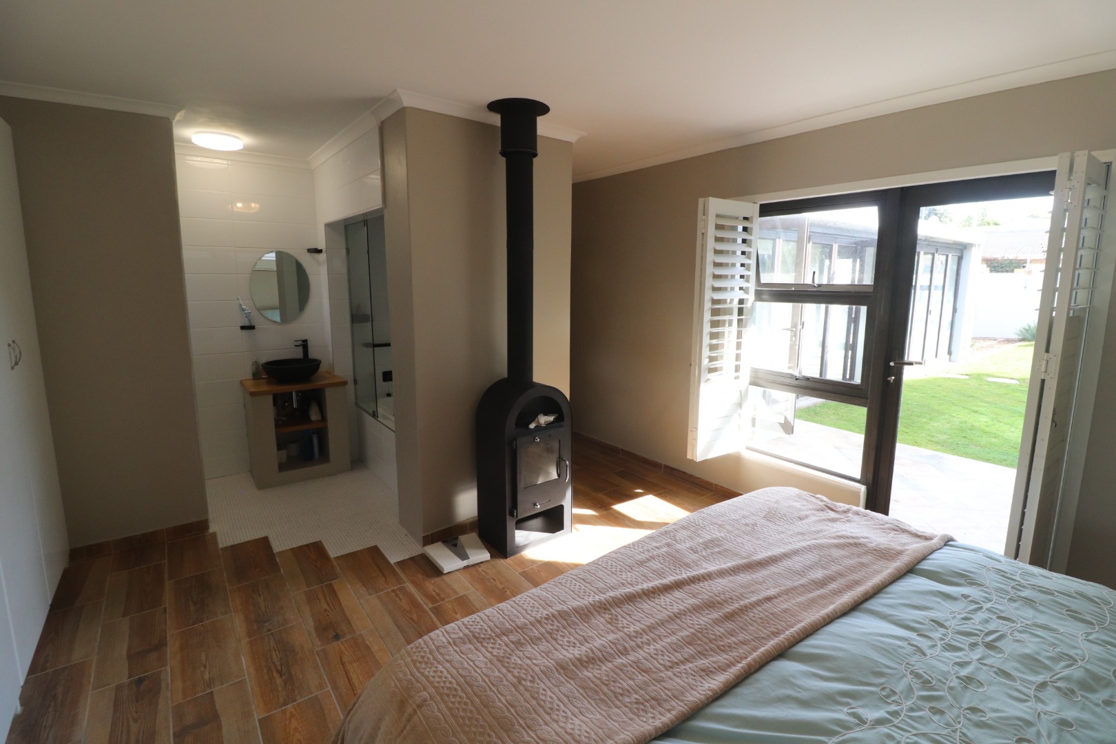 Quality American shutters are fitted throughout on all opening doors and windows, enhancing security, insulation, and climate control while adding a refined, luxurious aesthetic. The open-plan lounge and dining area is fitted with an inverter air-conditioning unit and opens onto an undercover patio that doubles as a sunroom, overlooking the manicured garden.
