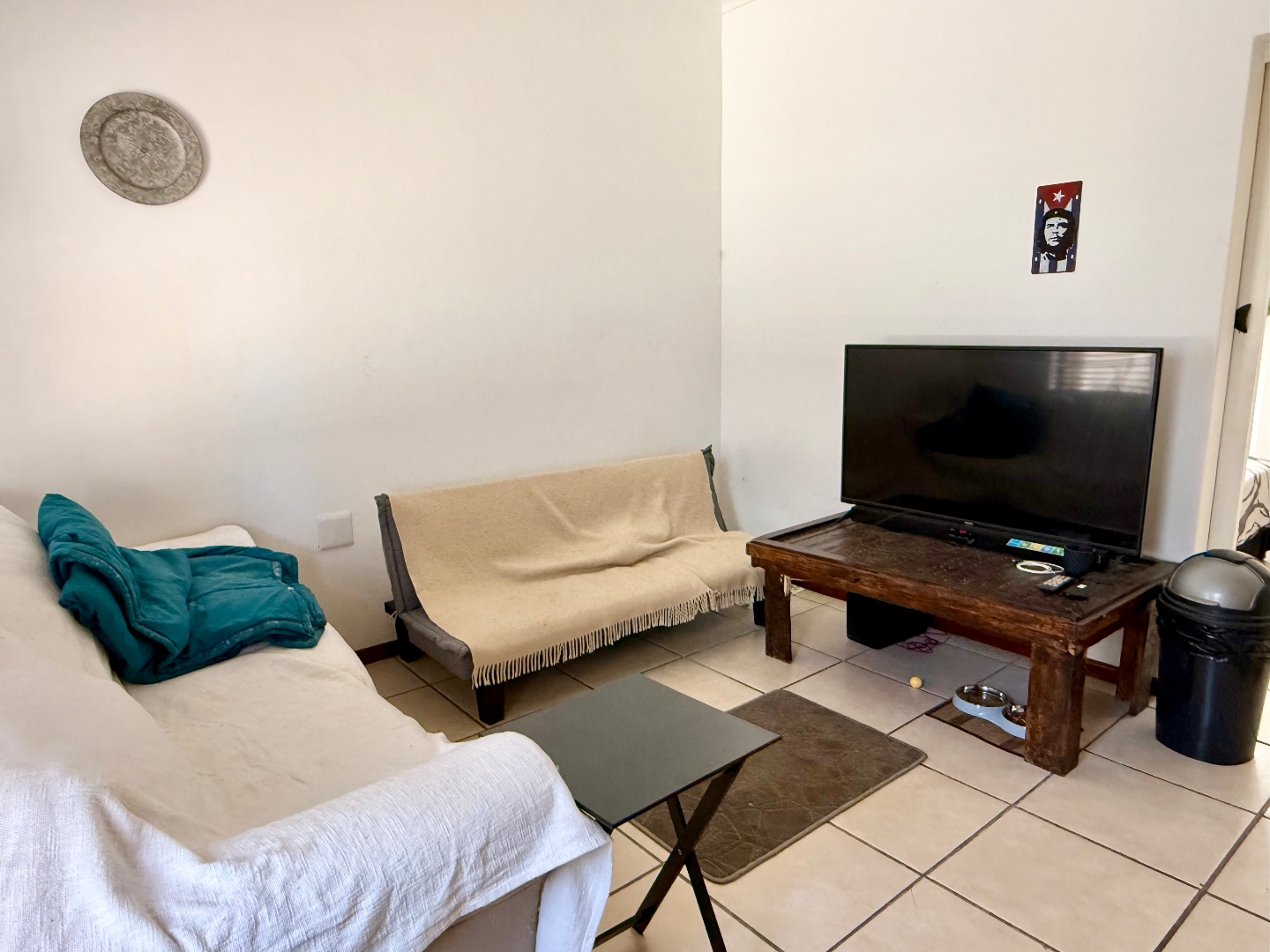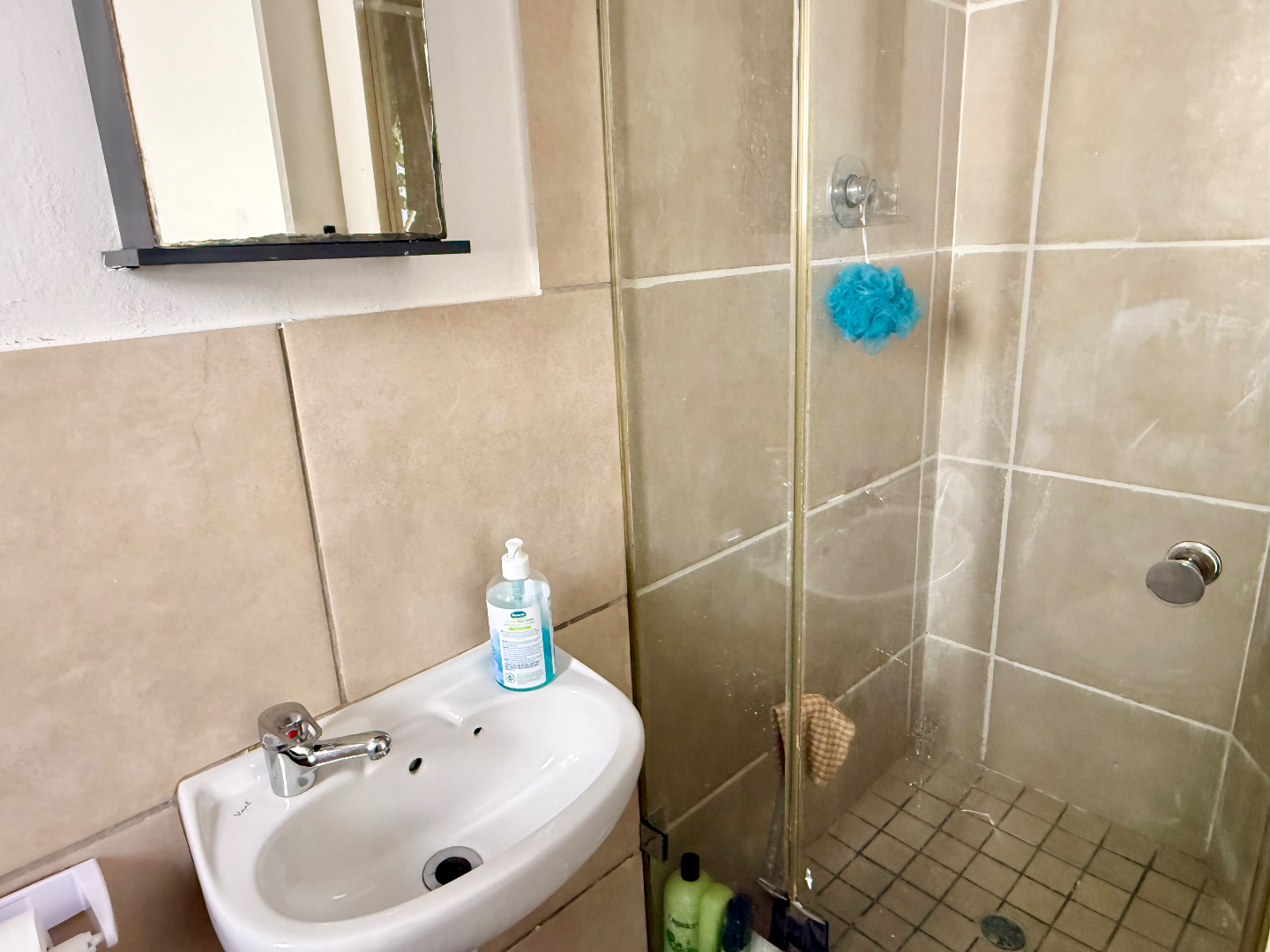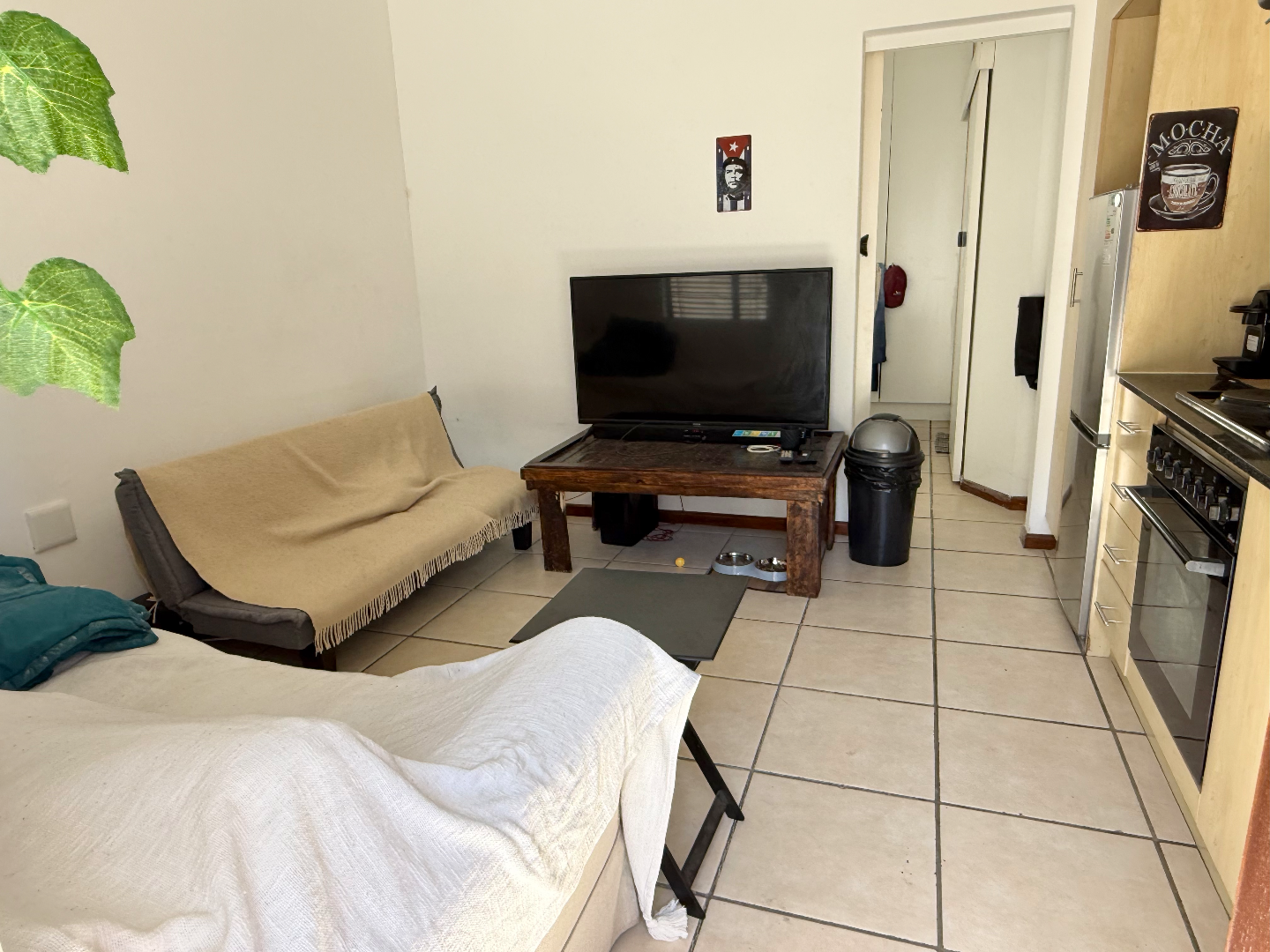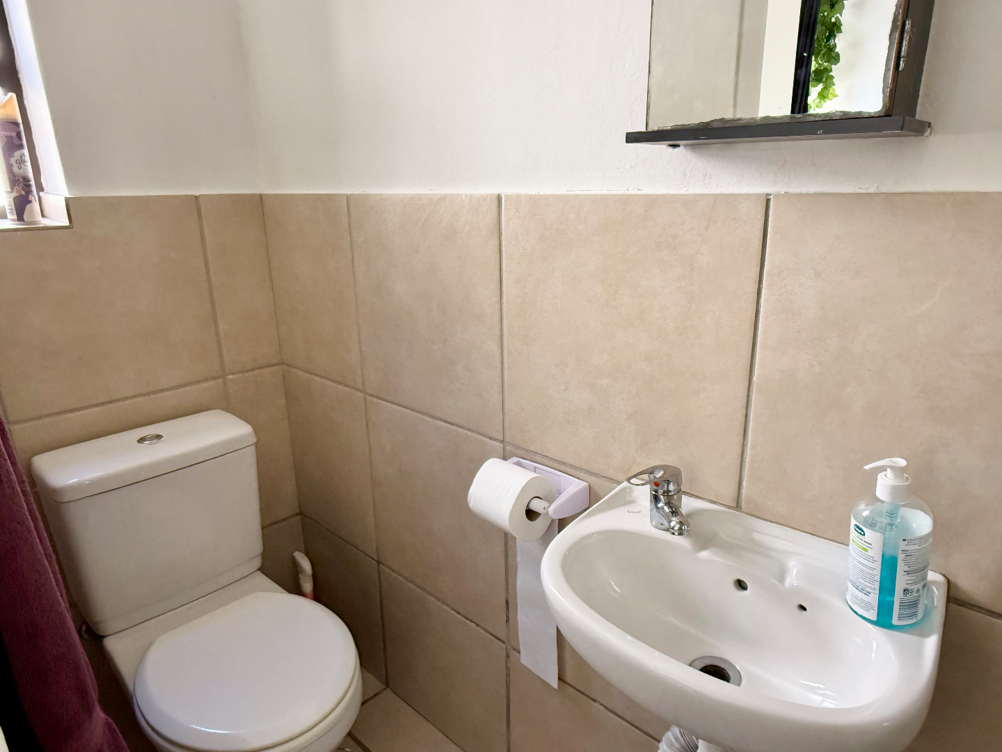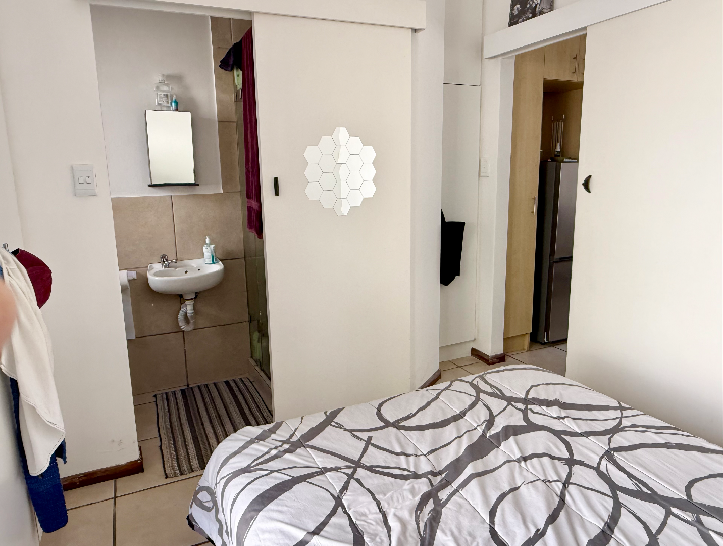 The bedroom is a snug retreat, connected seamlessly to the main living space, making the most of every square meter. The functional ensuite type bathroom with tiled walls, a wall-mounted sink, and a shower, ensuring all your daily needs are met.