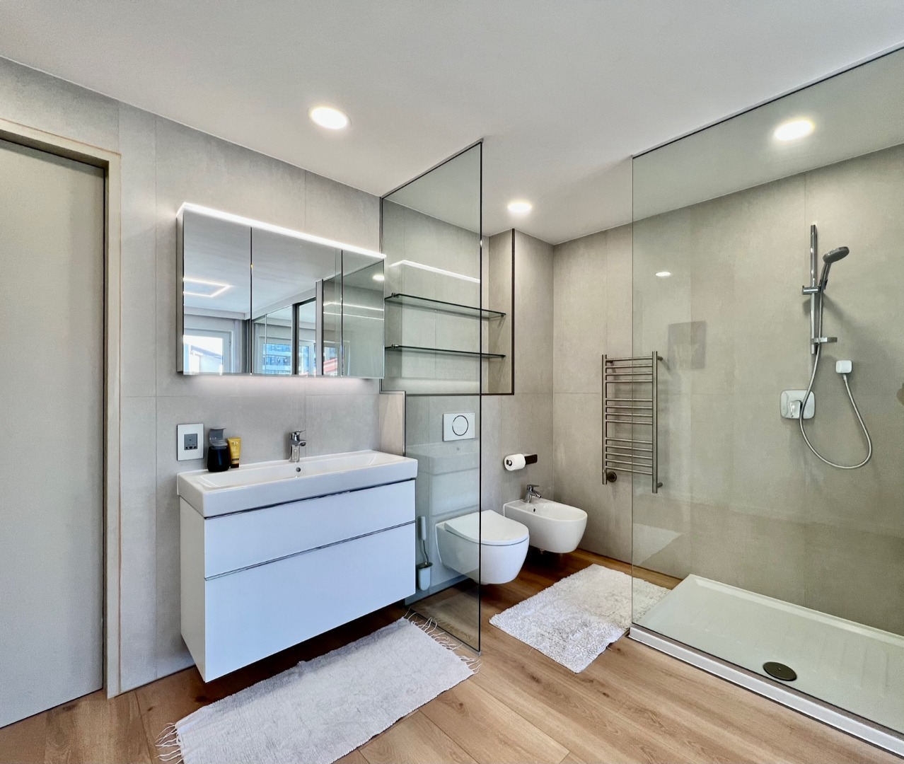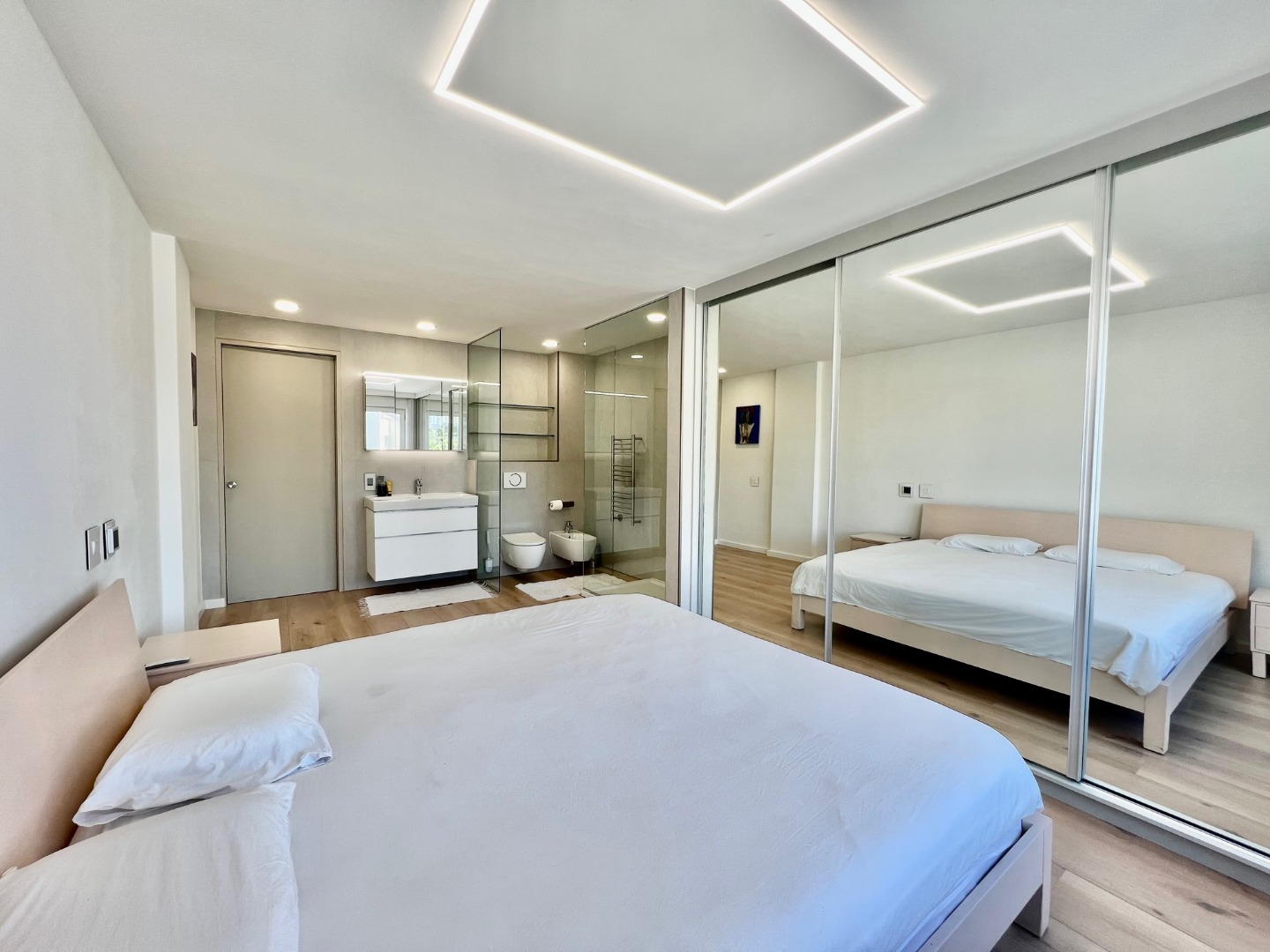 Three fabulous en-suite bedrooms featuring sliding mirror dressing cupboards, block out remote electric blinds and luxurious open plan bathrooms fitted with obscure frameless glass panels for privacy & toilets fitted with odour suction flushing system by Geberit.
