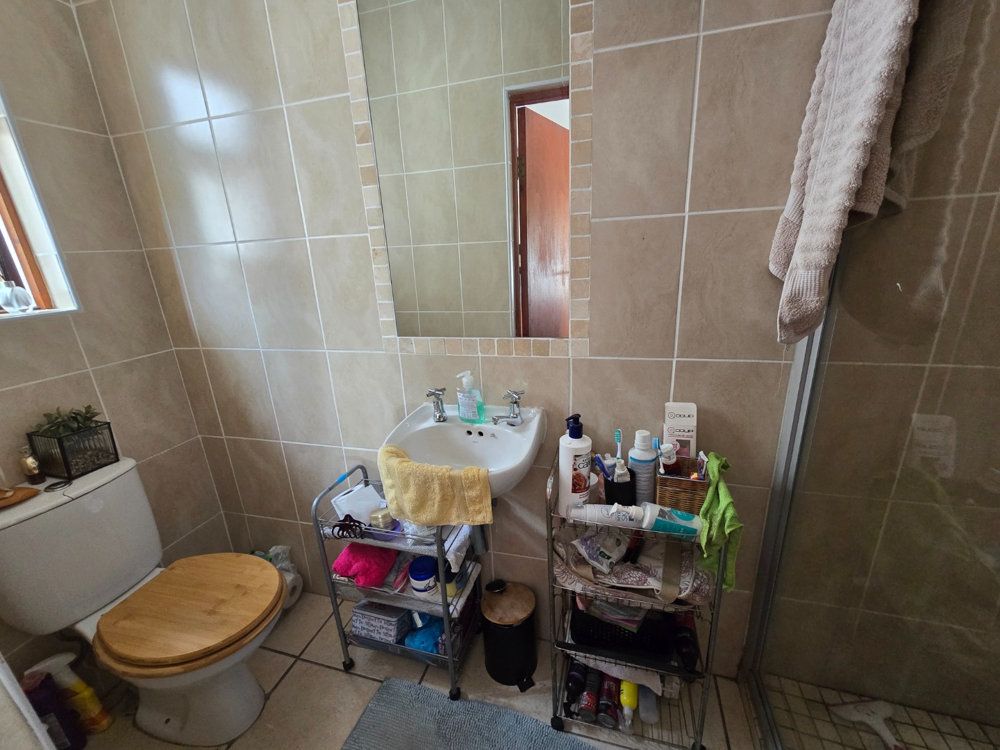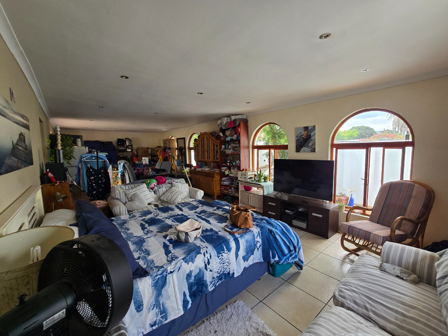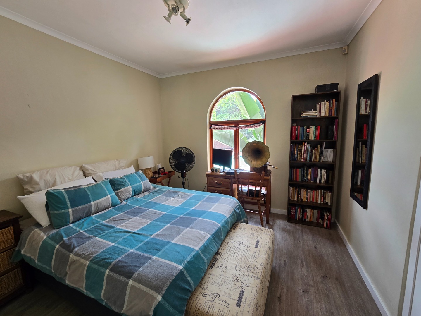 Massive (80m²) flat – completely separate from the house. This great space is light and bright and consists of a very spacious tiled open plan living room with double doors opening up onto private courtyard with fish pond and water feature. The separate bedroom is also tiled and offers double doors opening up onto the same courtyard as well as door leading to the back garden. This bedroom room is en-suite and consists of a shower, basin and toilet. This could very easily be a large home office with boardroom!