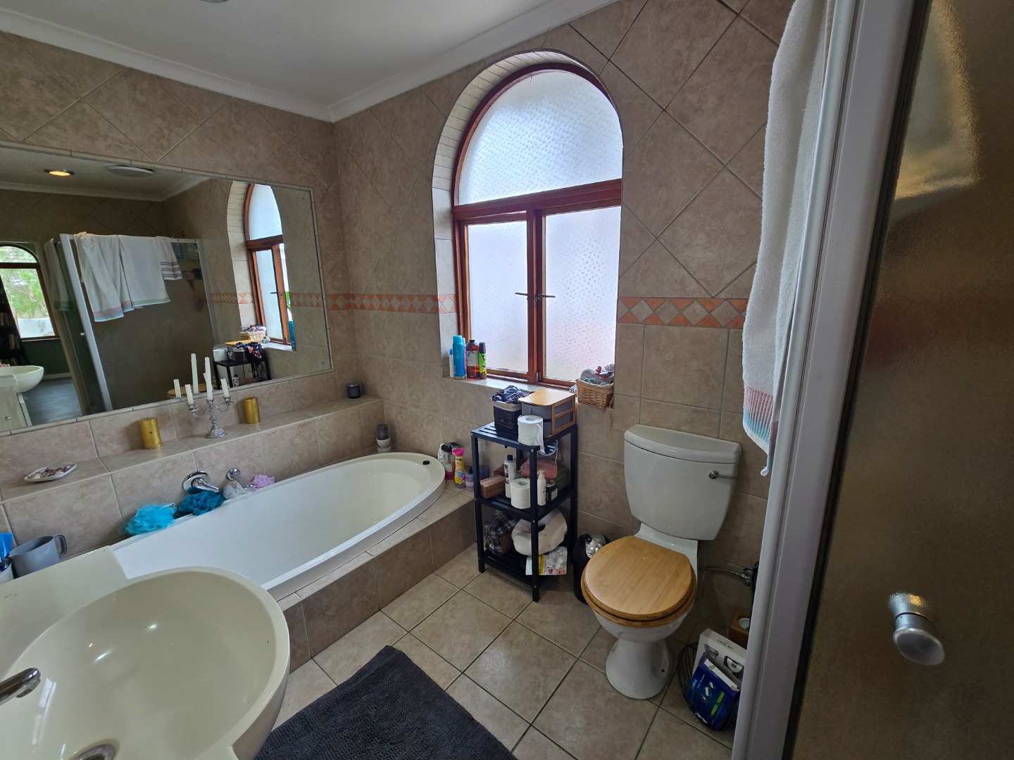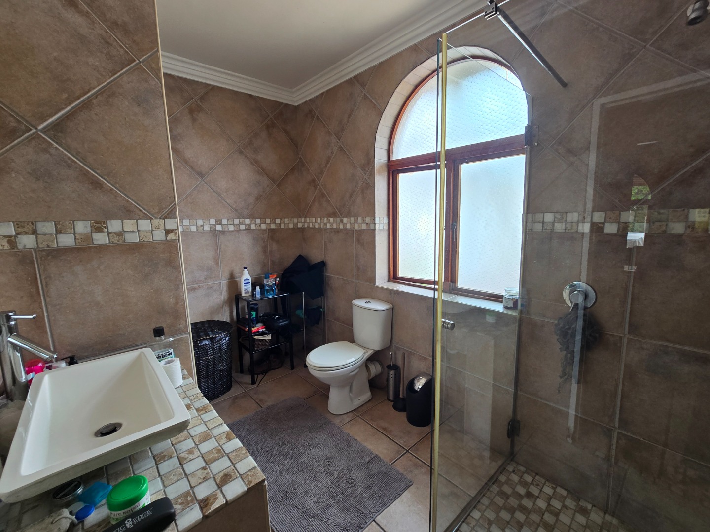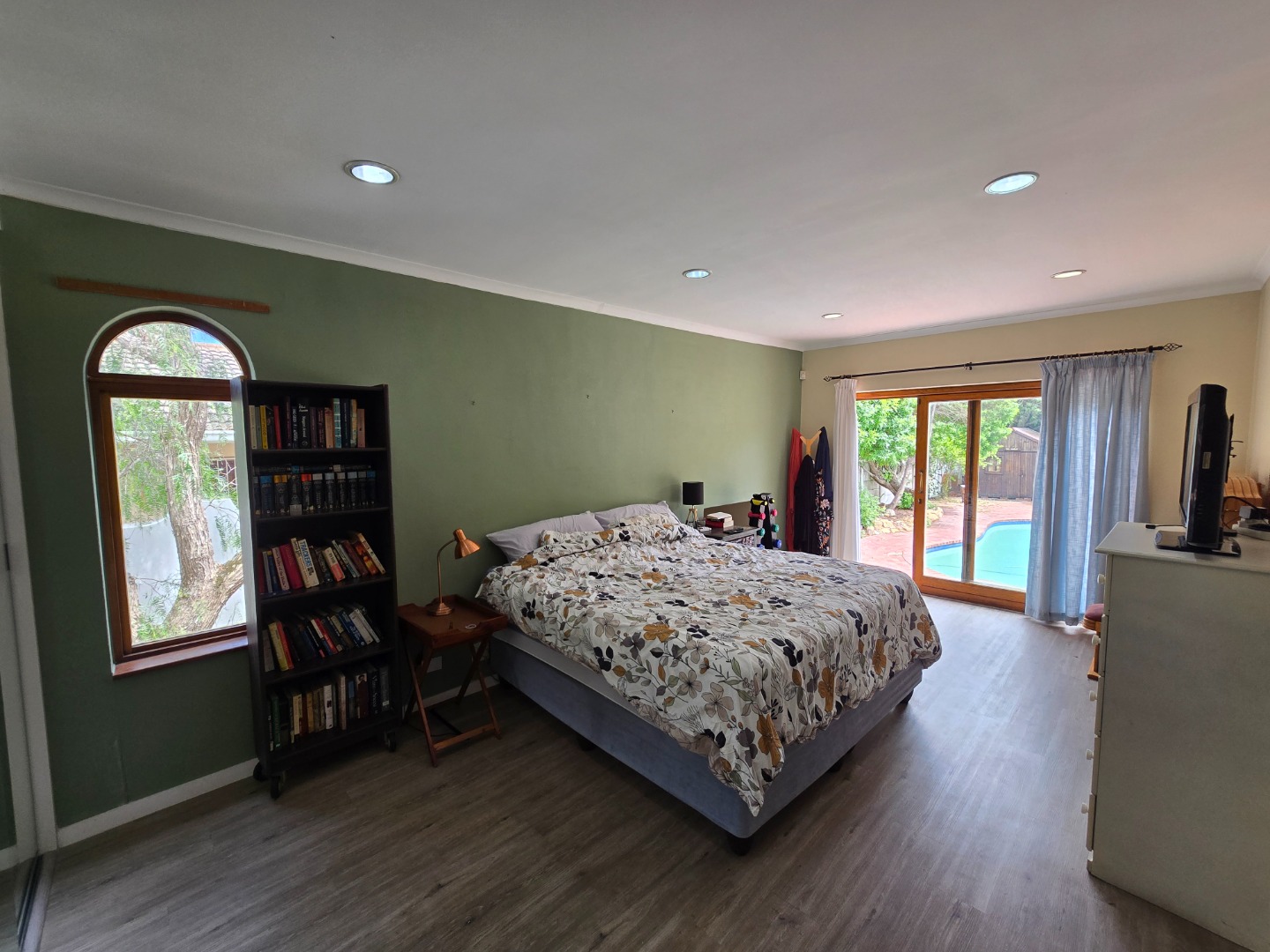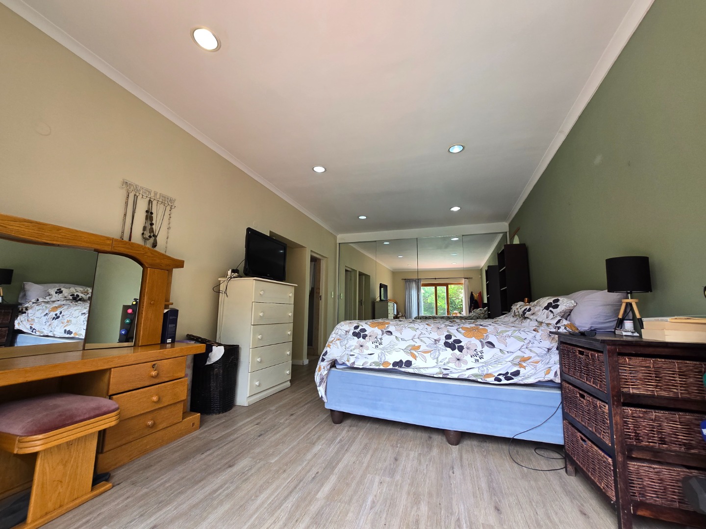The main bedroom is luxuriously sized and finished with laminated flooring. The cupboards are fitted with sliding mirror doors and sliding doors opening up onto the pool and garden. The main en-suite consists of a large shower, bath, basin and toilet.