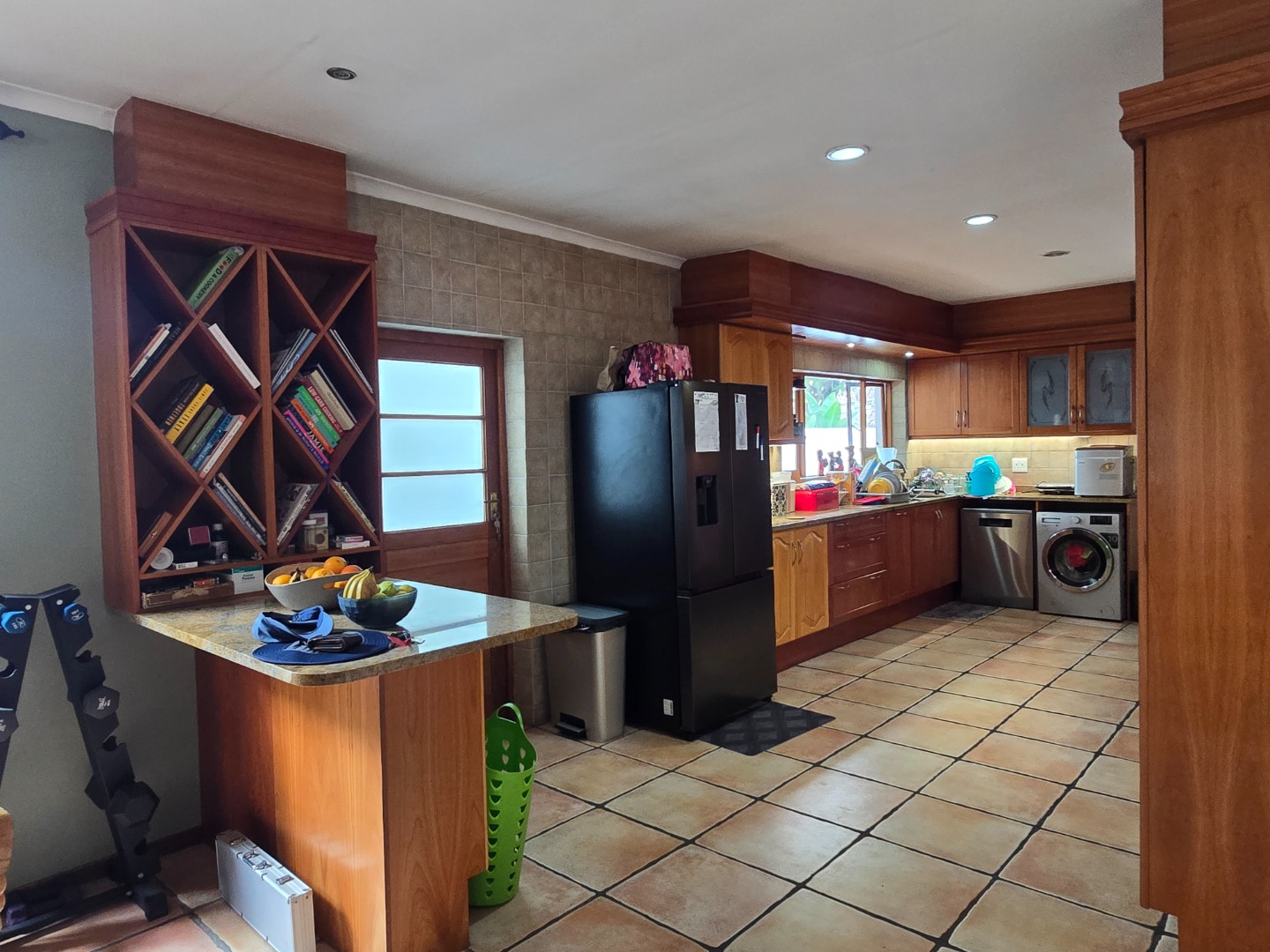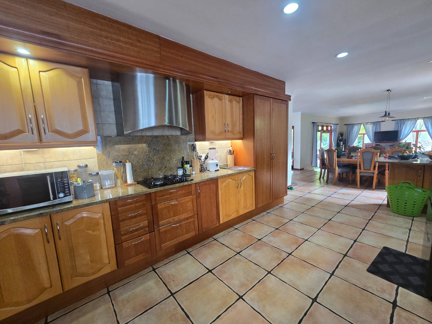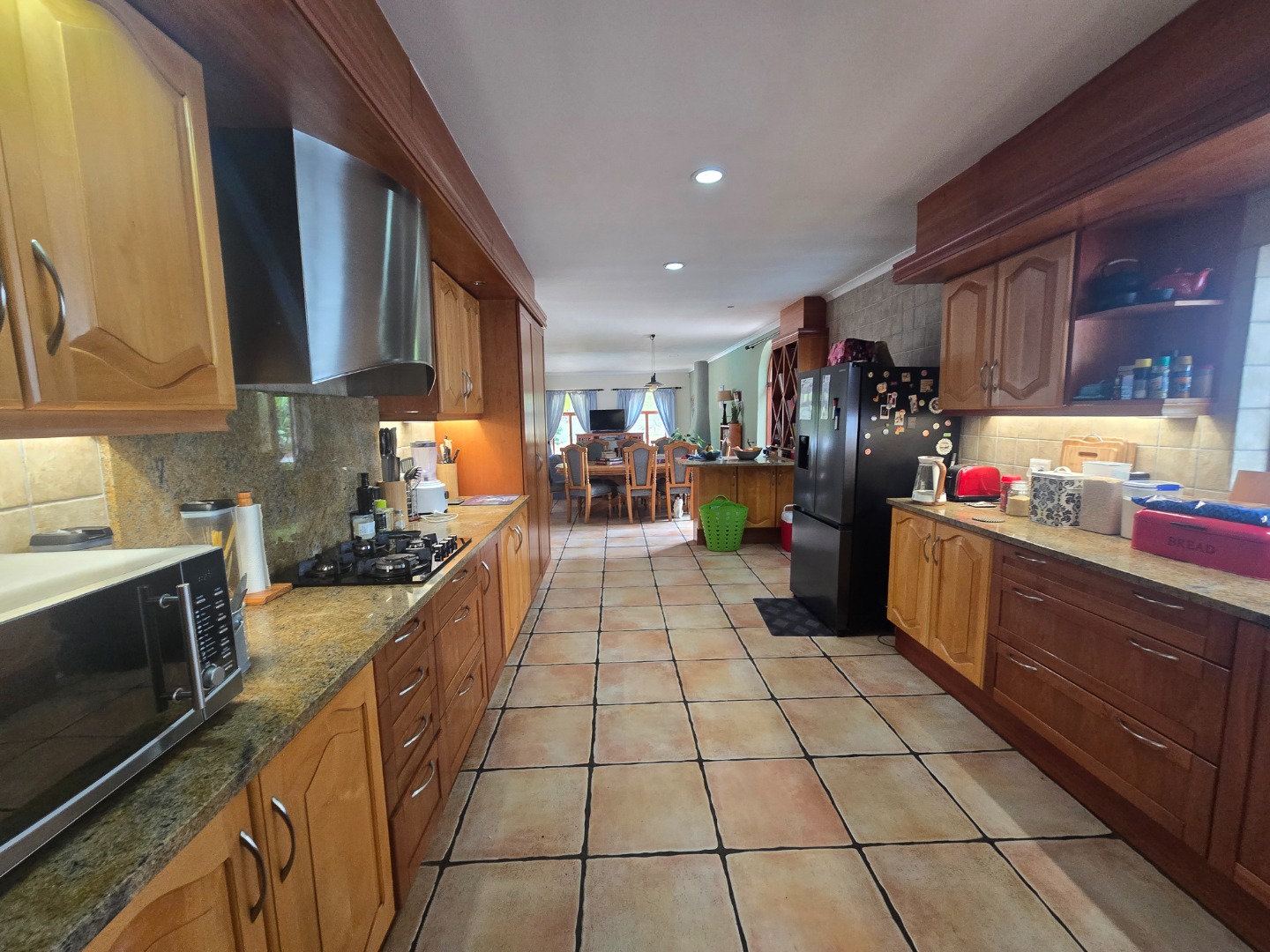 Very spacious open plan kitchen finished in Cherrywood and Yellowwood with granite tops and fitted with gas hob, integrated microwave, eye level oven and extractor fan finished in stainless steel. Ample built-in cupboards and plumbing and space for two appliances.