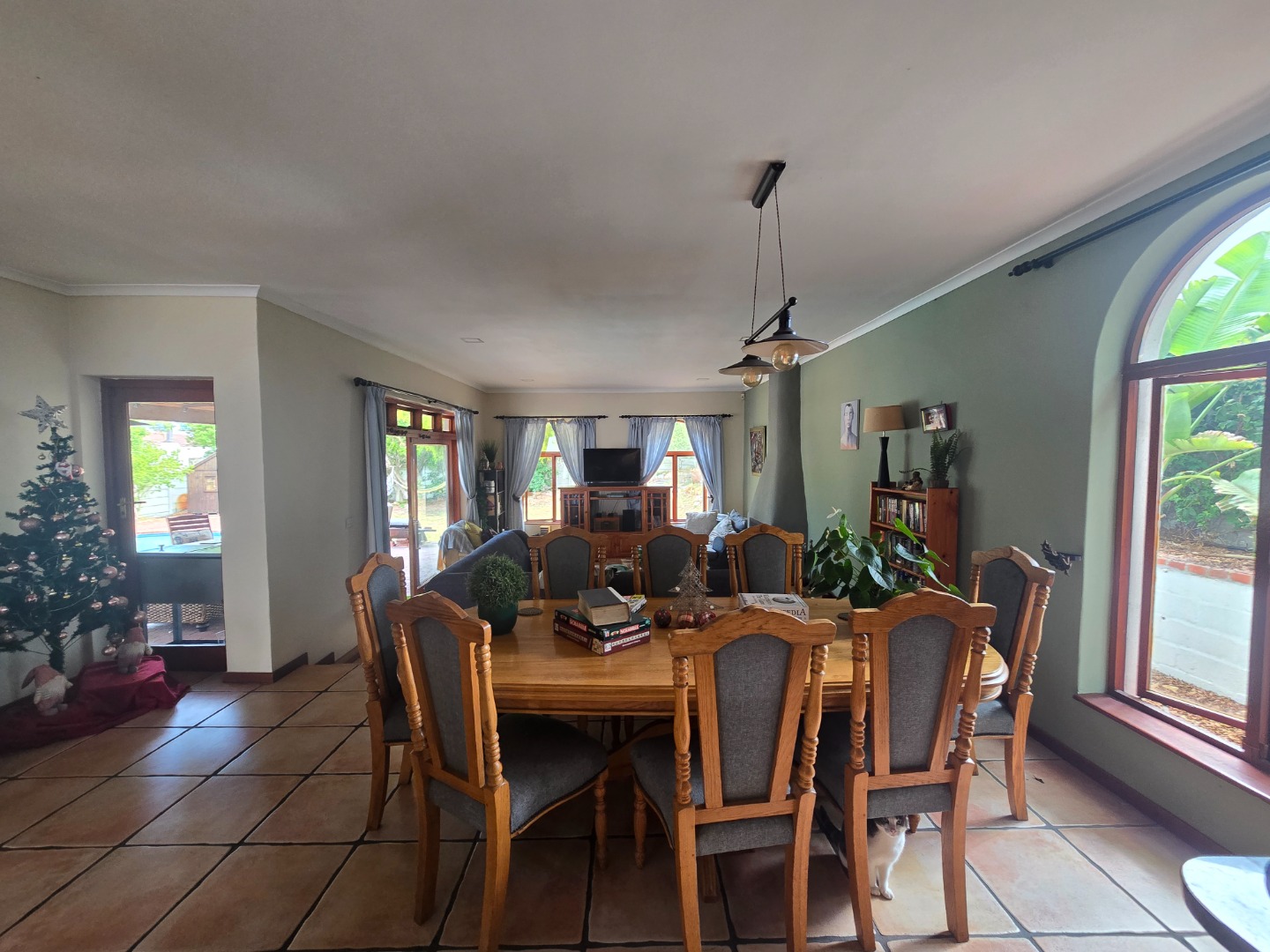 On entering this private home you are welcomed into a paved courtyard with fish pond and water feature. The tiled entrance hall leads into a very spacious open plan diningroom with door leading out onto patio, and lounge with slow combustion fireplace. Sliding doors open up onto a large sheltered, covered patio overlooking the tree filled garden and sparkling pool.