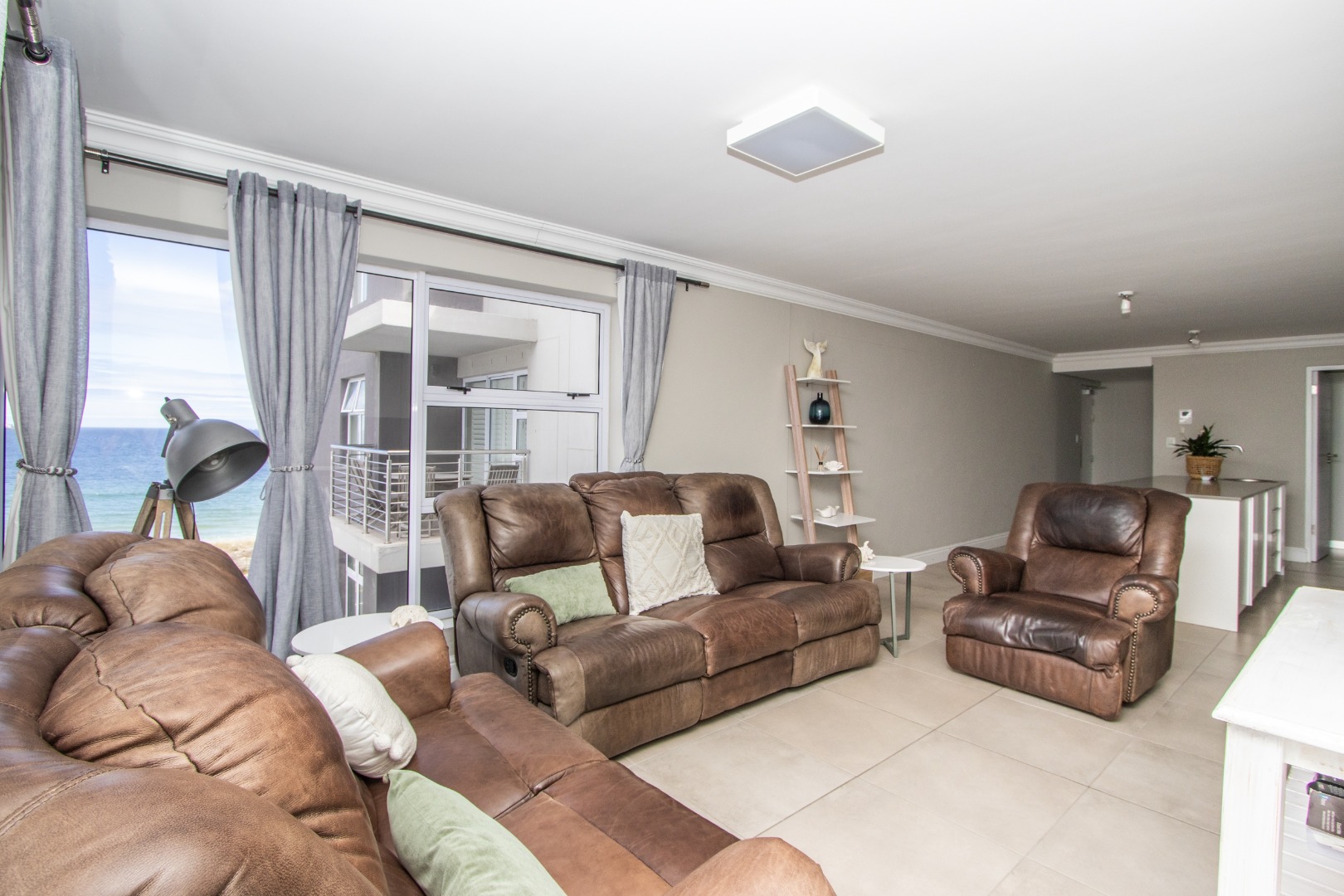 Discover an unparalleled coastal lifestyle within this exquisite 109 sqm residence, perfectly positioned in the vibrant Bloubergstrand. This modern apartment, nestled within a secure front-row, beachfront complex, offers a sophisticated sanctuary with partial sea views that captivate from the moment you arrive. The open-plan design seamlessly integrates the living, dining, and a contemporary kitchen bathed in abundant natural light from expansive sliding doors. The kitchen is a culinary delight, featuring sleek white cabinetry, a stylish island with seating, and a distinctive teal backsplash, ideal for both intimate gatherings and grand entertaining.
