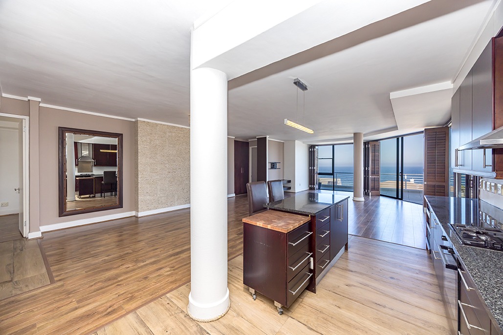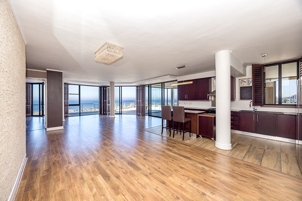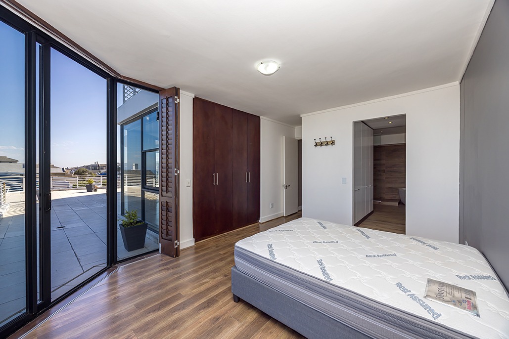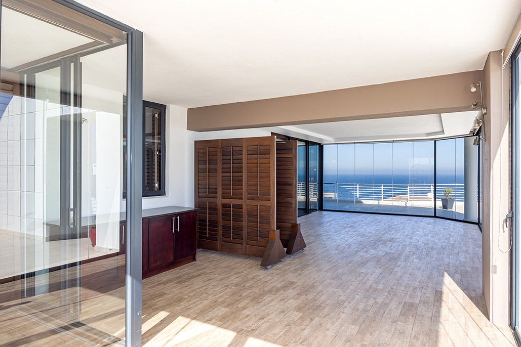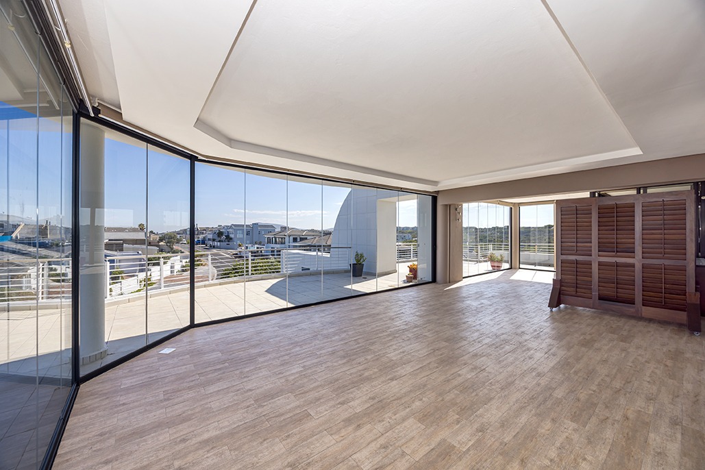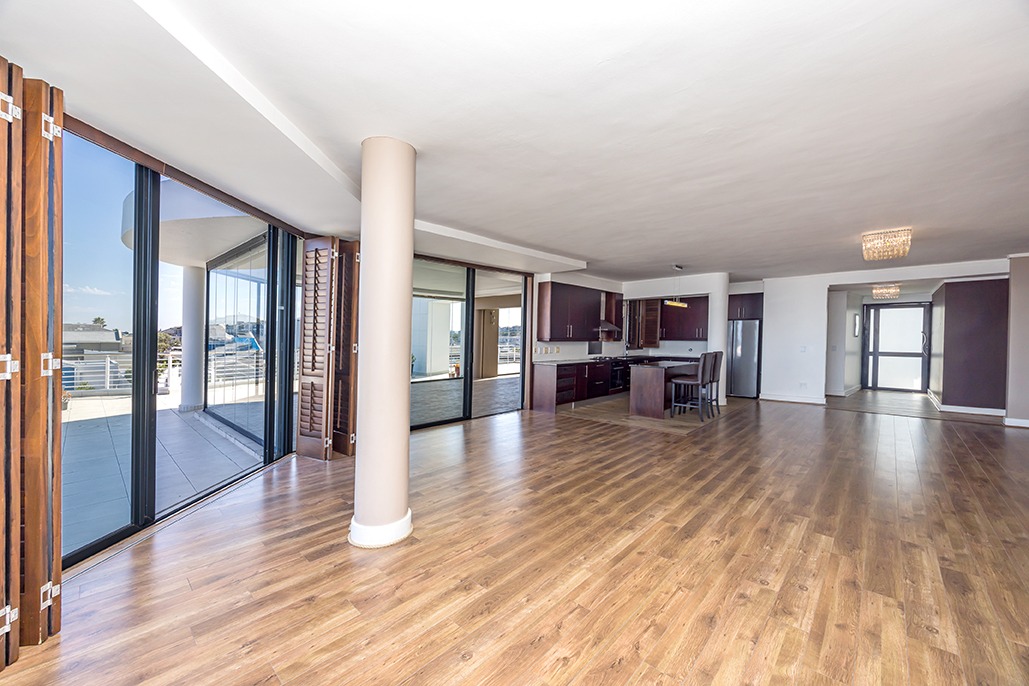 Located in a highly desirable apartment complex in bloubergstrand Village is this unique north side top floor apartment * Move in ready condition and renovated in warm, romantic and inviting tones * Boasting generously sized living areas leading onto north facing wrap around 216sqm balcony, over 60sqm has been fully covered and enclosed with fold back doors allowing all year enjoyment which soaks up scenic Table Mountain, Atlantic Ocean and Robben Island views * The stack doors also have automated blinds to close up when needed * The kitchen is fitted with Black granite and mahogany solid spray doors and centrally located for easy entertaining – who wouldn’t want to cook with a view * Master suite is located on the seaside offering walk through dressing area and en-suite bathroom * Two additional bedrooms each have their own en-suite bathroom and there is a separate guest cloakroom for visitors at the front foyer * The apartment has been fitted with dark wood shutters throughout allowing for adaptable sun control * Three under building parking bays & 1 storeroom * This boutique sized apartment complex of 27 is known for its superb location, security accessed foyer with lift and excellent overall security * Apartment complex also supports our 24hr dedicated Blouberg Patrol community initiative