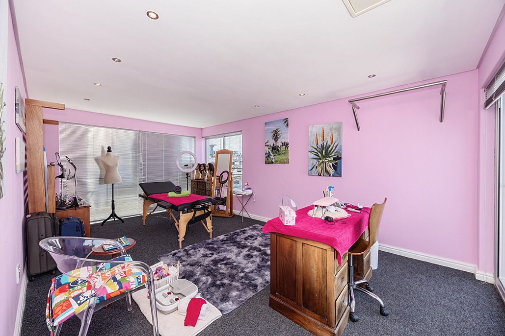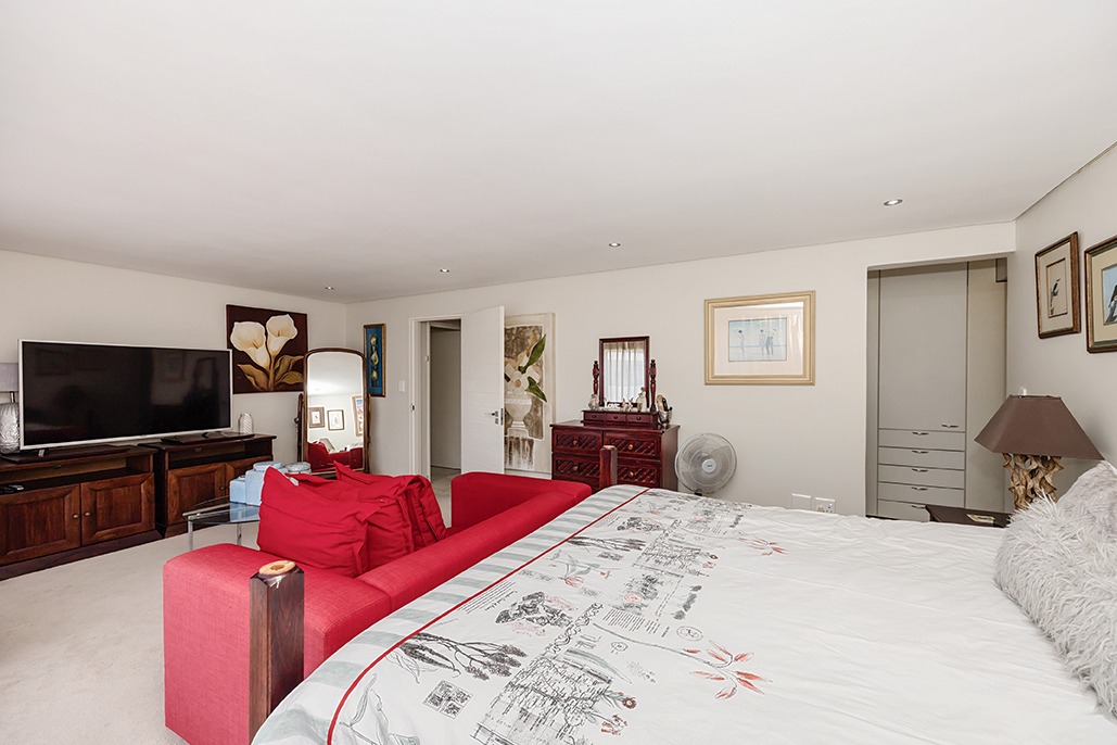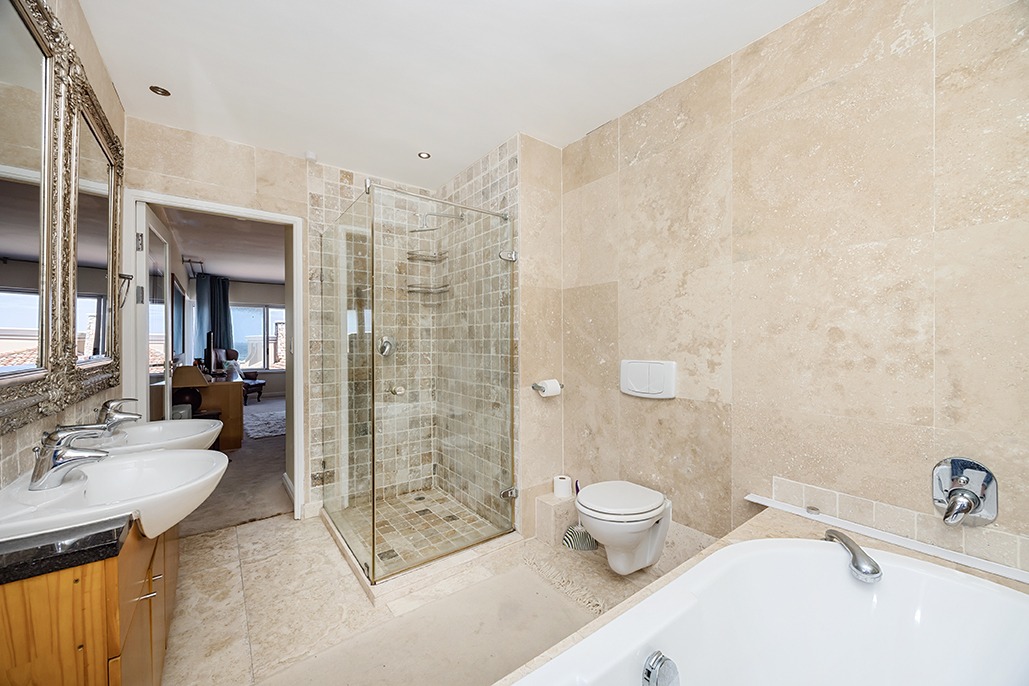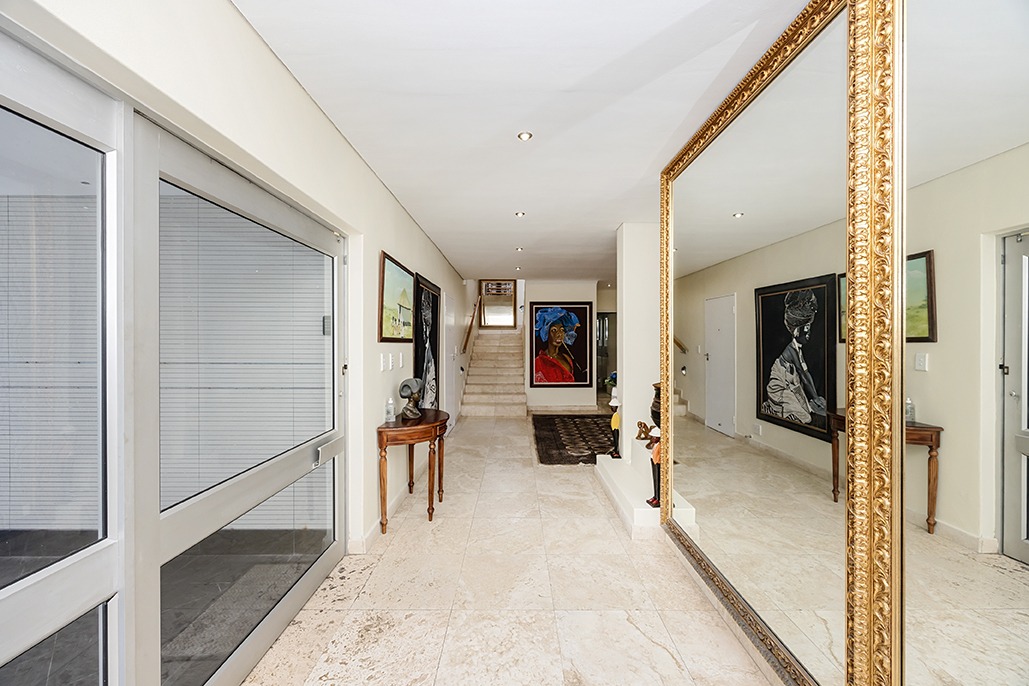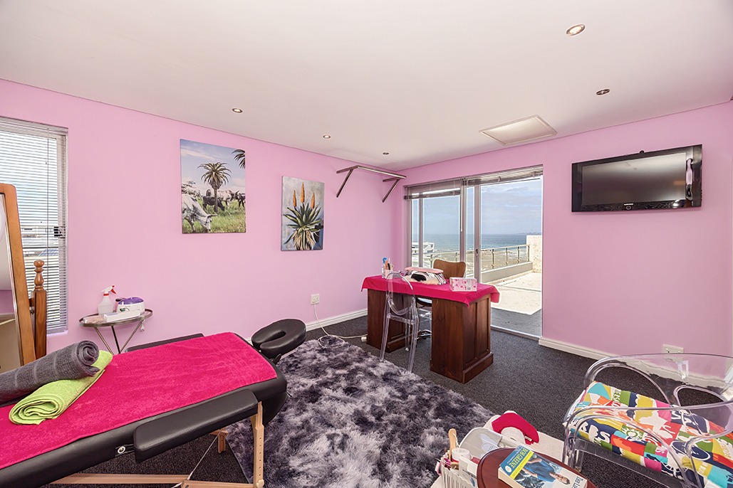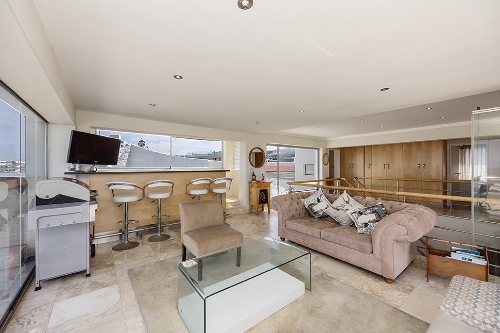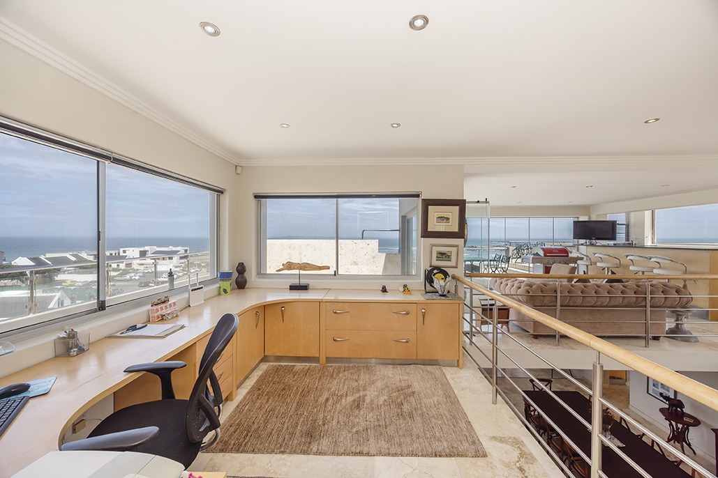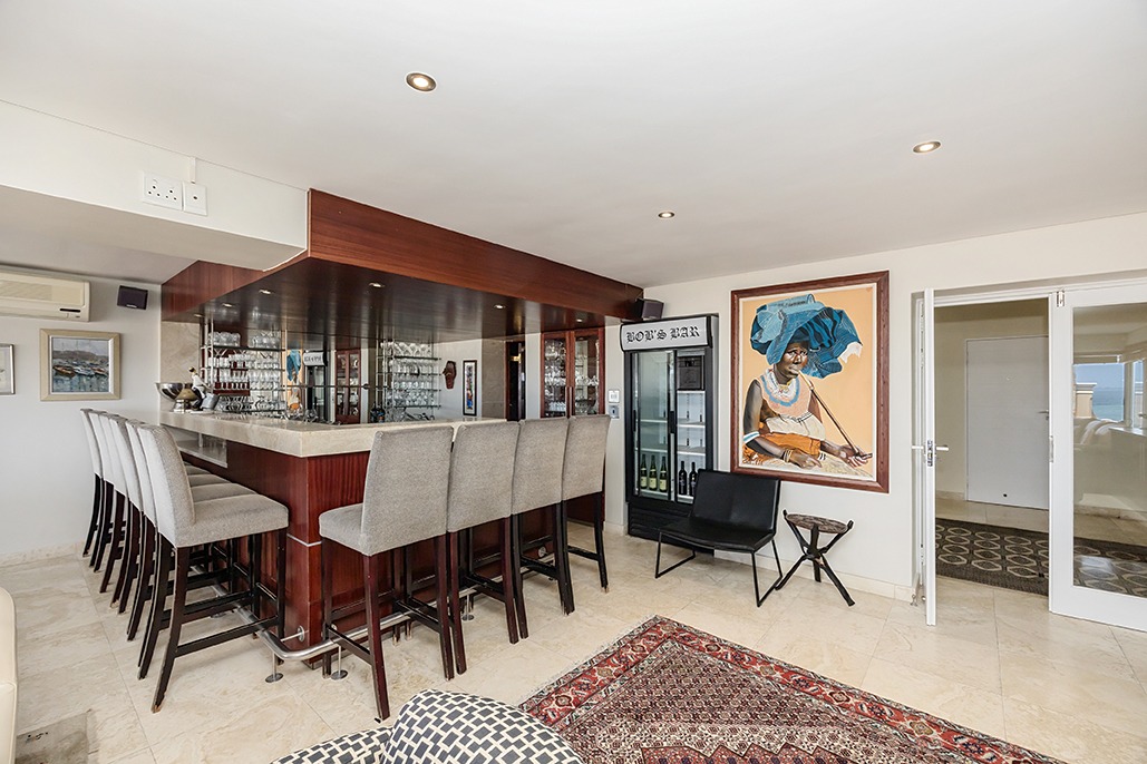 3rd floor, comprising the 4th bedroom with Ensuite shower bathroom and 5th Bedroom/Gym room, both rooms leading out to sea facing balconies. The passage along this area also offers fitted cupboards that runs the length of an entire wall. Open plan Study with built-in desk and mountain views . Also, 3rd entertainment area with a cozy, private pub and lounge. This area flows out through sliding doors to a huge wrap around, open air patio and swimming pool with interrupted views.