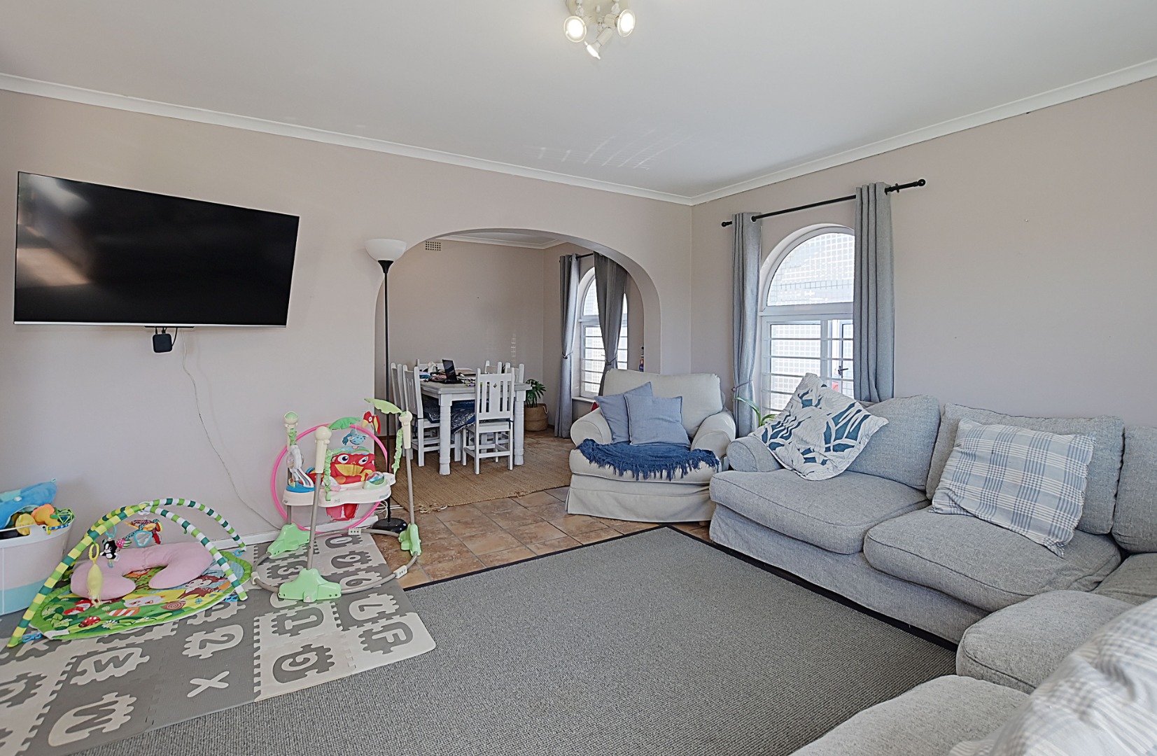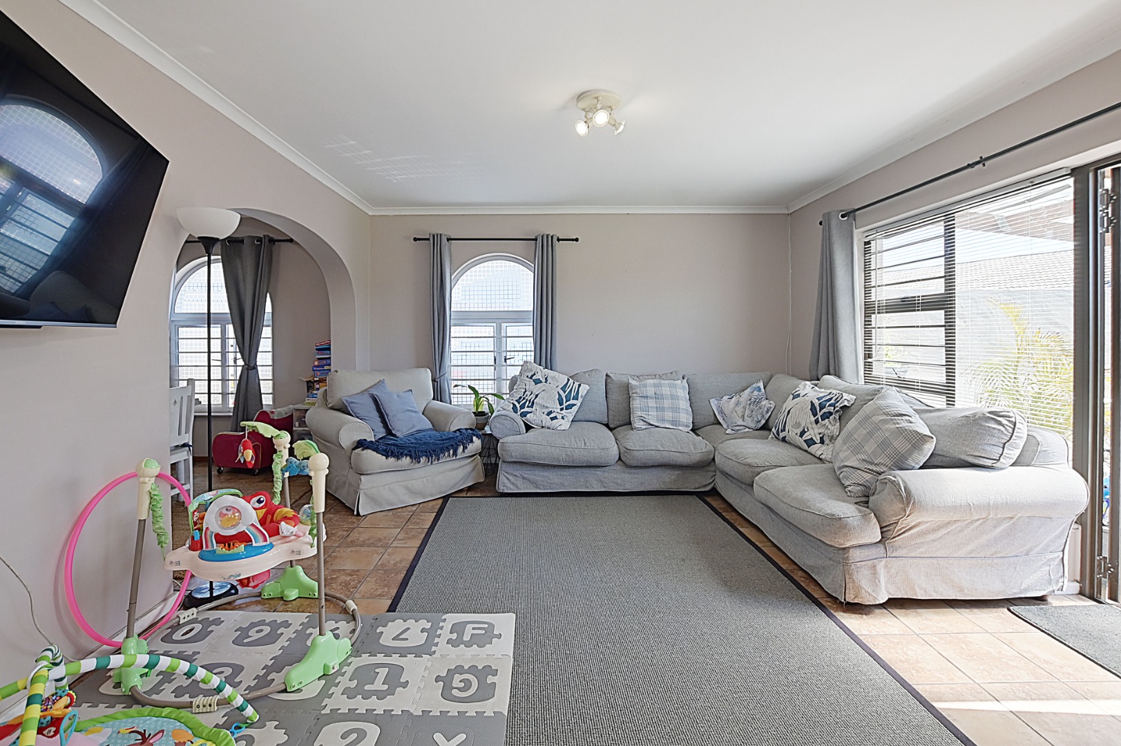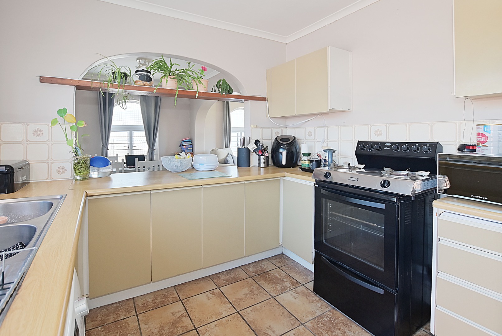 The spacious tiled lounge and dining room create a comfortable living space that flows effortlessly out onto a paved patio with a built-in braai area, ideal for entertaining and family gatherings.