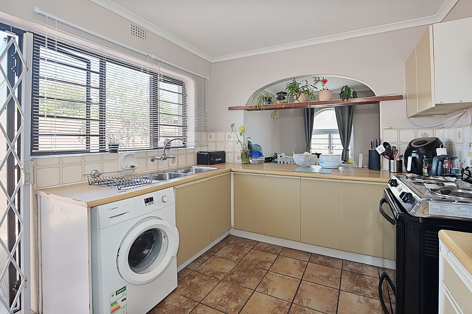 The kitchen offers ample built-in cupboards and plumbing for appliances as well a freestanding stove. The kitchen door opens onto a paved drying yard secured by a safety gate.
