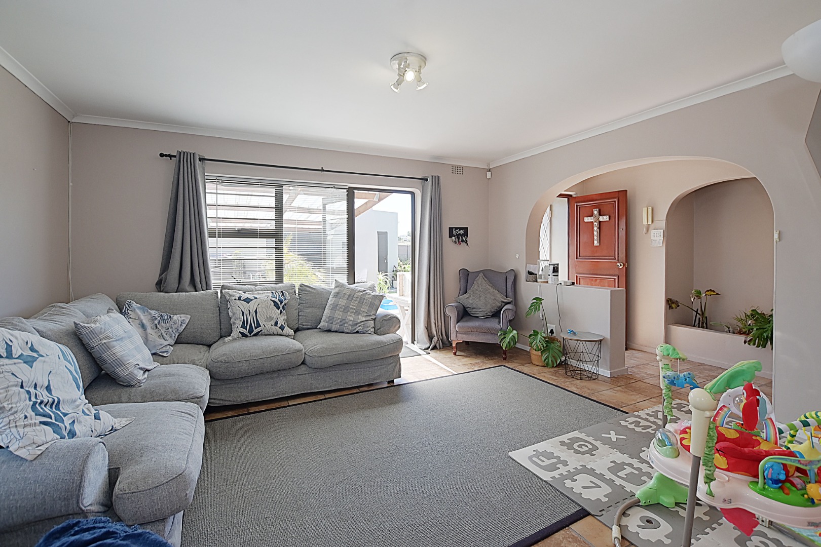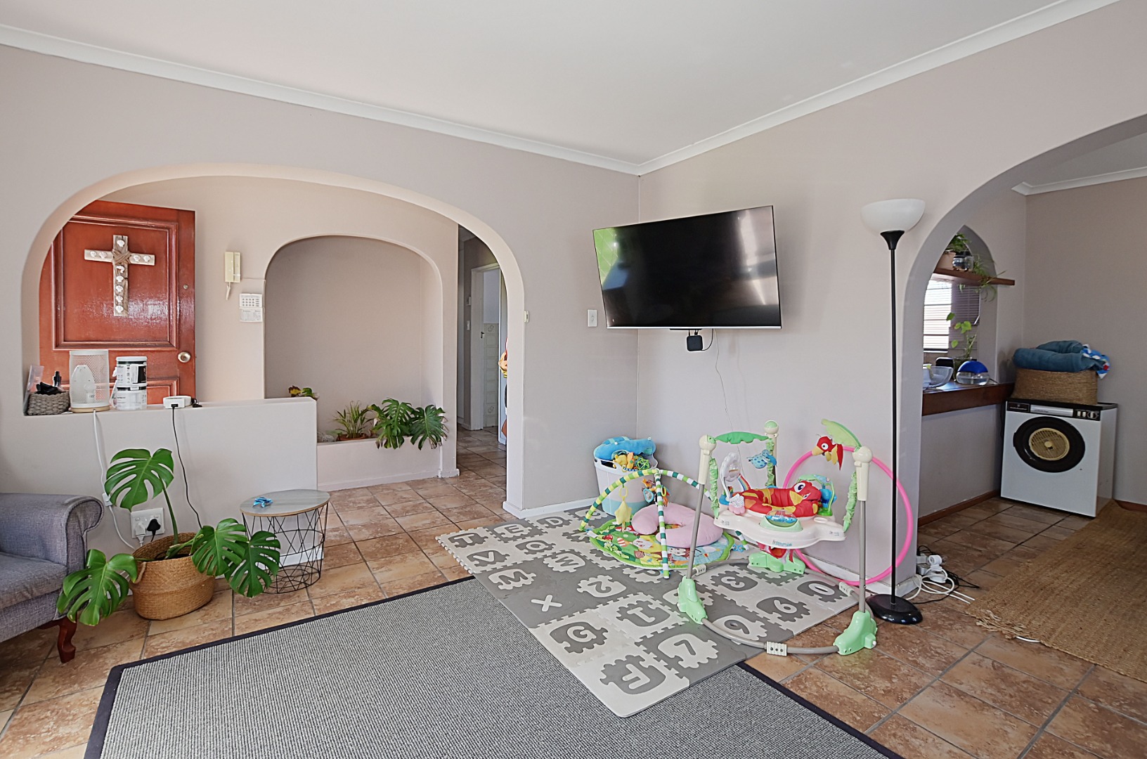 The entrance hall features a built-in planter and a security gate on the front door, providing both style and safety.