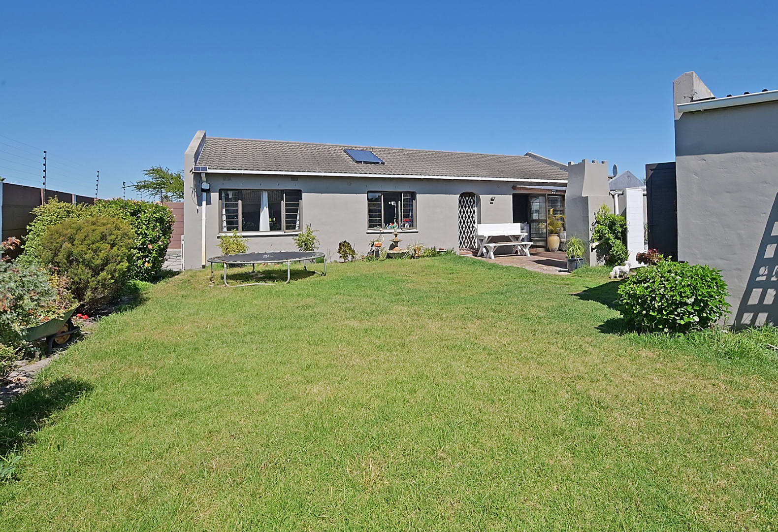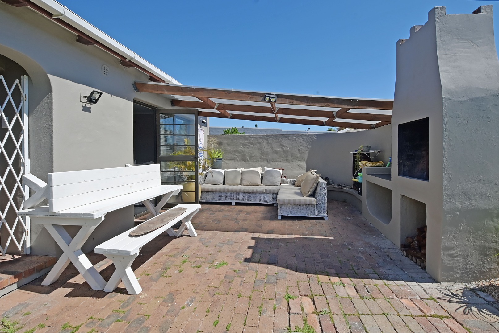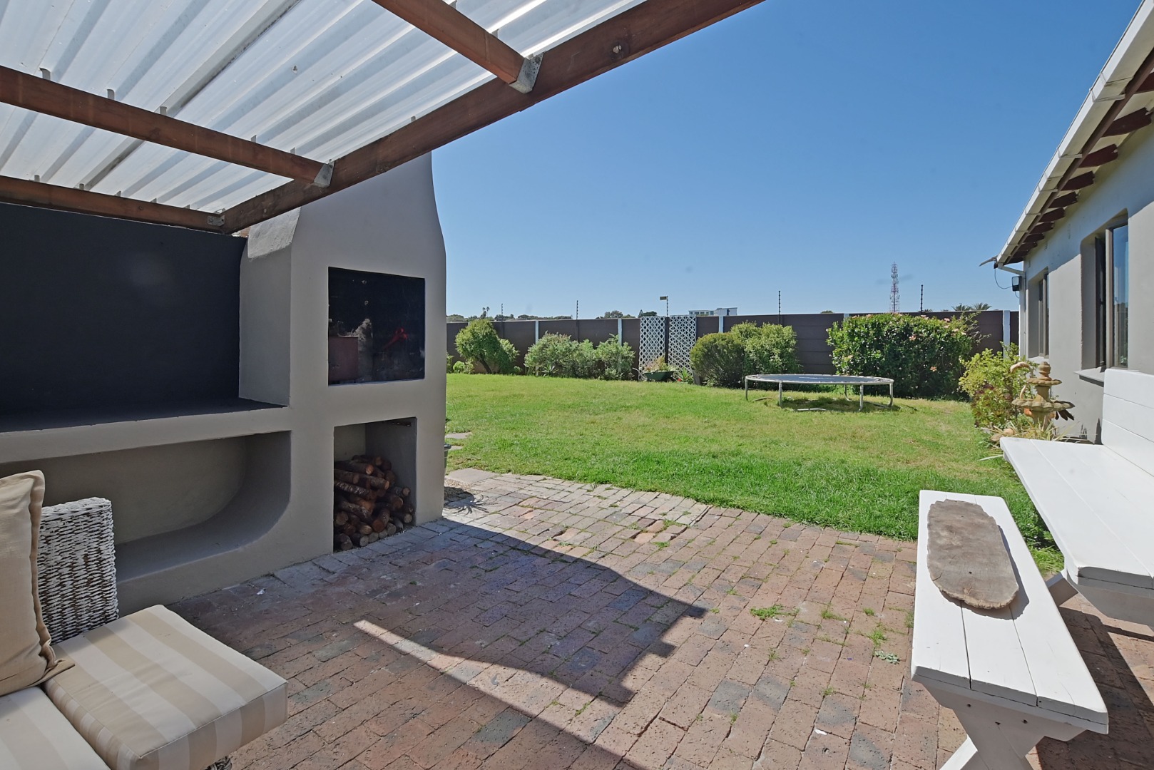 Outside, the lovely patio with its pergola and built-in braai area offers a perfect space for outdoor living and relaxation. The garden is established and lush and offers loads of space for kids or pets to play. There is also a borehole, which ensures a lush beautiful garden all year round.