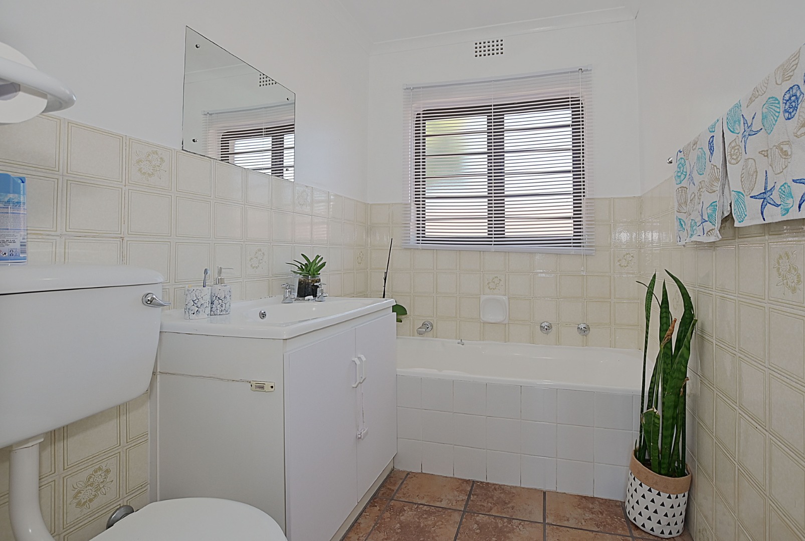 The family bathroom is offers a bath, basin, and toilet.