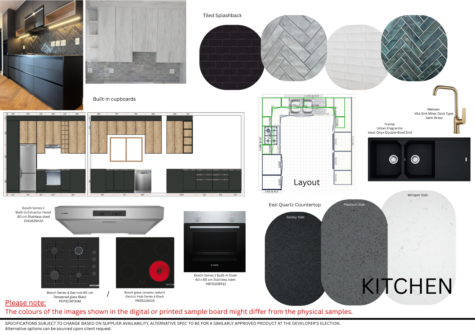 The kitchen will offer a range of top & bottom built-in cupboards, finished in grey, with tiled splashback and stone countertops. Gas or glass hob, with Bosch built-in oven.
