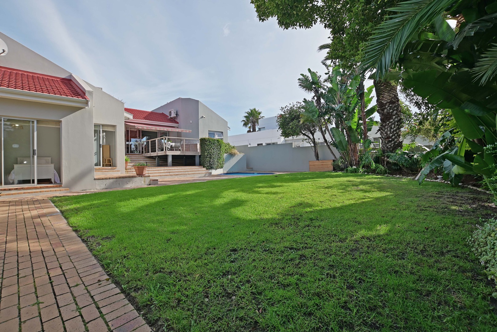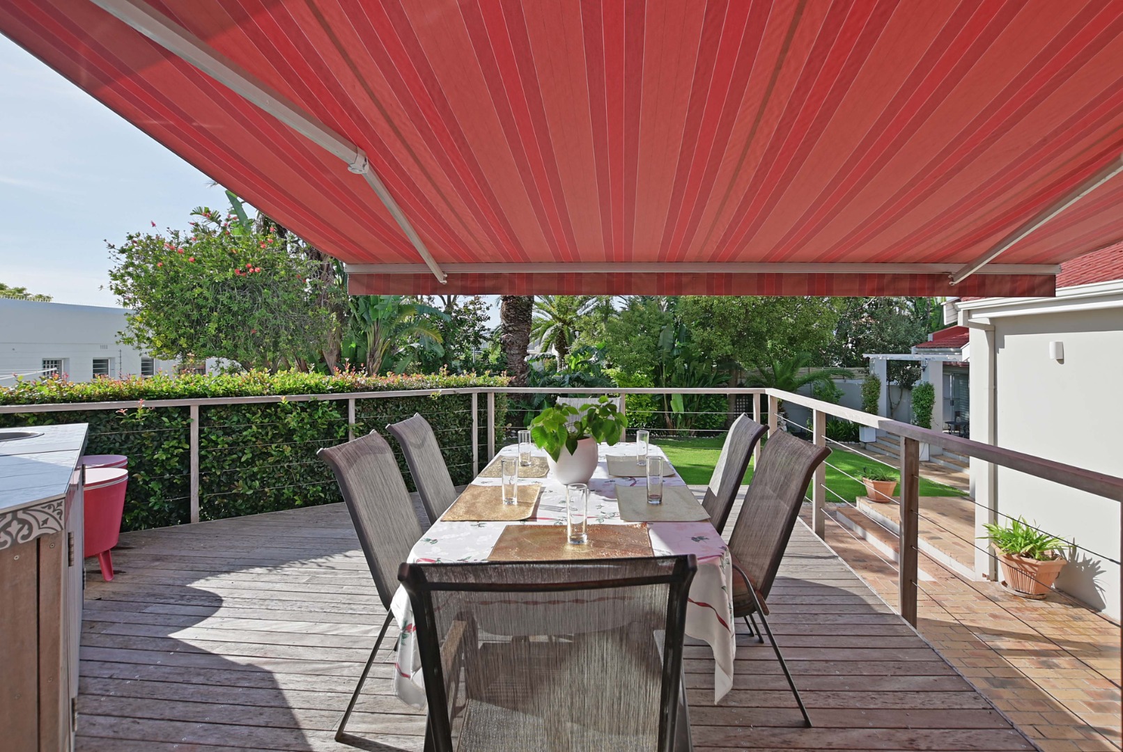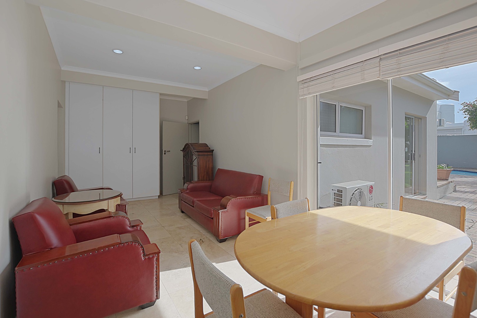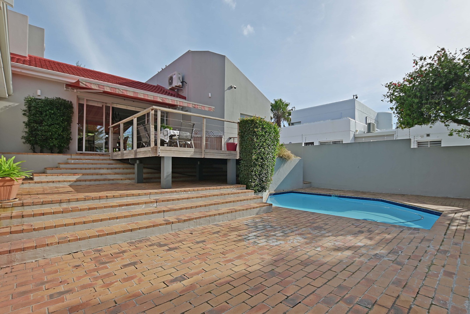 Very spacious familyroom fitted with airconditioner, with 2 sliding doors, one leading to the front patio with built-in braai and retractable awning, and the second opening up onto a wooden deck overlooking the garden and pool.