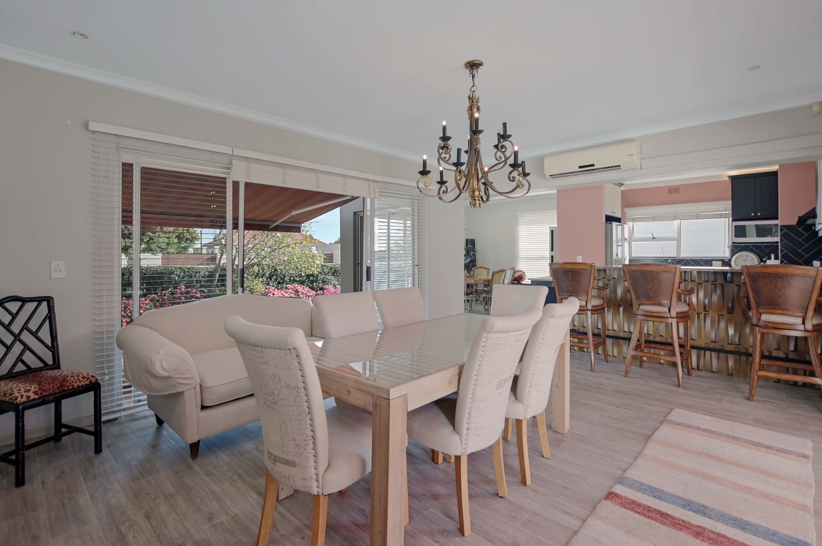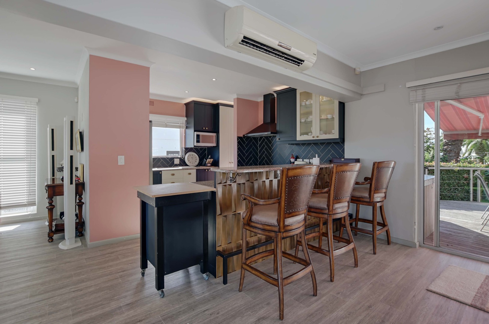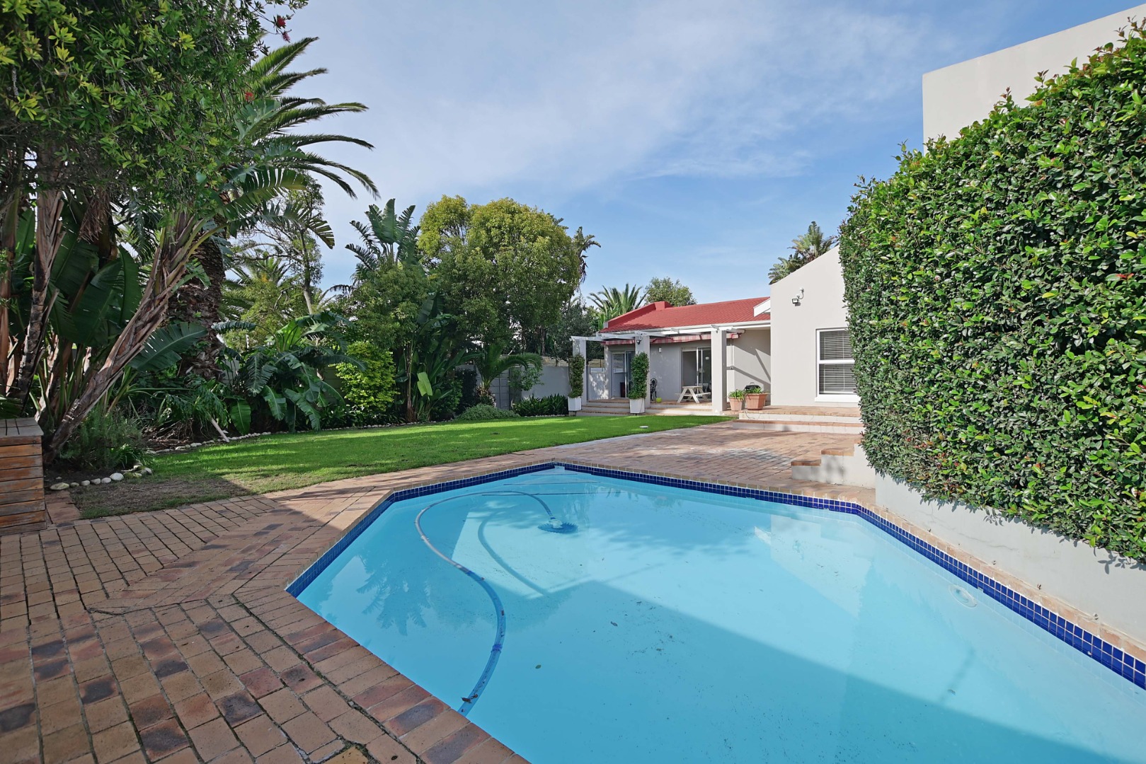Very spacious familyroom fitted with airconditioner, with 2 sliding doors, one leading to the front patio with built-in braai and retractable awning, and the second opening up onto a wooden deck overlooking the garden and pool.