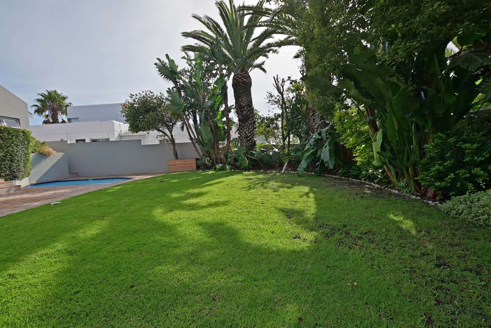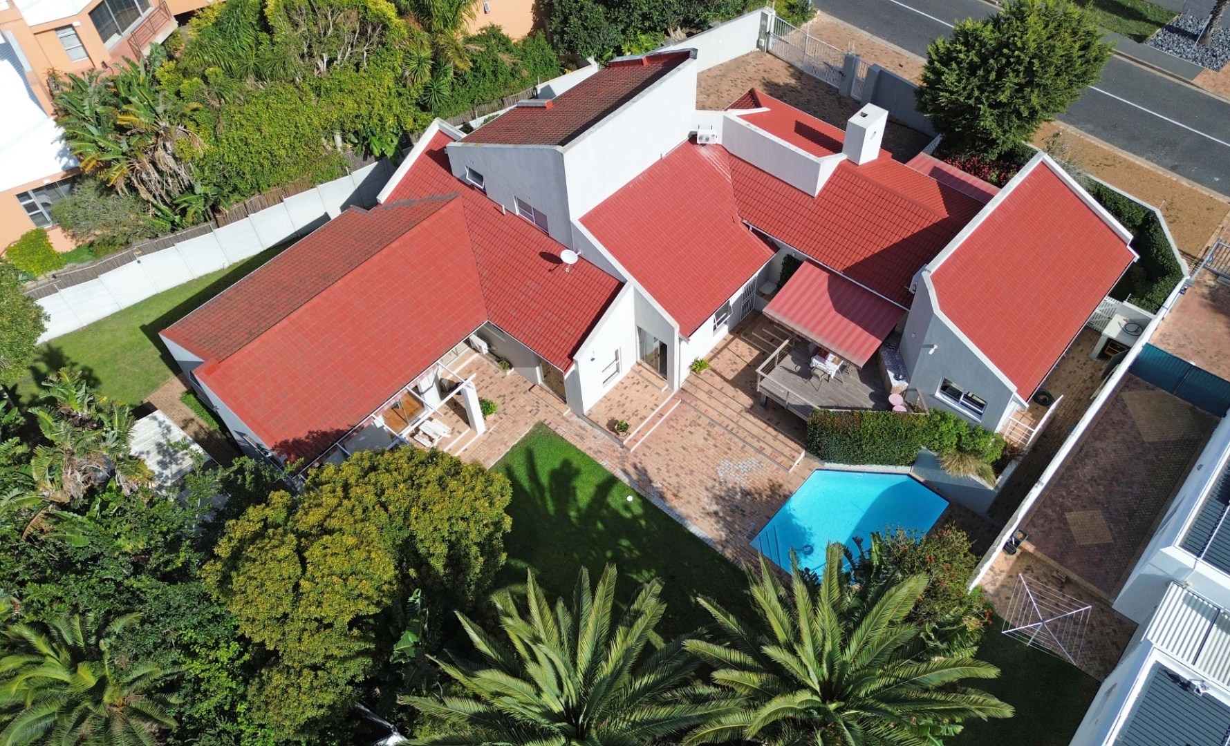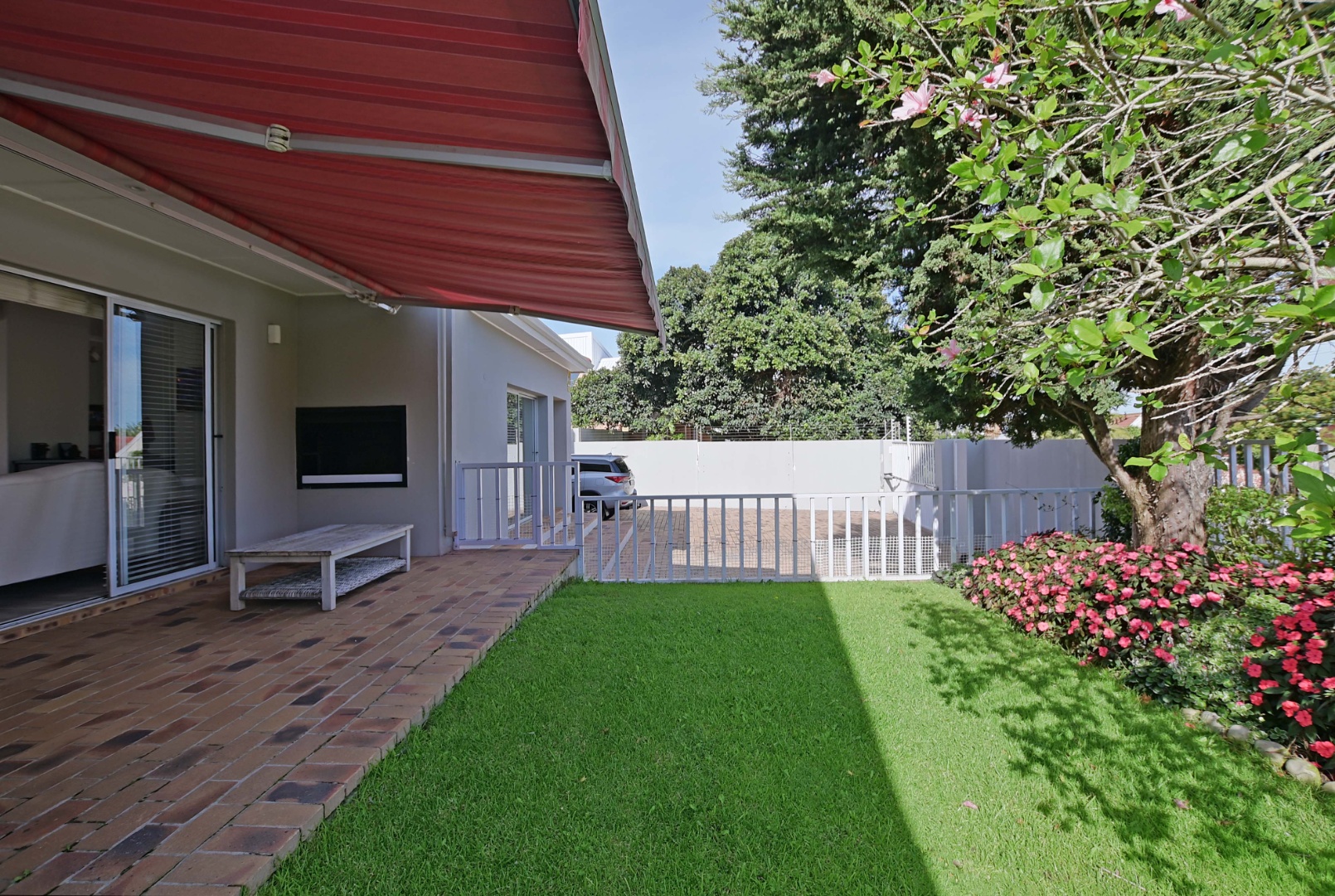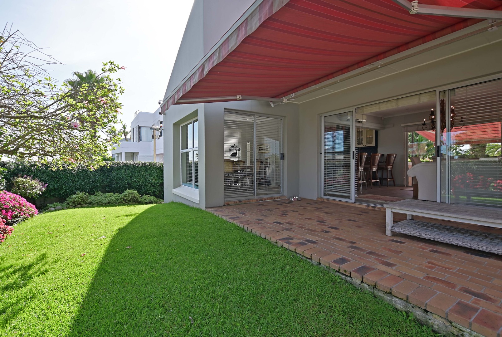 Very spacious familyroom fitted with airconditioner, with 2 sliding doors, one leading to the front patio with built-in braai and retractable awning, and the second opening up onto a wooden deck overlooking the garden and pool.