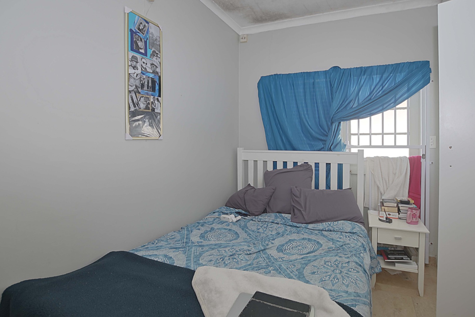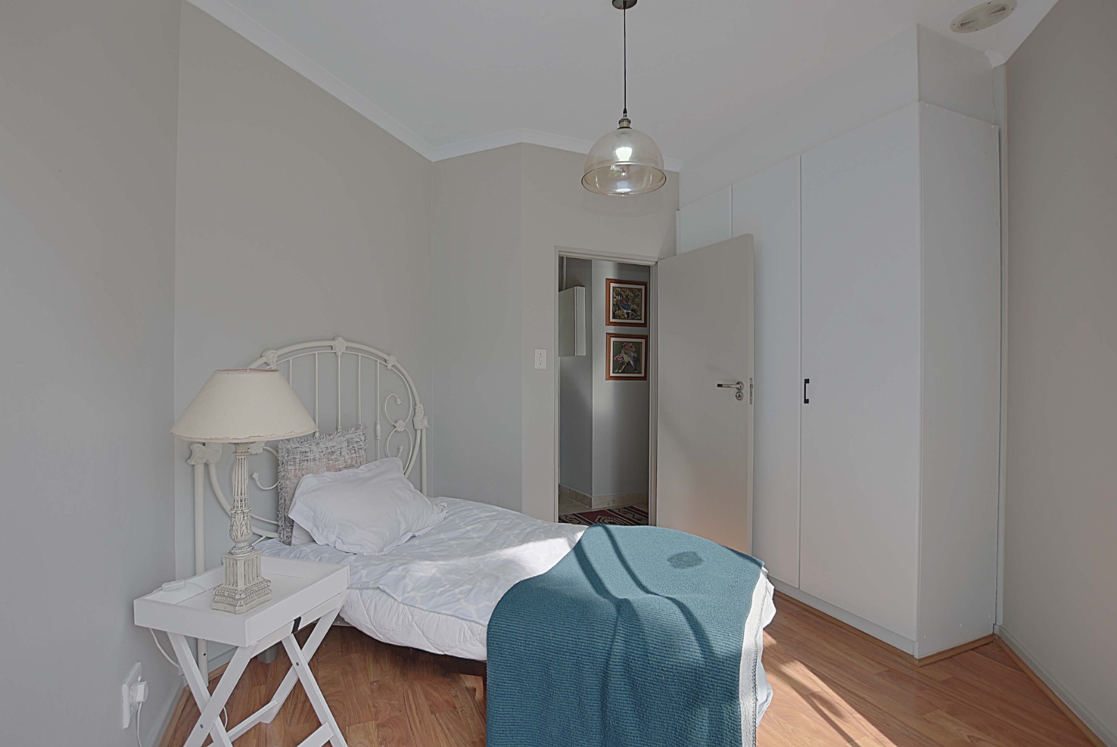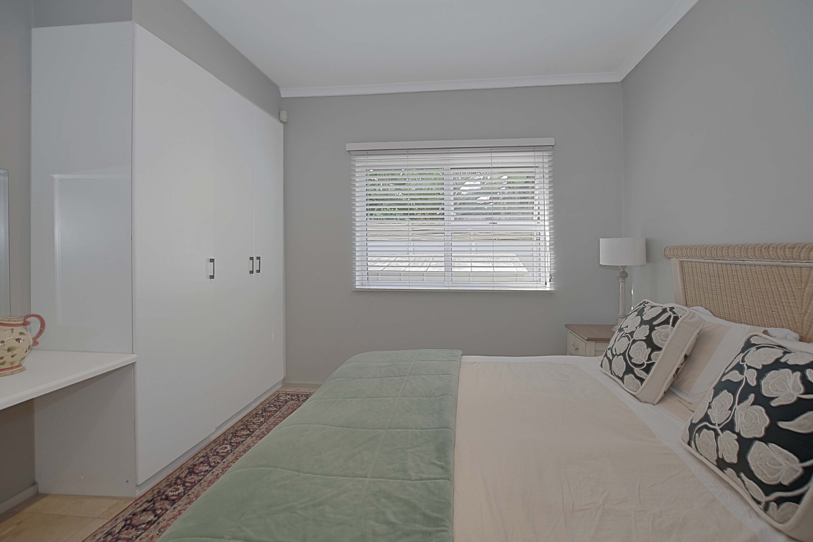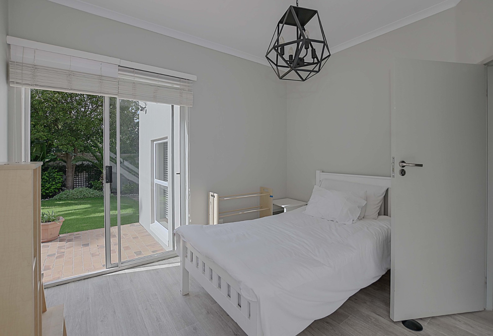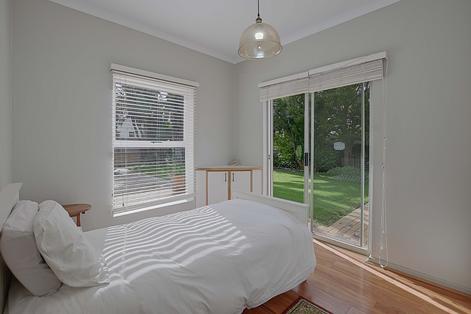 The guest bedroom is finished with laminated flooring and offers built-in cupboards. Sliding doors (fitted with blinds) opening up onto patio.