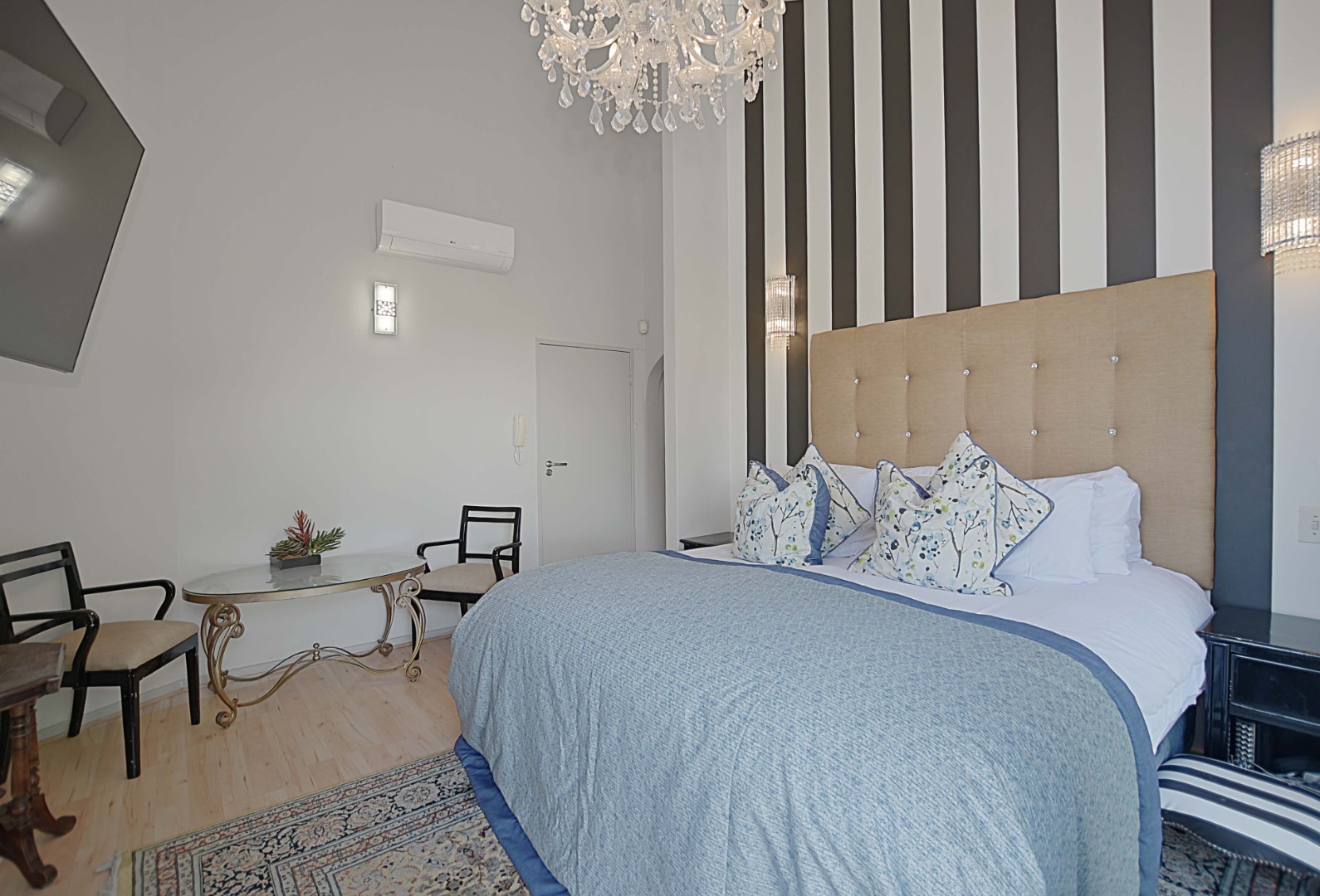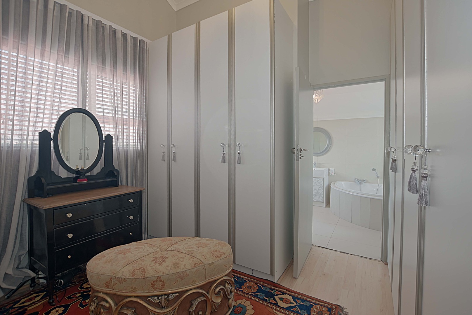 The stairs lead up to a generously sized main bedroom with laminated flooring and sliding doors leading out onto a private balcony. This bedroom is fitted with an airconditioner to keep cool on those warm summer days. Large walk-in dressing room with ample built-in cupboards and the main en-suite is luxuriously sized