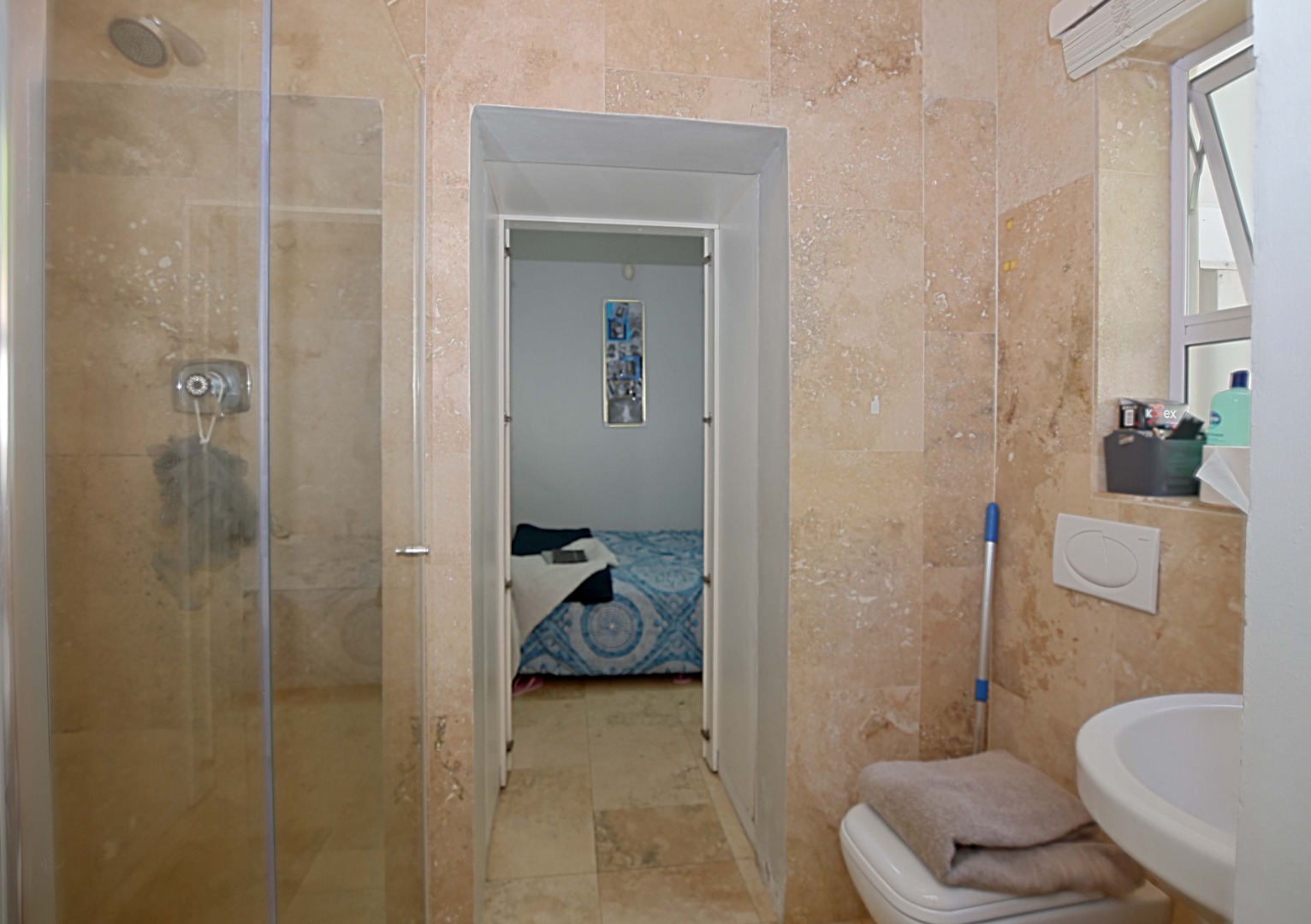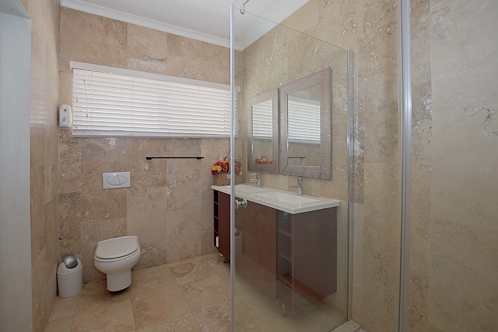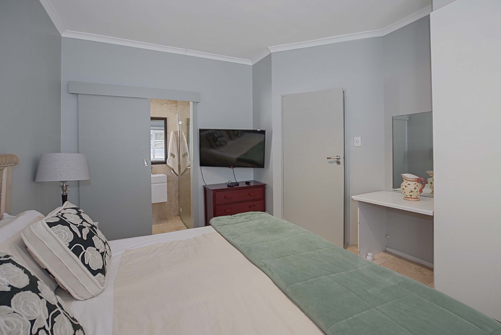 Spacious main bedroom with built-in cupboards and en-suite bathroom consisting of shower, basin and toilet.