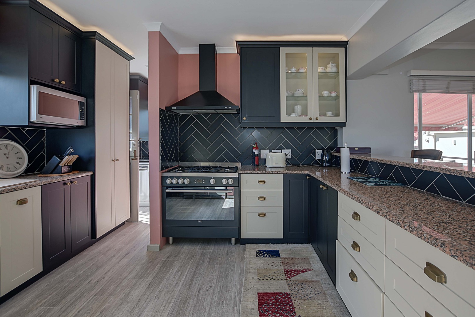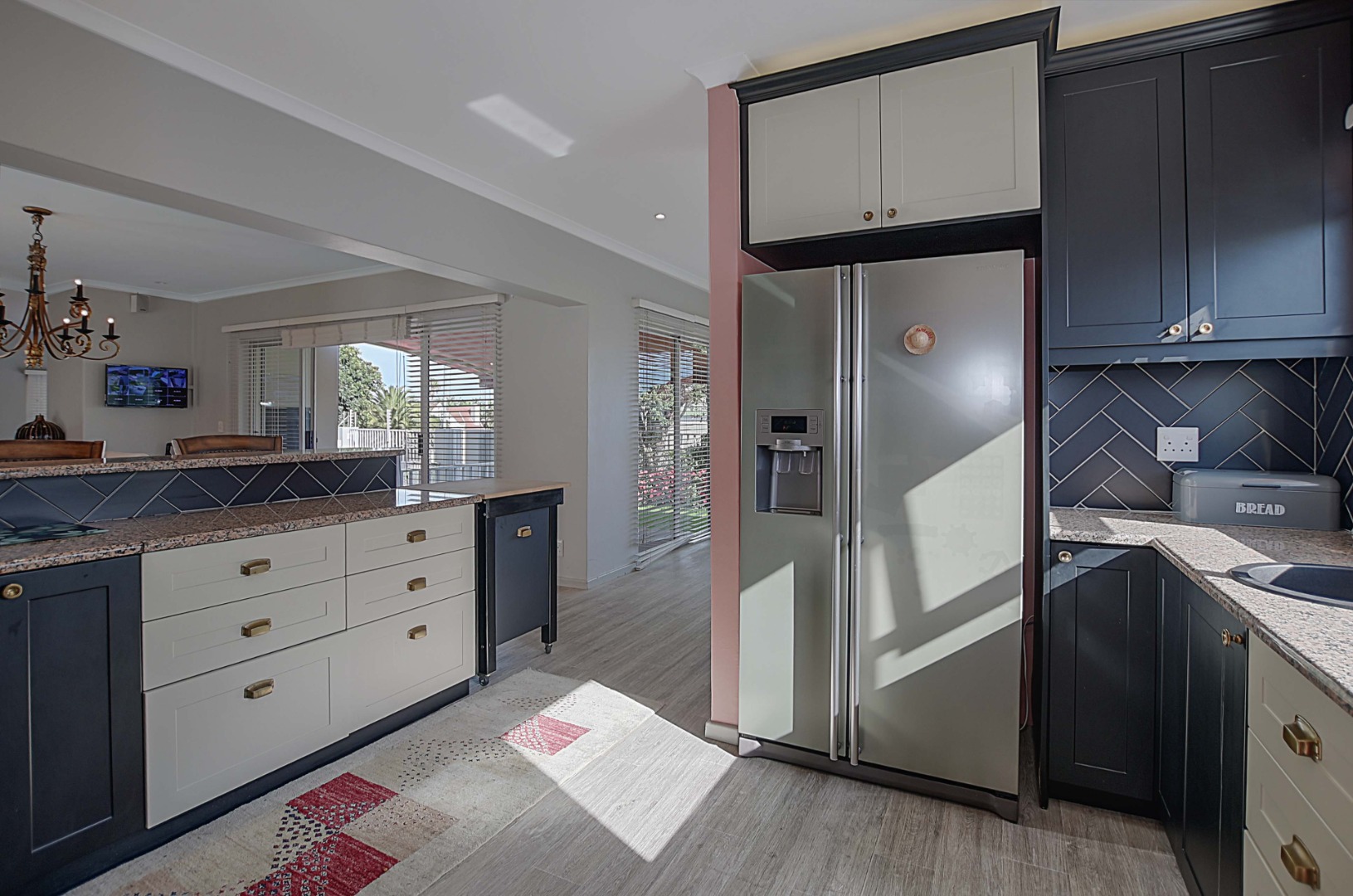 Large open plan kitchen, finished with granite tops and ample built-in cupboards. Five plate gas stove and extractor fan finished in black. Separate scullery with built-in