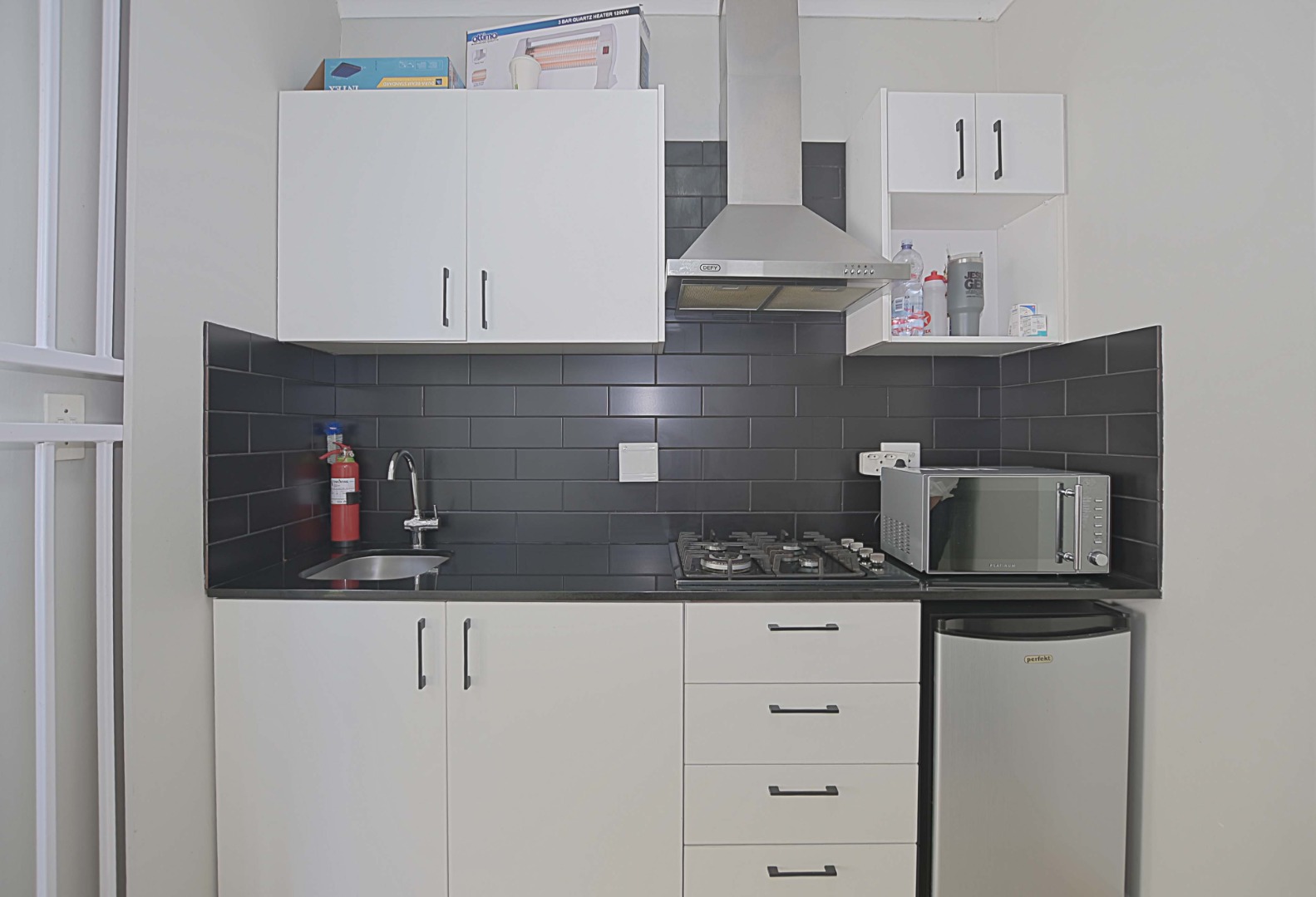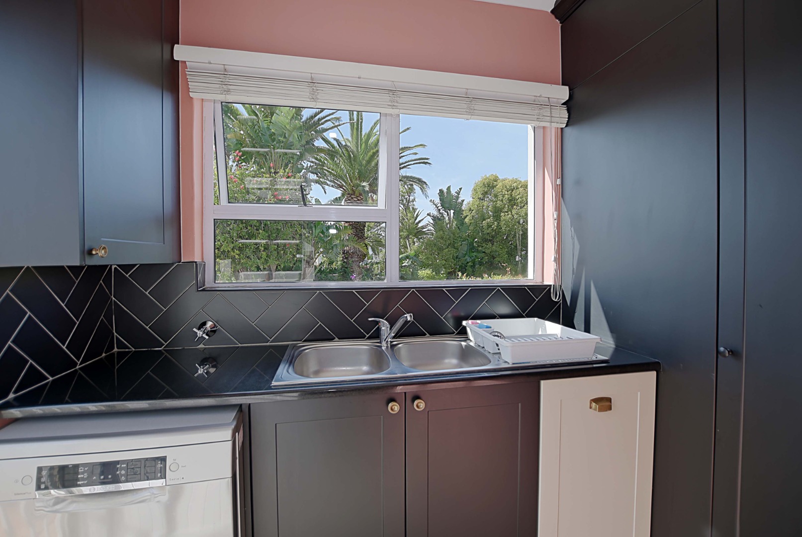 cupboards and plumbing for dishwasher. Kitchen door leading to outside drying area.
