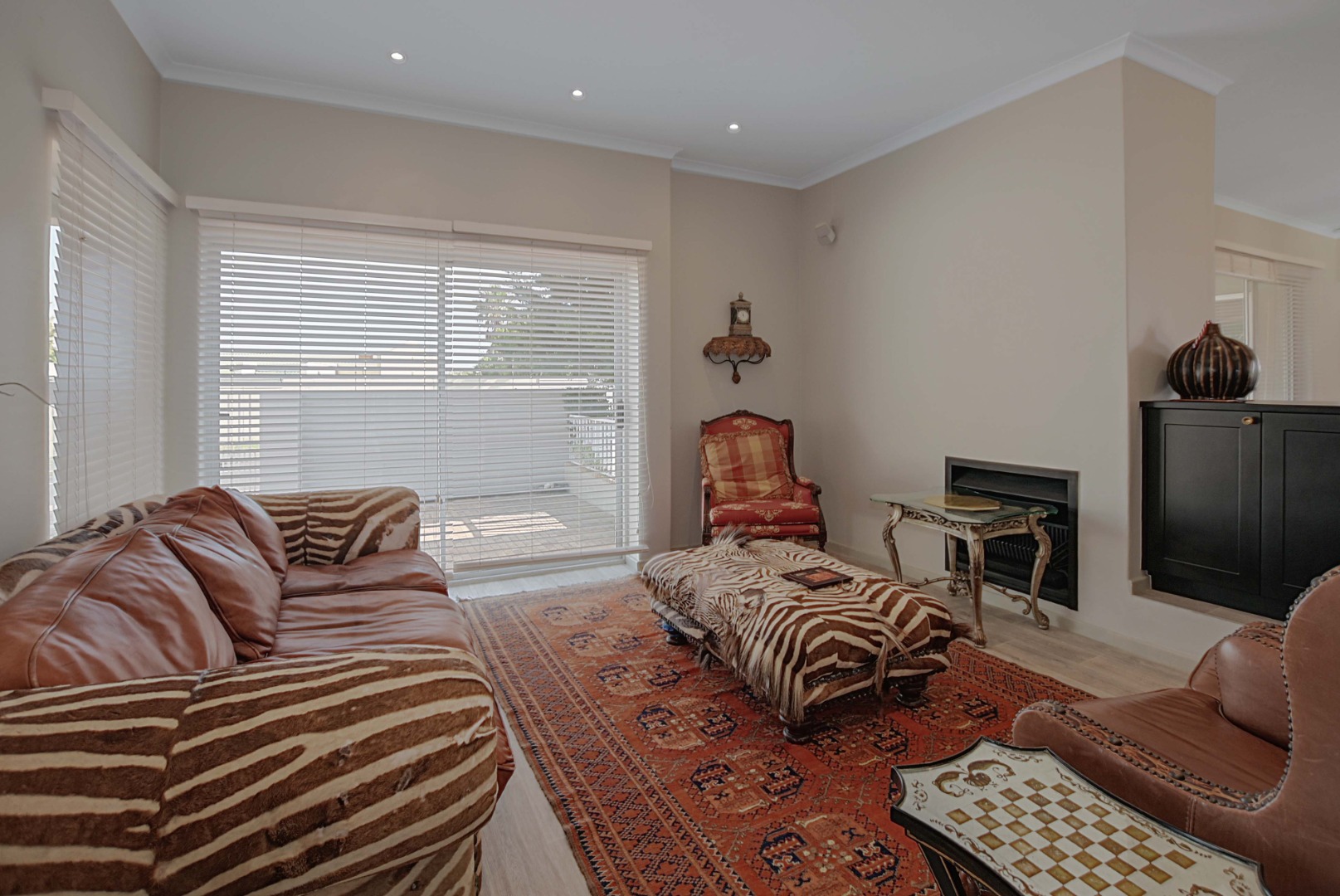 Large lounge with Jetmaster fireplace, and sliding doors opening up onto front patio.