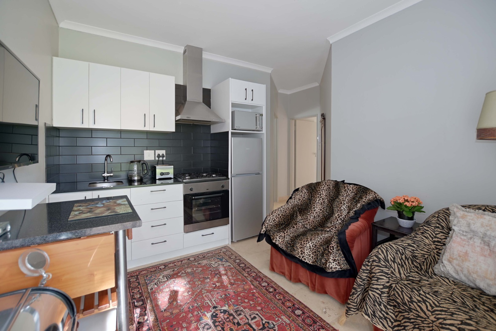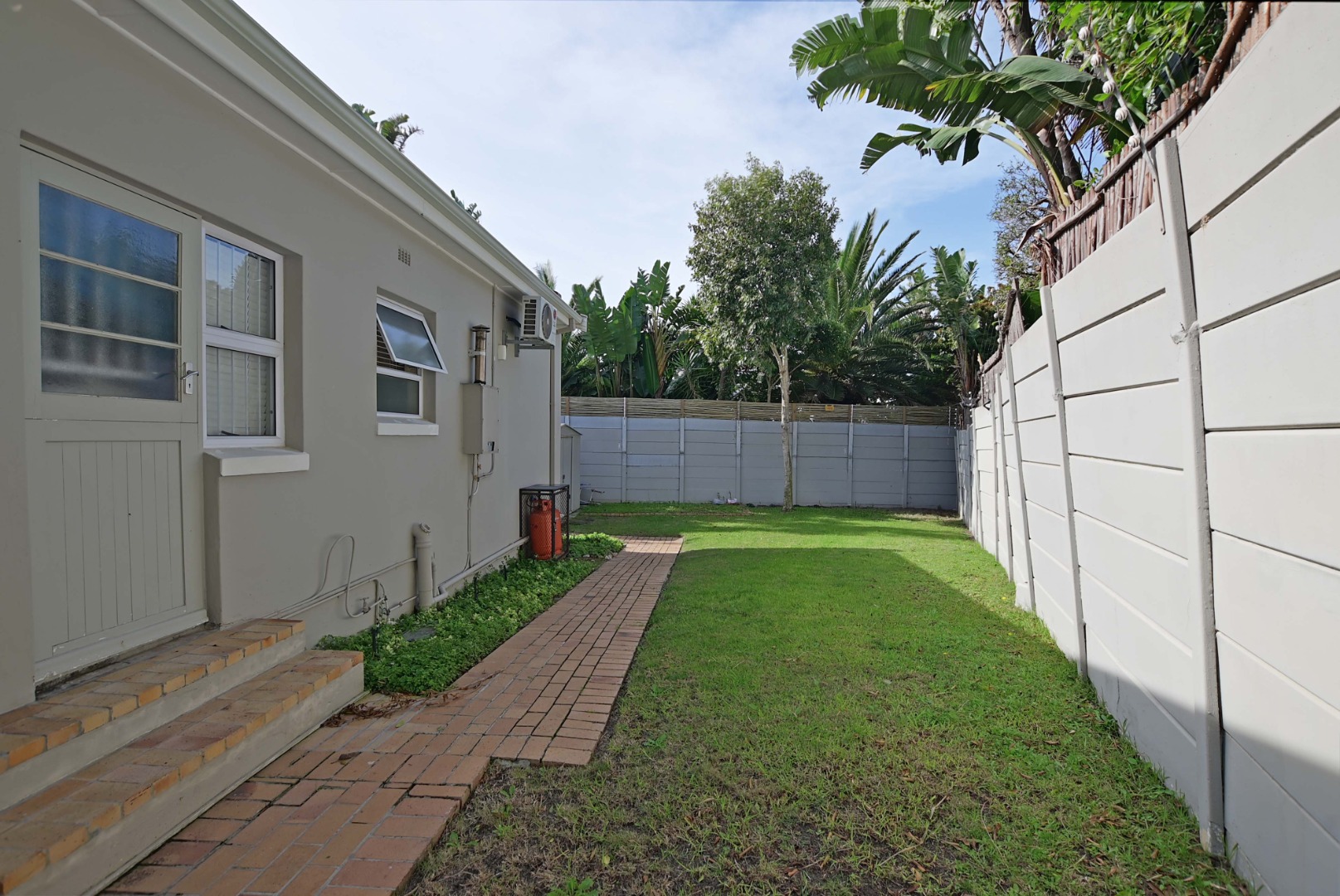 Very spacious tiled living area – fitted with airconditioner and sliding doors opening up into garden. Interleading door into house makes it possible for this to be part of the house, or a completely separate two bedroom flat. There is also an interleading door into the second flatlet from this living area, which consists of a kitchen, with bedroom & en-suite. This flatlet also has it's own separate entrance from the side of the house.