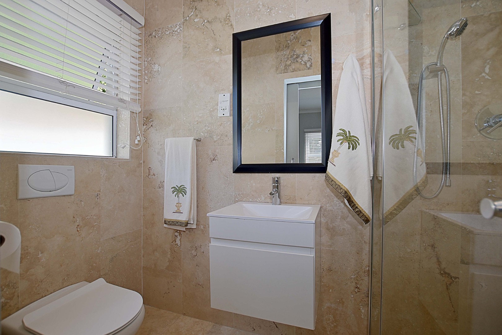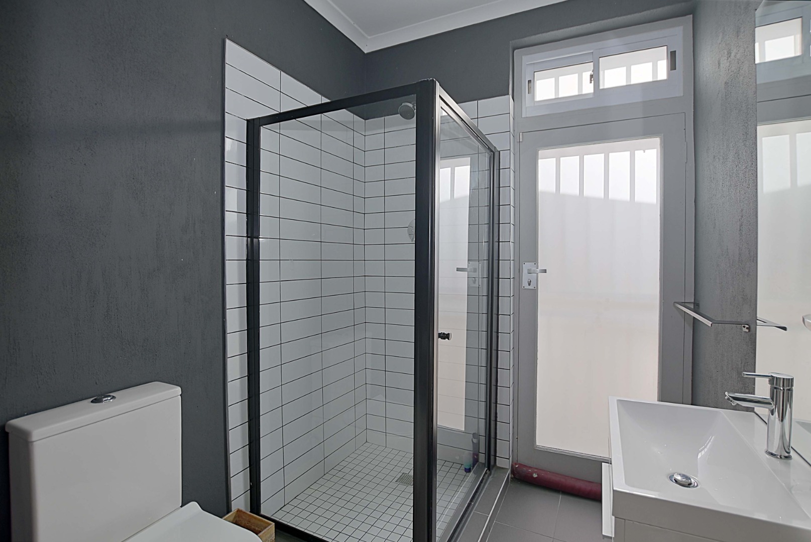 The guest cloakroom offers a shower, toilet and basin, as well as a door opening up onto outside, making this bathroom ideal for guests to use while entertaining outside around the pool.
