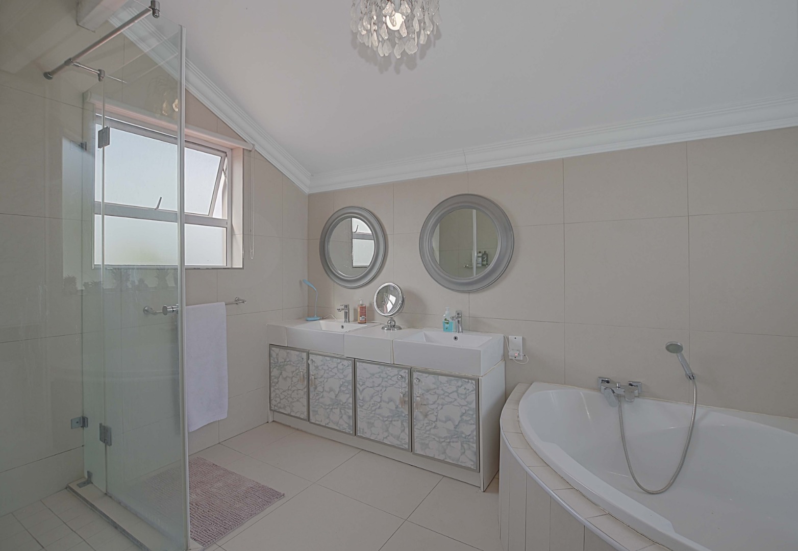 offering a corner bath, shower, double vanity and toilet.