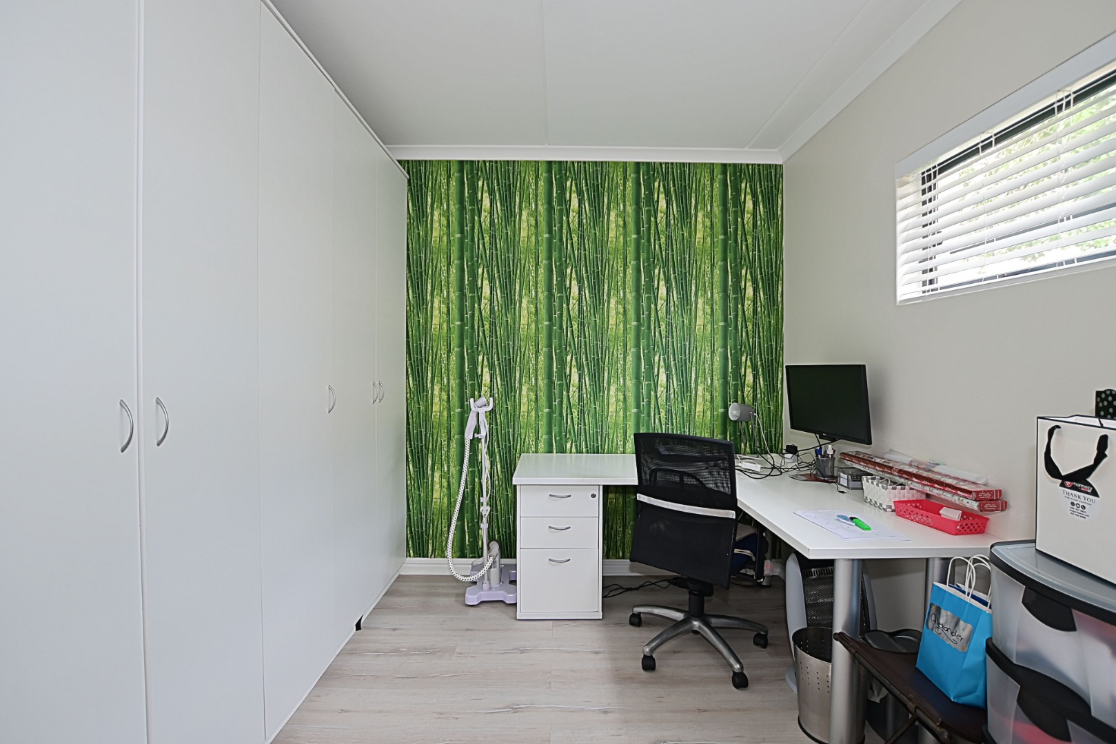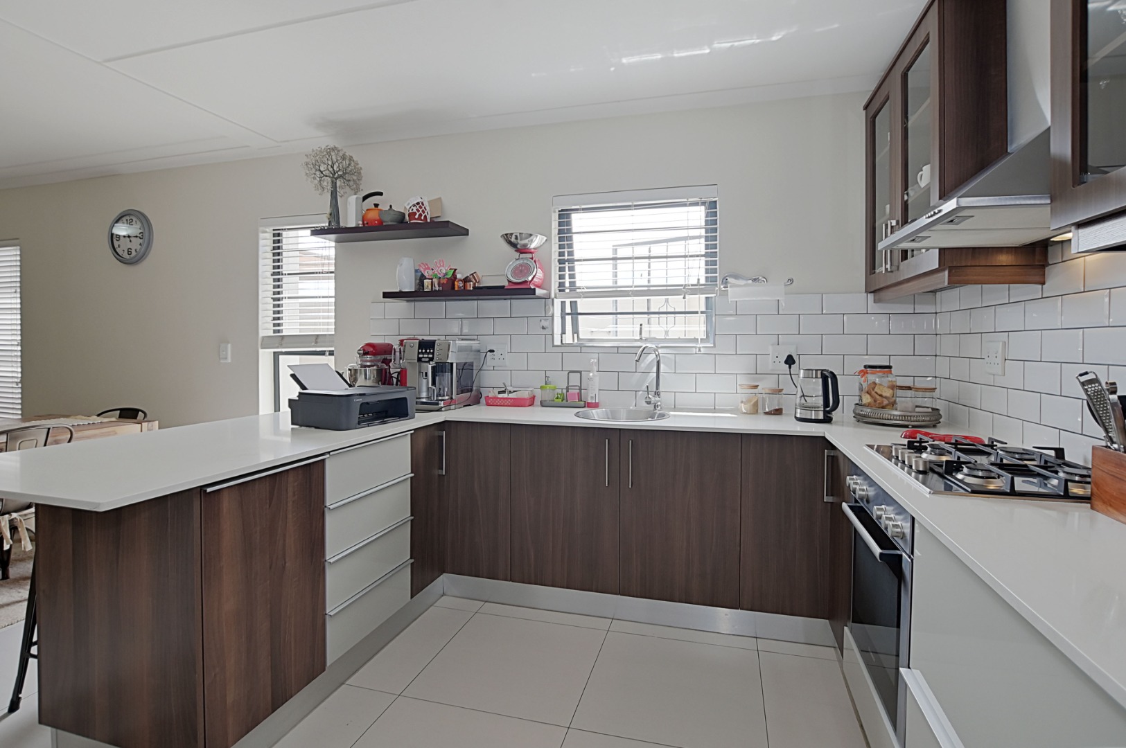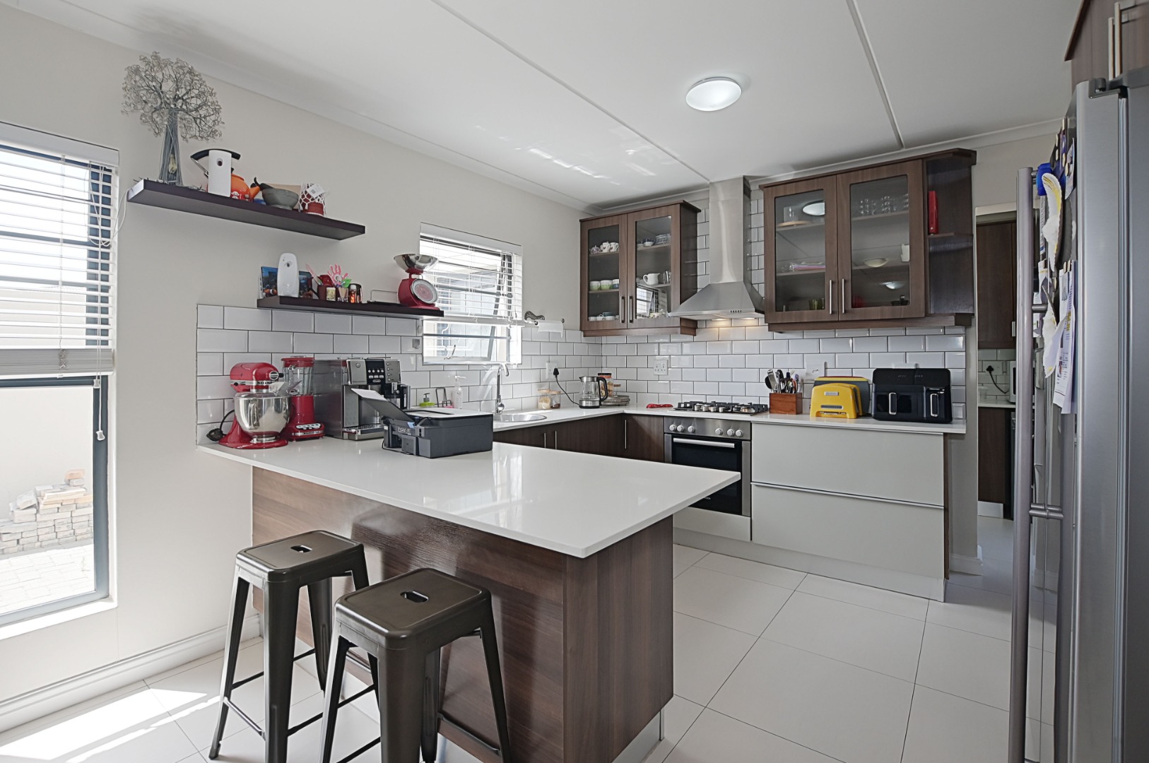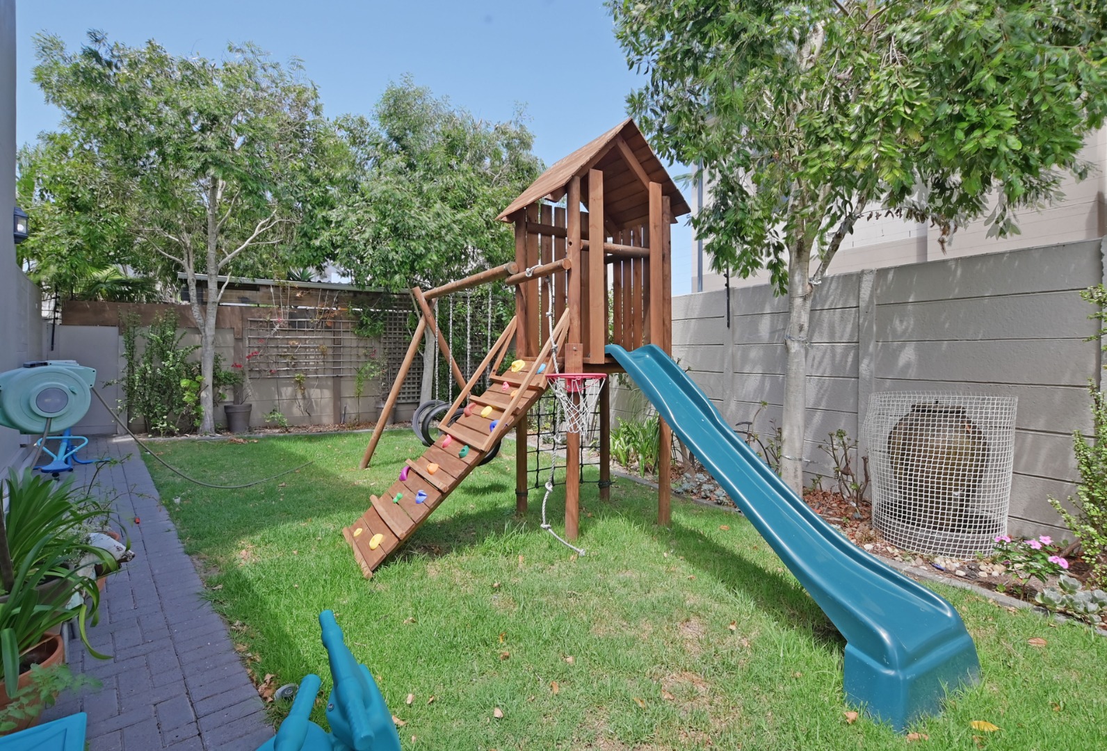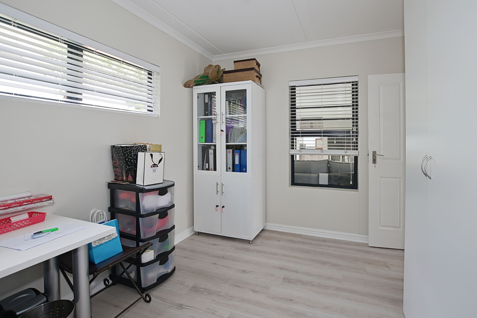 The expansive braai room is a standout feature — perfect for entertaining year-round — and opens onto a sunny, private garden complete with a swimming pool and ample space for children and pets to play. The open-plan kitchen is complemented by a separate scullery with direct access to the back garden, while additional garden storage adds to the home’s practicality. A staff quarters with bathroom is positioned at the rear of the property.