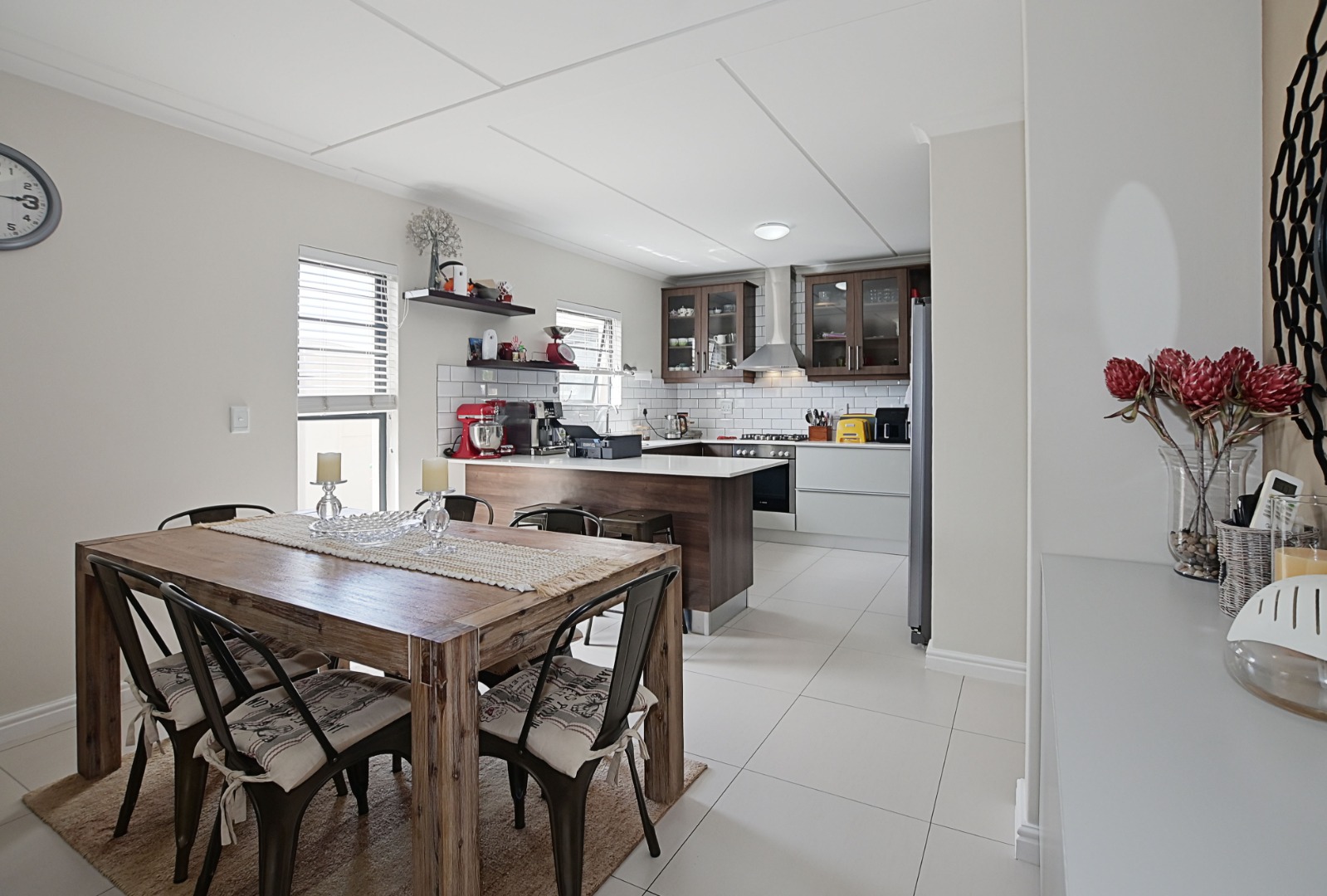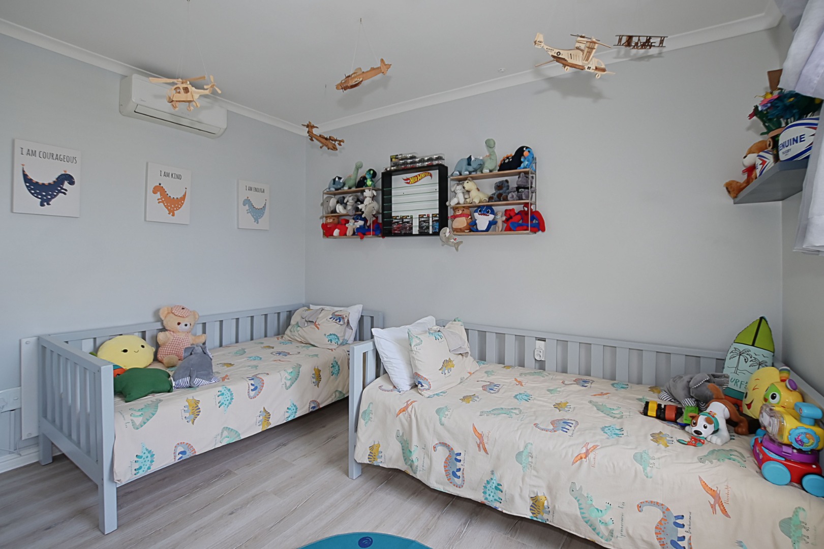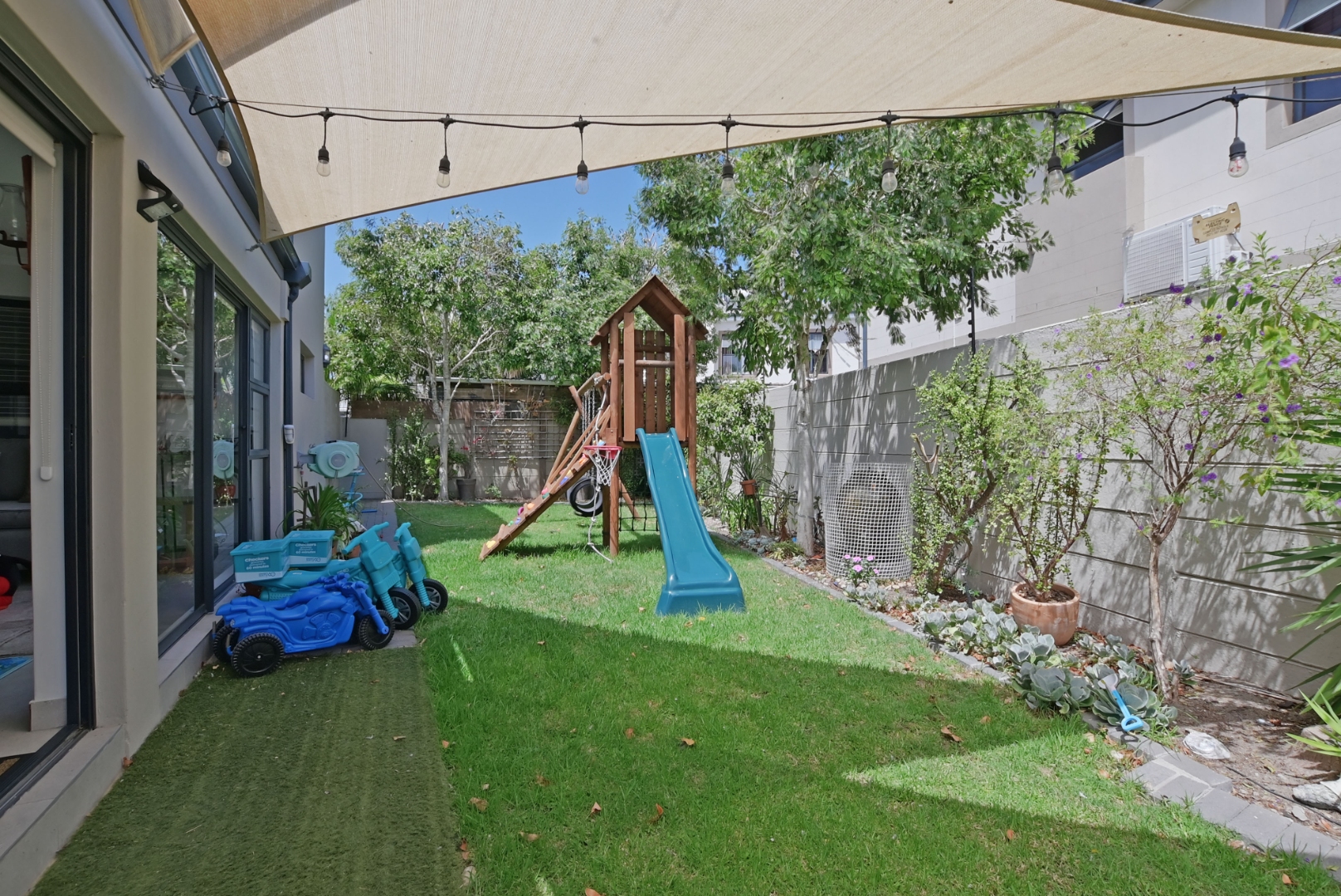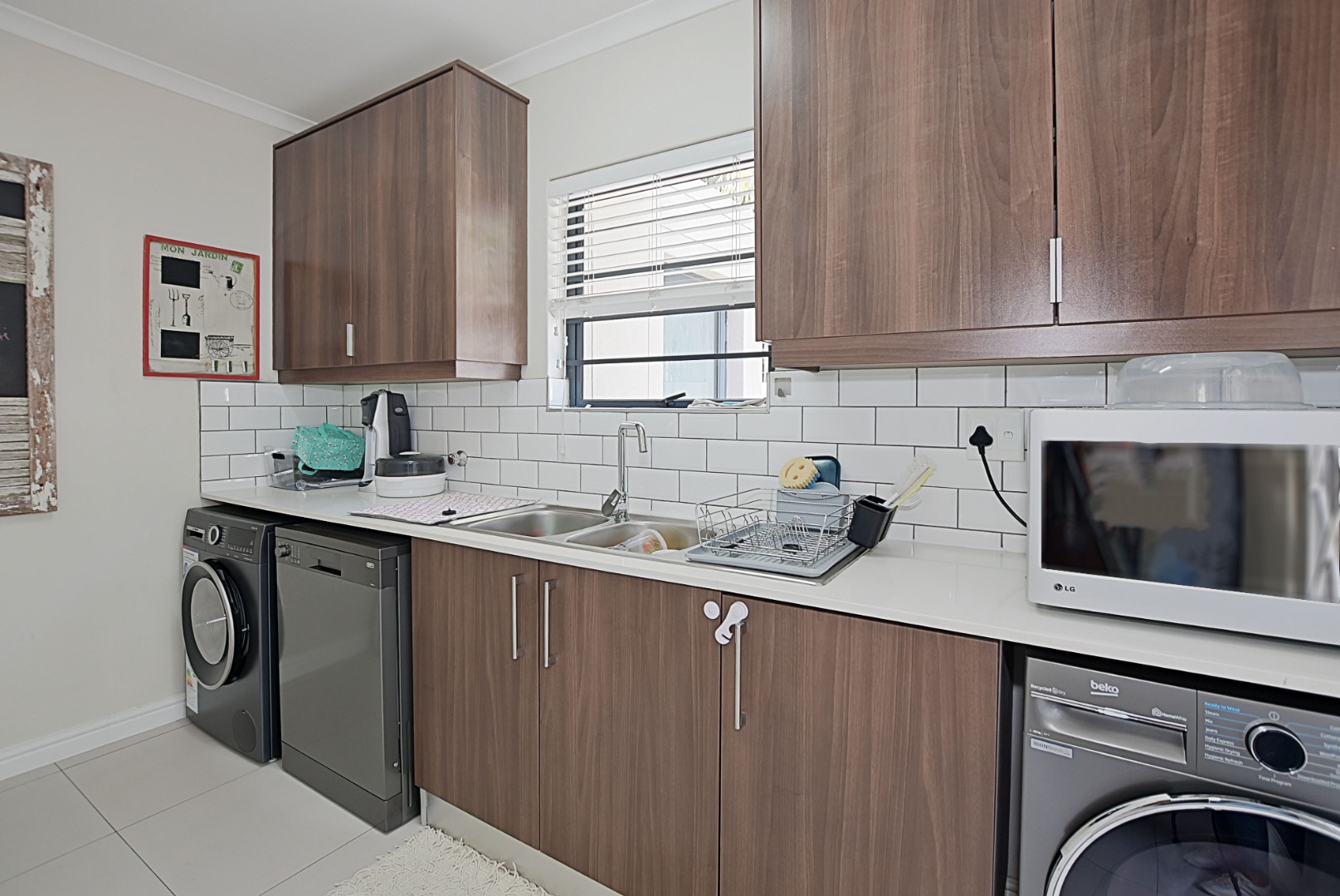 The expansive braai room is a standout feature — perfect for entertaining year-round — and opens onto a sunny, private garden complete with a swimming pool and ample space for children and pets to play. The open-plan kitchen is complemented by a separate scullery with direct access to the back garden, while additional garden storage adds to the home’s practicality. A staff quarters with bathroom is positioned at the rear of the property.