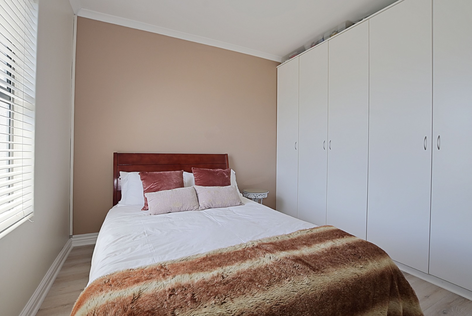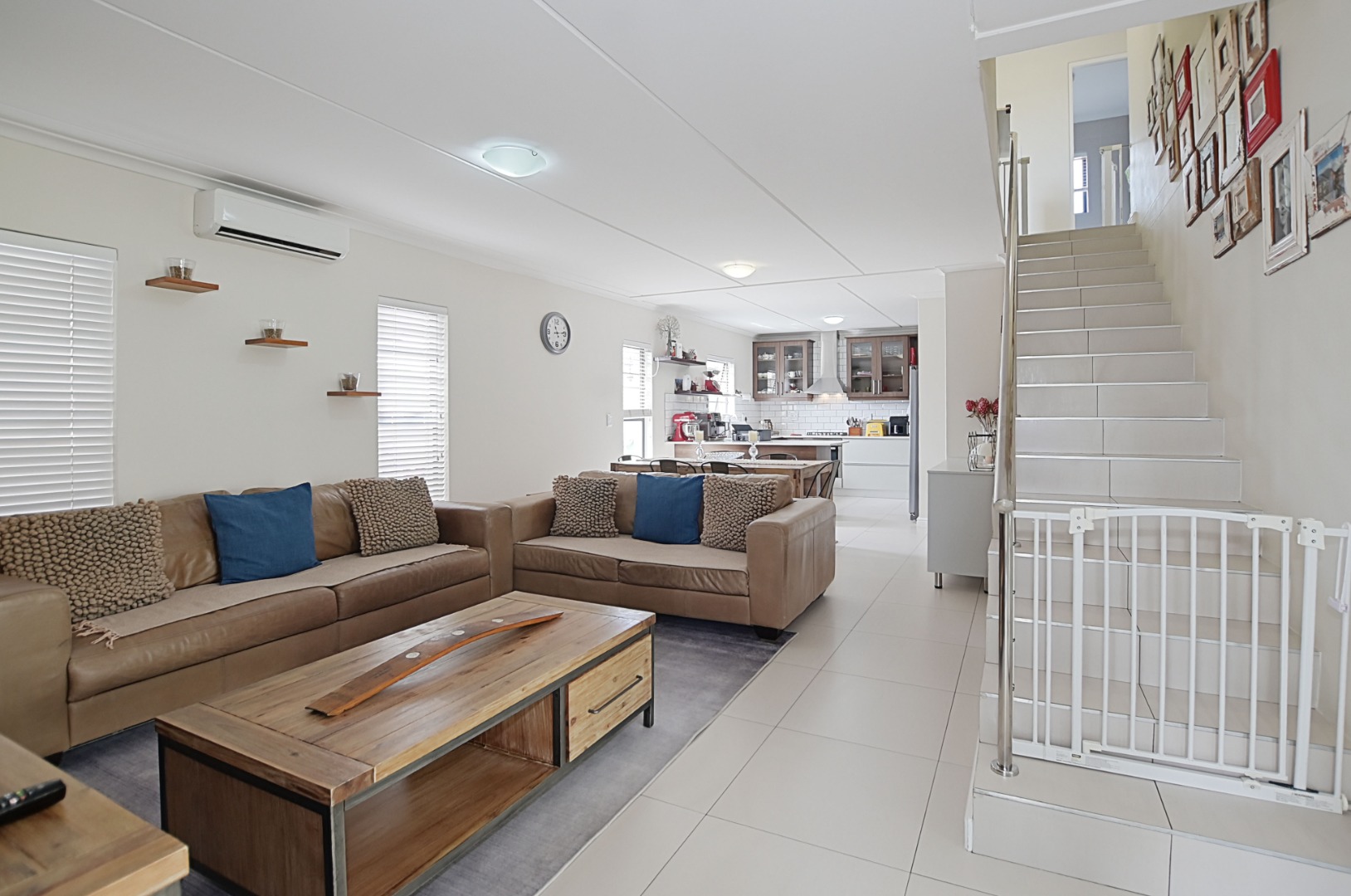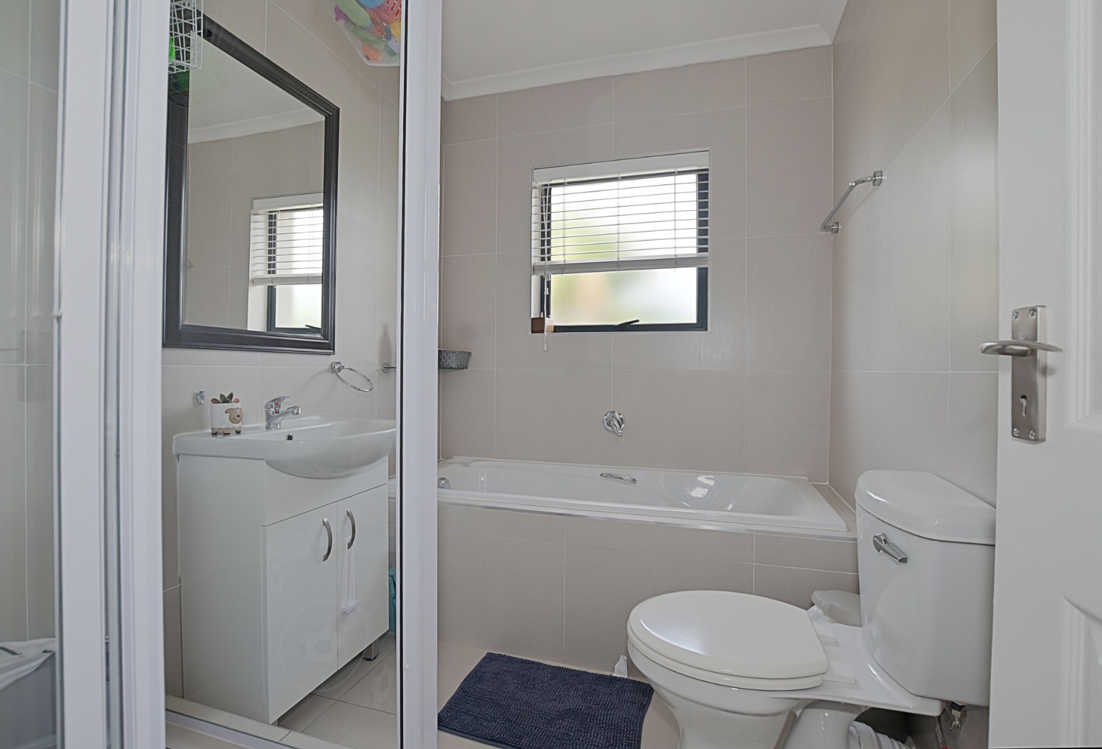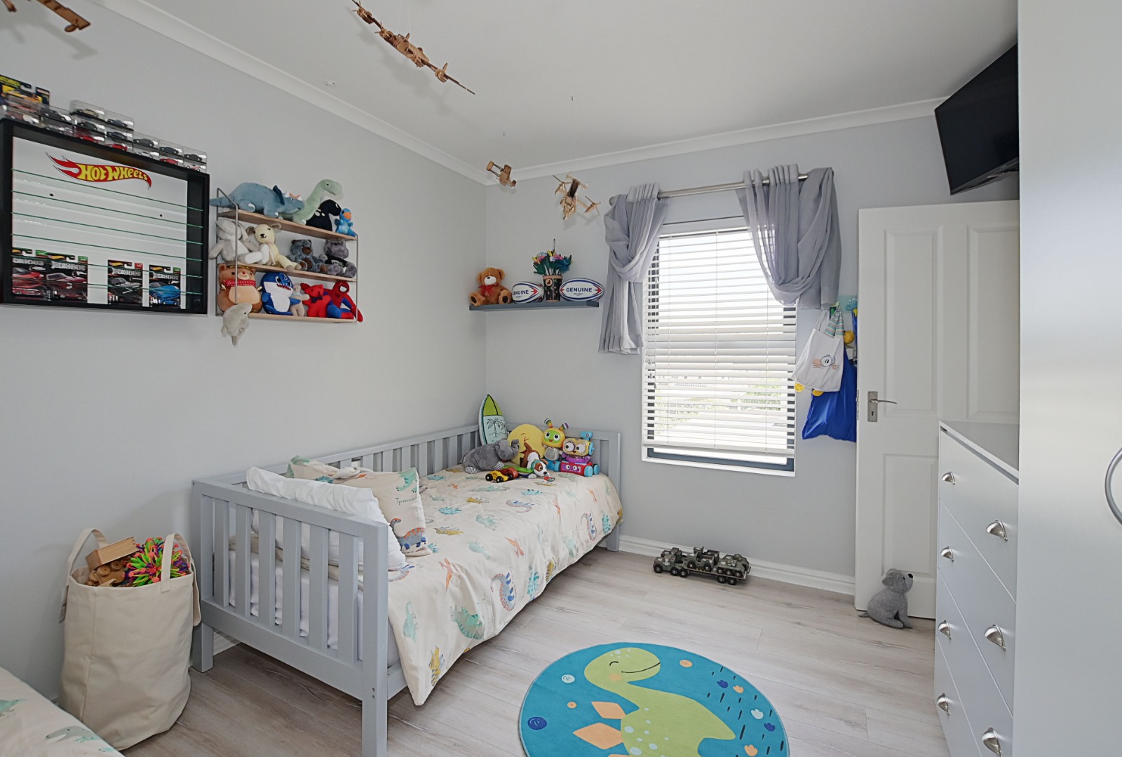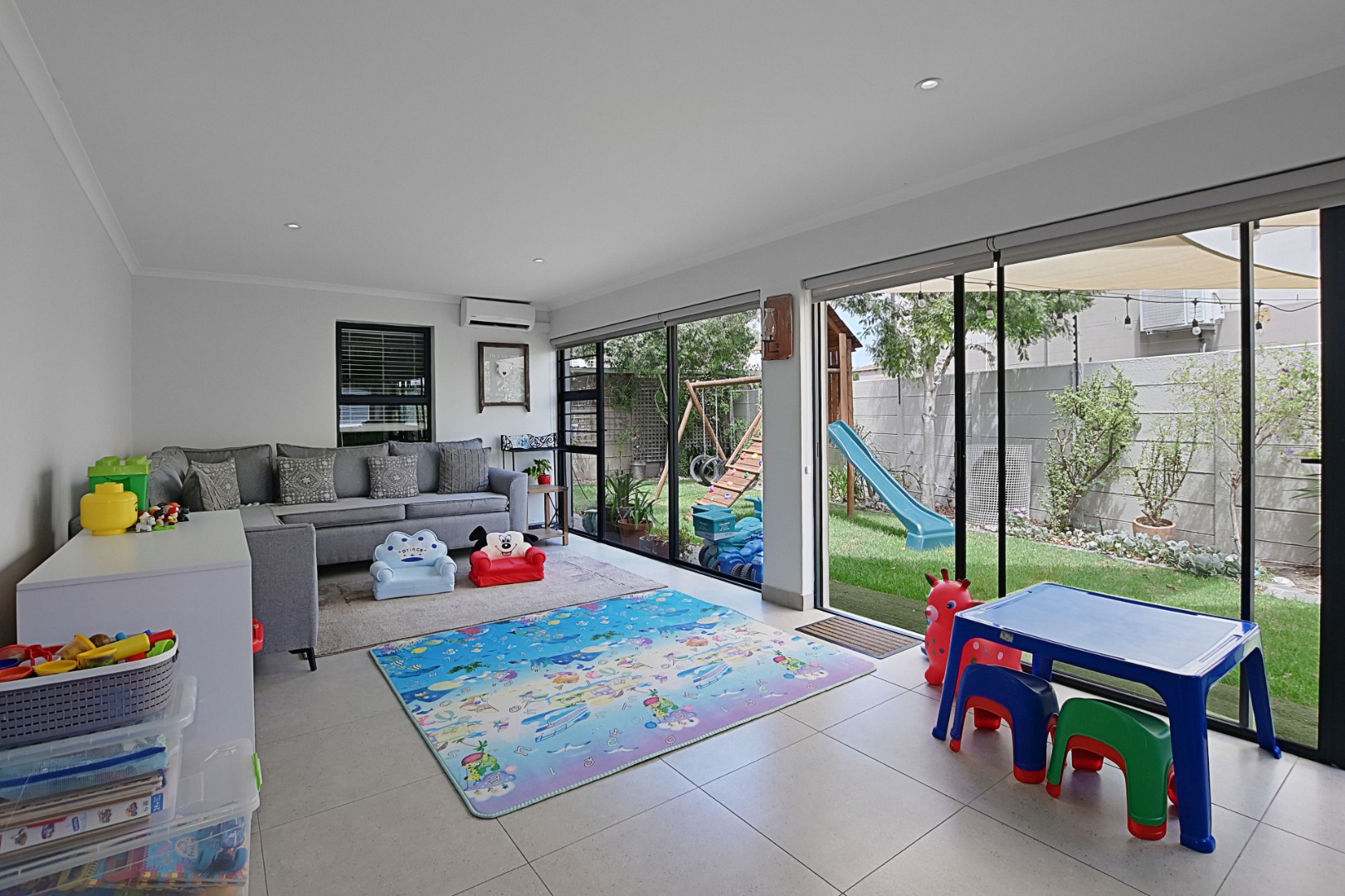 The expansive braai room is a standout feature — perfect for entertaining year-round — and opens onto a sunny, private garden complete with a swimming pool and ample space for children and pets to play. The open-plan kitchen is complemented by a separate scullery with direct access to the back garden, while additional garden storage adds to the home’s practicality. A staff quarters with bathroom is positioned at the rear of the property.