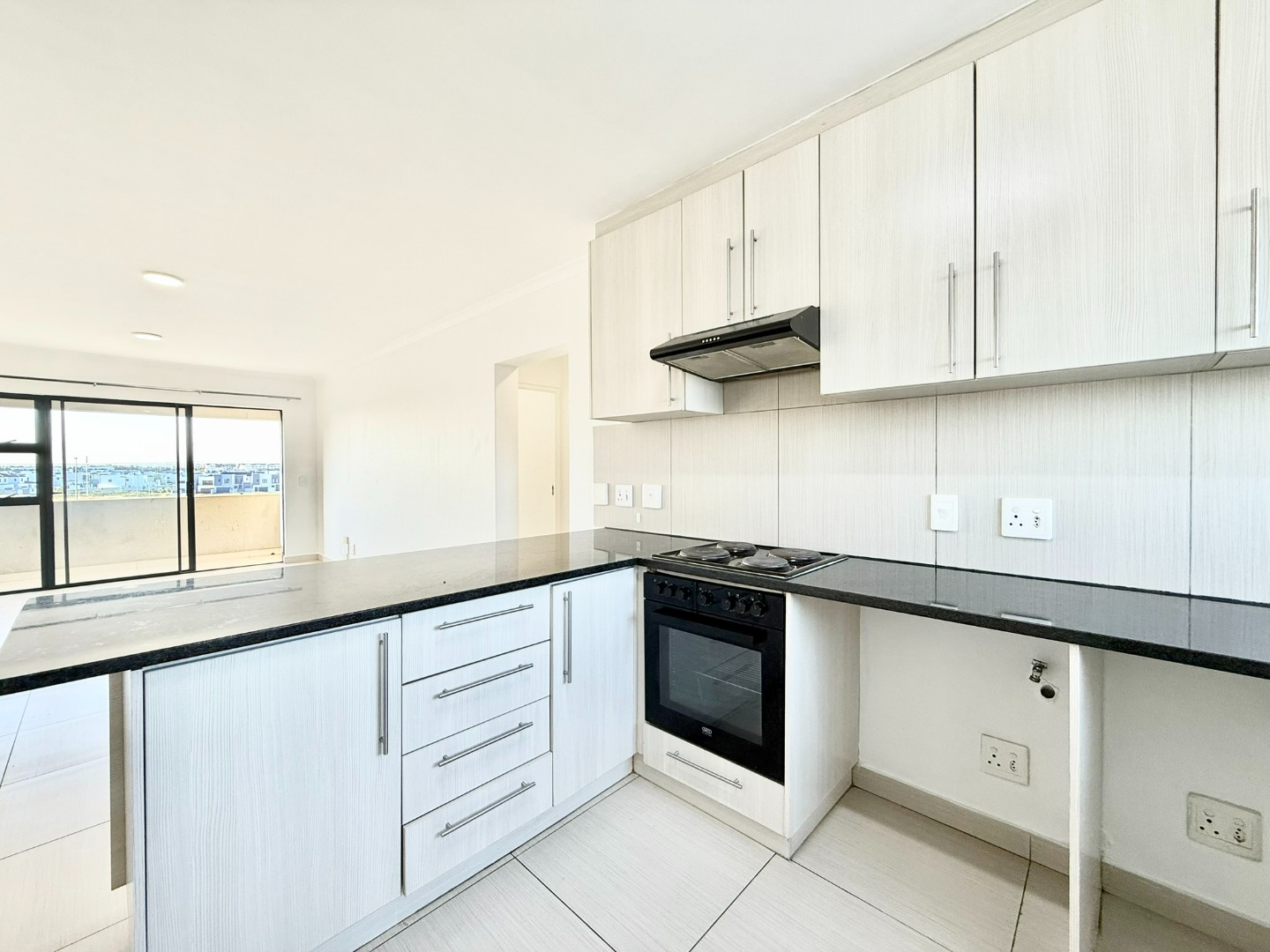 The kitchen connects directly to the dining and living area in an open-plan layout that leads out onto a balcony. The kitchen has an electric oven and stove, along with two waterpoints for both a washing machine and a dishwasher.