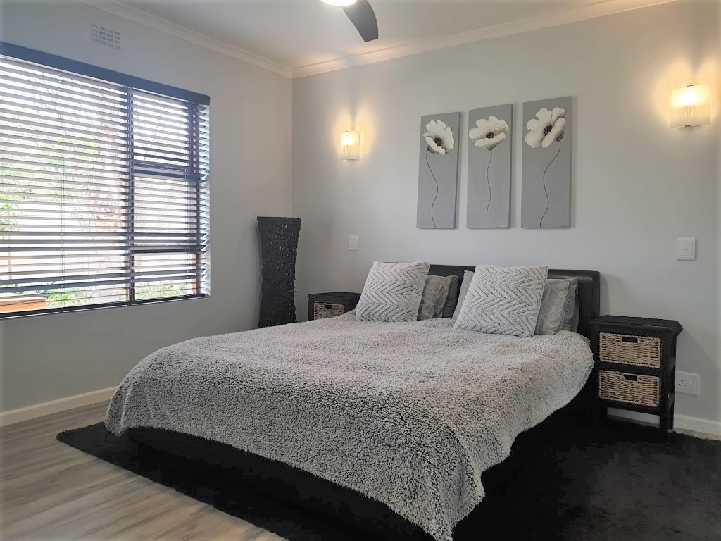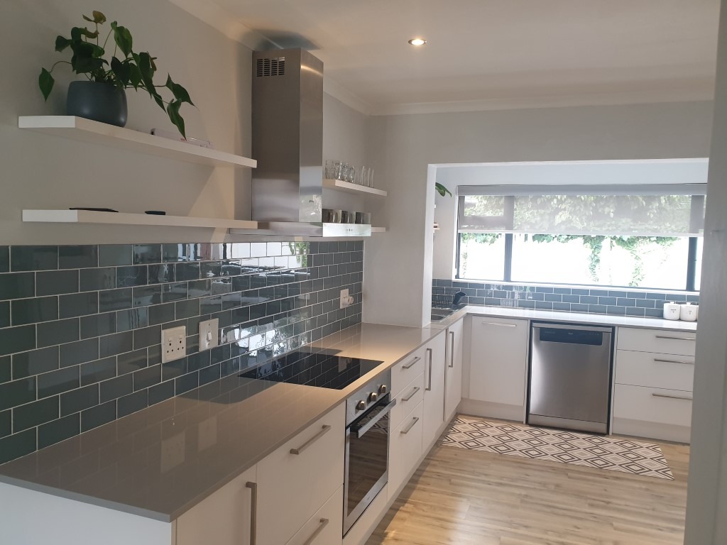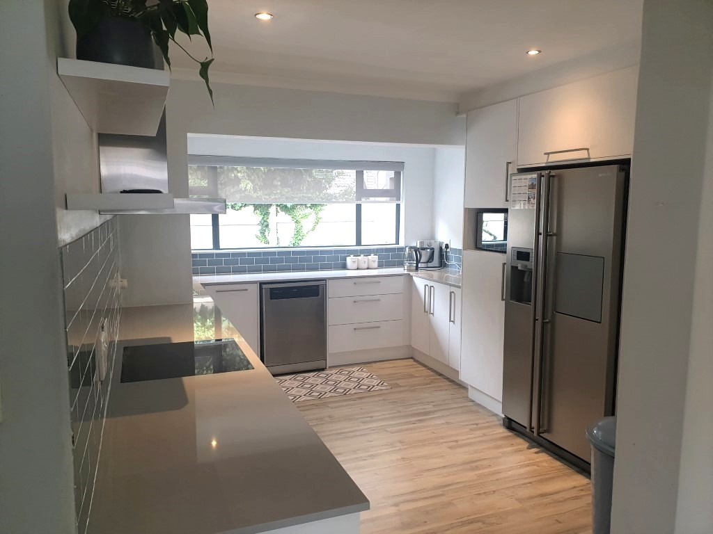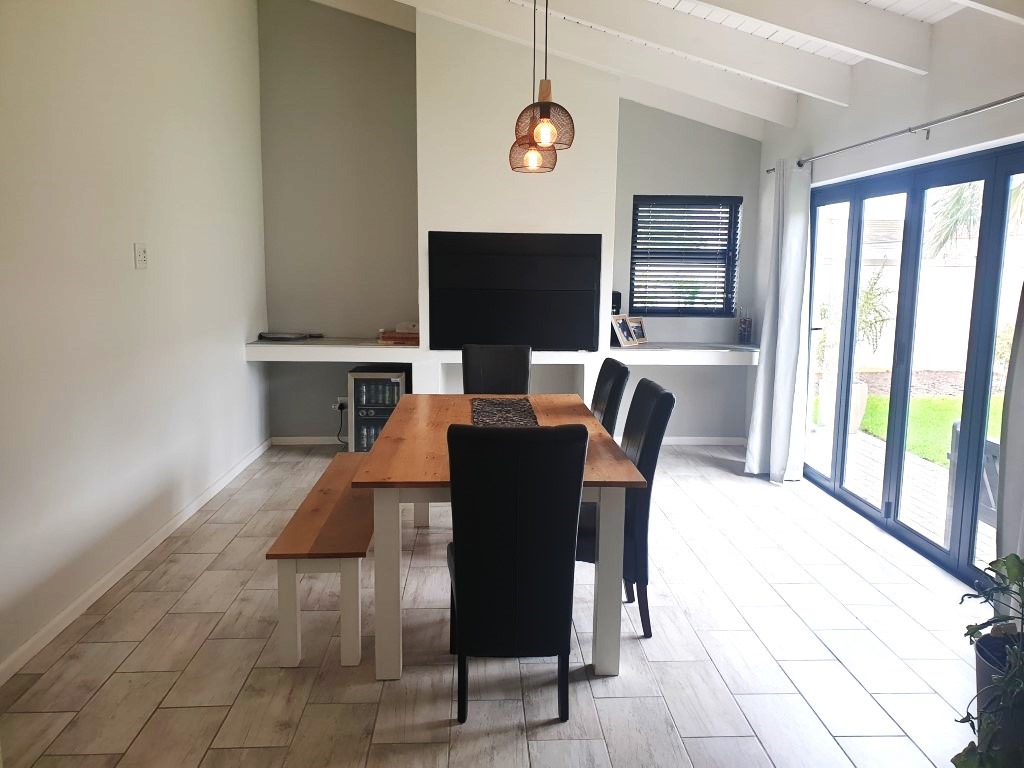 The inviting open-plan layout seamlessly integrates the Kitchen, Dining Room, Lounge and the Braai Room, with the latter flowing through fold-away glass stacking doors to the north-facing garden.