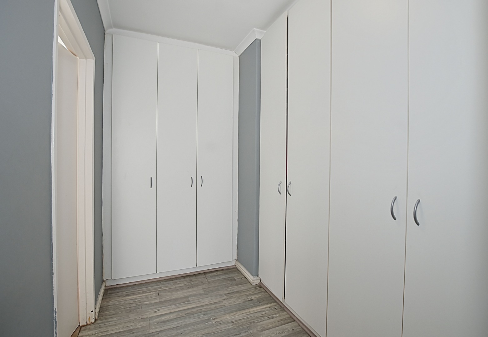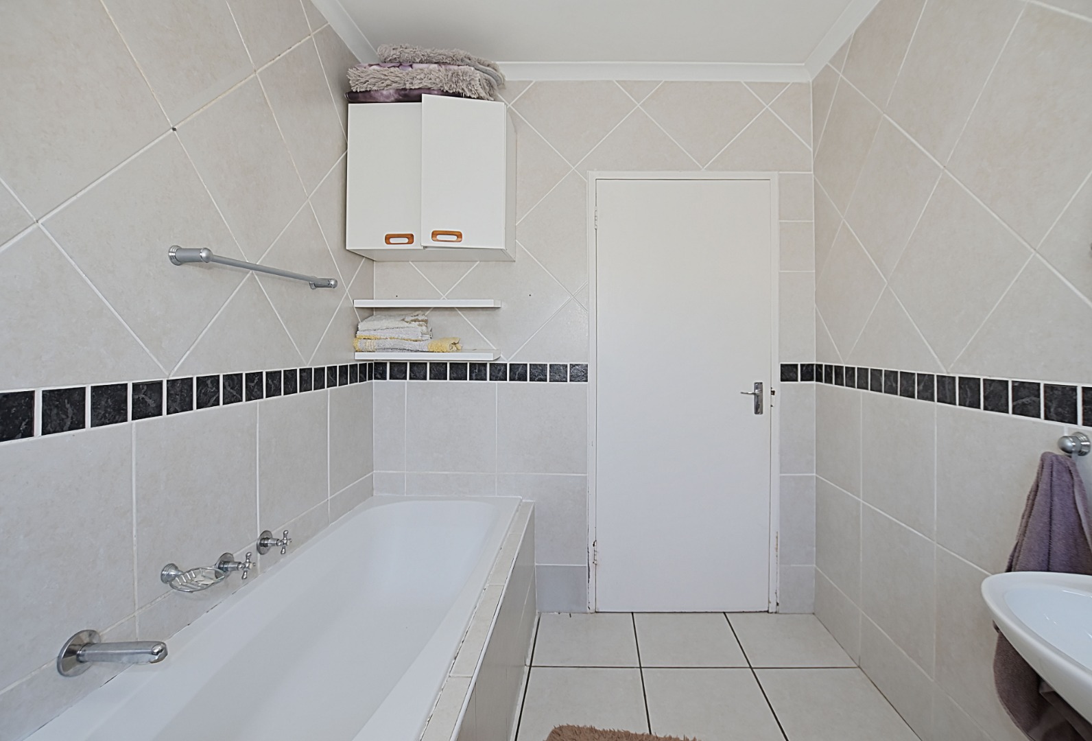 The house has great street appeal; tucked away behind 2 big, shady trees. The tiled lounge/dining area is nothing short of cavernous and has enormous, demarcated areas for both the dining area and the lounge. There’s a spacious open plan kitchen with a super-extended breakfast bar, acres of work surface; and more than enough top and bottom cupboards to accommodate even those with every kitchen gadget that exists! The kitchen boasts a newly refurbished scullery with plumbing for all the appliances and a back door leading to the side passage and through that, to the back garden drying area.
