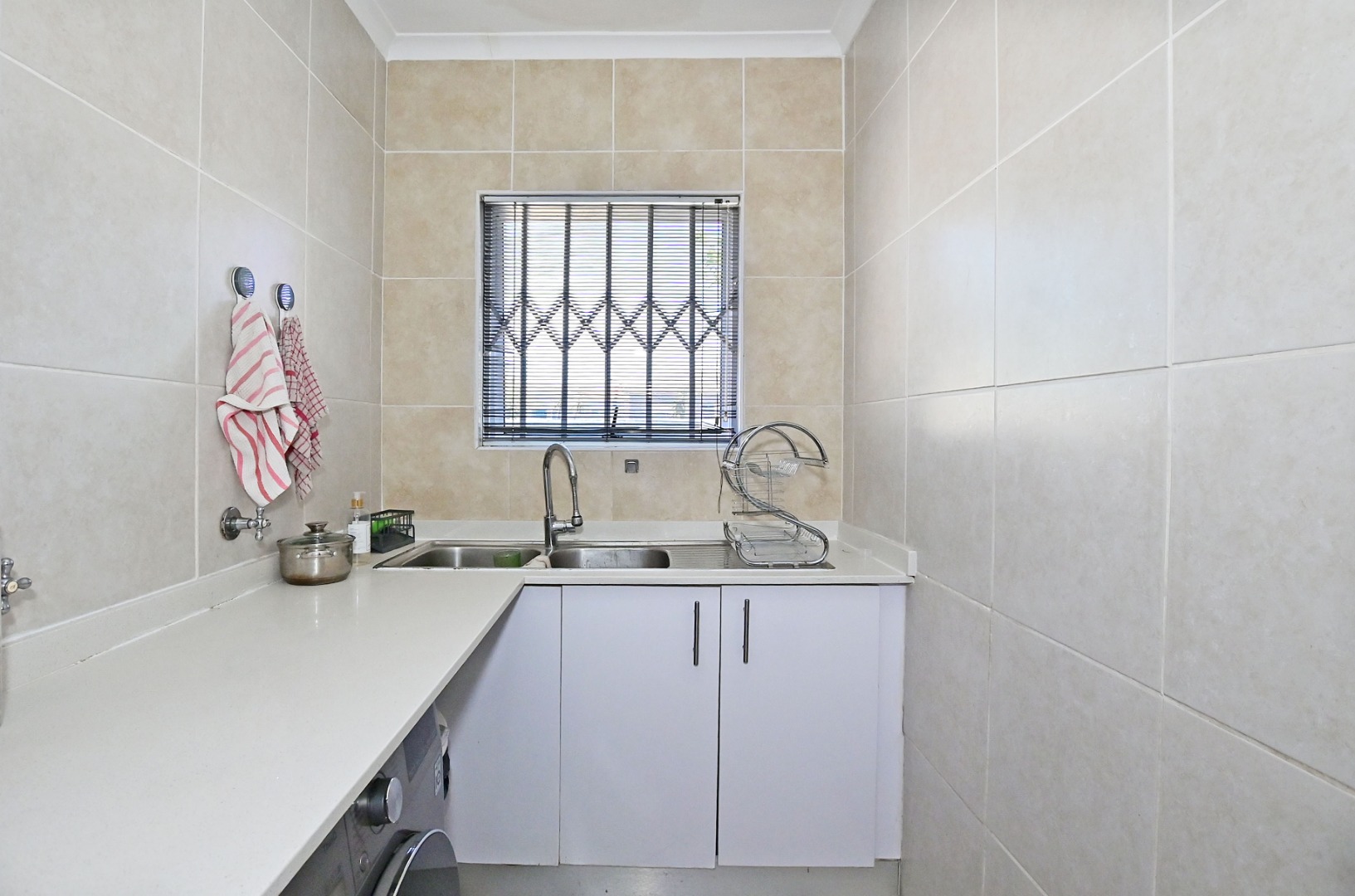 The house has great street appeal; tucked away behind 2 big, shady trees. The tiled lounge/dining area is nothing short of cavernous and has enormous, demarcated areas for both the dining area and the lounge. There’s a spacious open plan kitchen with a super-extended breakfast bar, acres of work surface; and more than enough top and bottom cupboards to accommodate even those with every kitchen gadget that exists! The kitchen boasts a newly refurbished scullery with plumbing for all the appliances and a back door leading to the side passage and through that, to the back garden drying area.