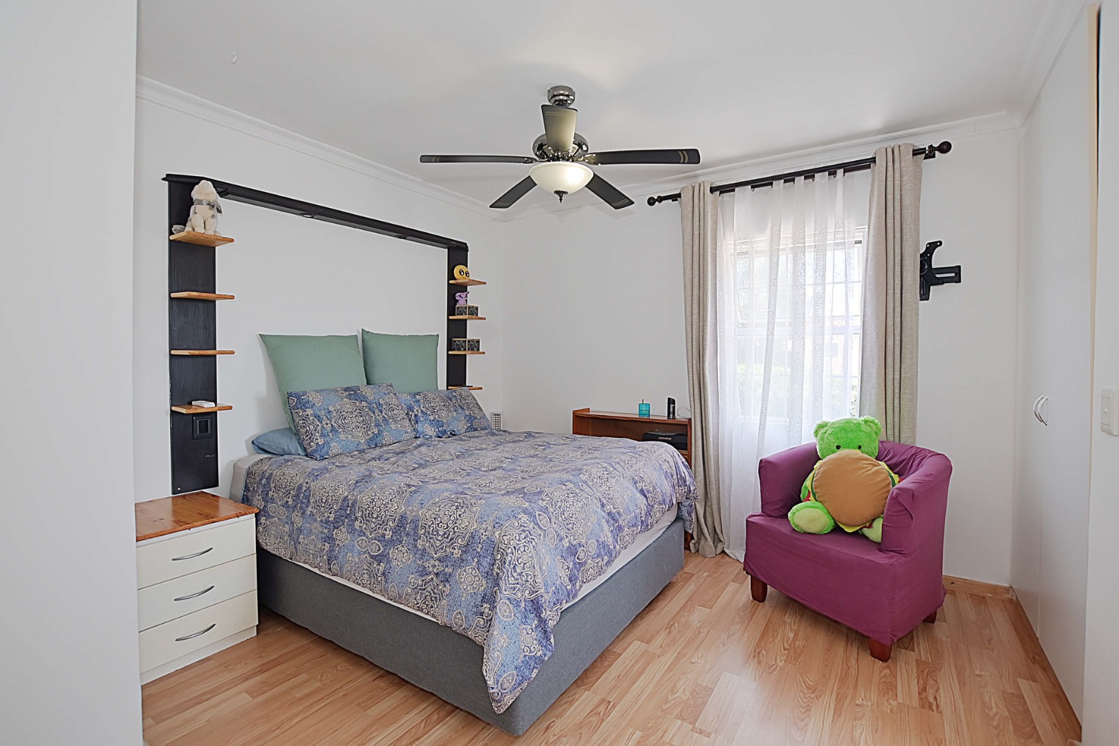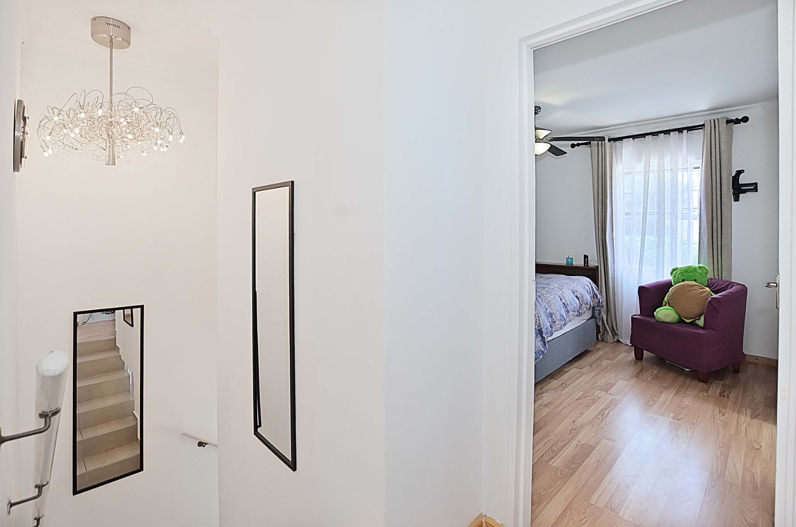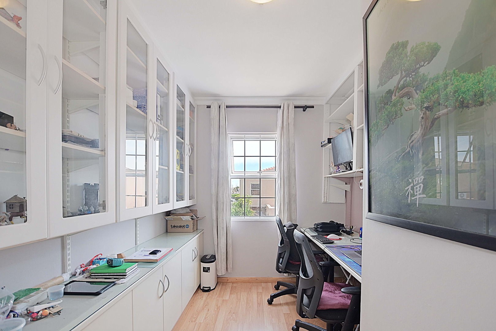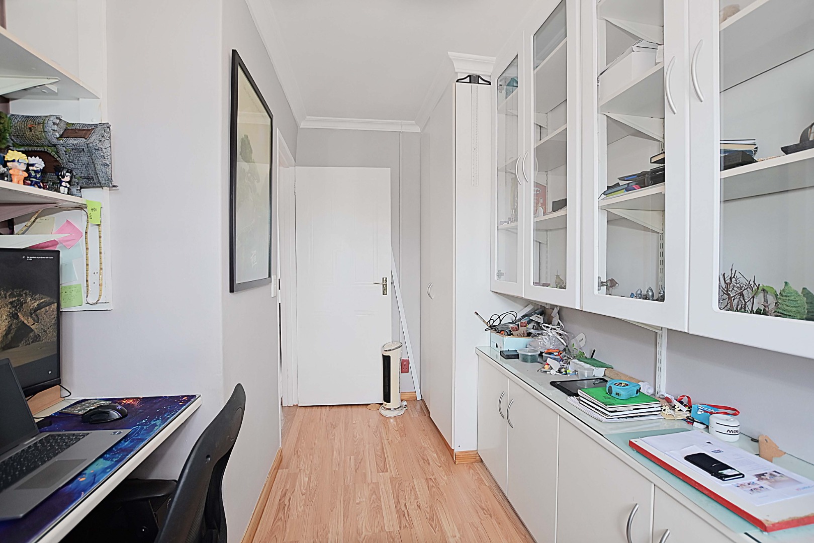 The 3 bedrooms with 2 bathrooms are upstairs, and the 3rd bedroom is already converted into an office, but office cupboards can be easily removed if this is not what you need presently.