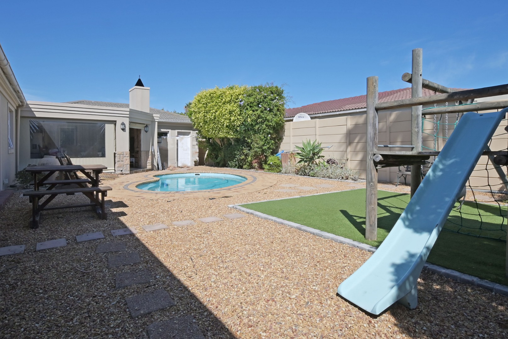 Step into the enclosed braai room with weather blinds, where indoor comfort meets outdoor lifestyle. Overlooking a sparkling heated swimming pool, this is where weekends happen — from summer celebrations to relaxed evenings with friends.