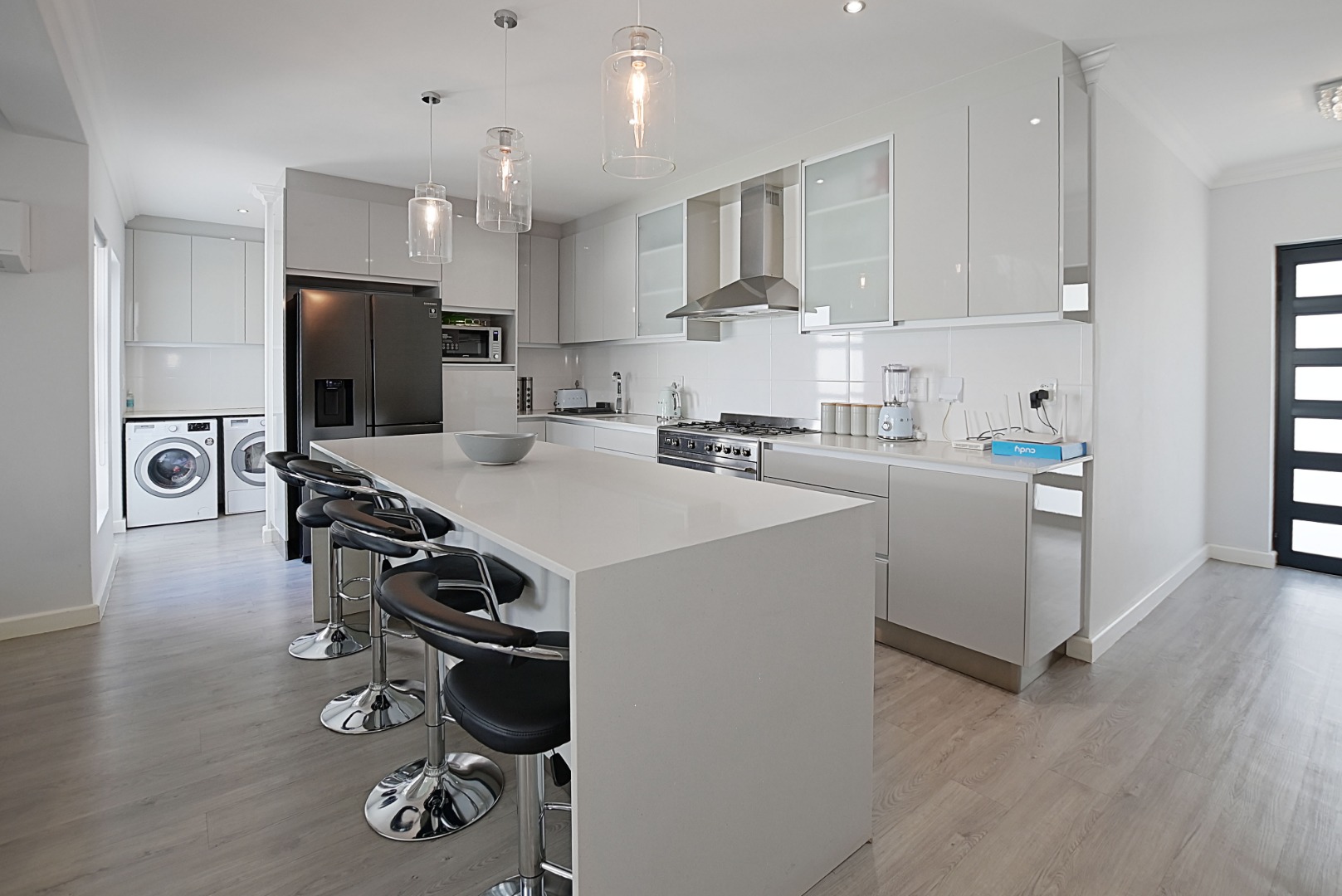 Downstairs, the open-plan lounge, dining, and kitchen area is bathed in natural light, designed for seamless flow and modern family living. The sleek kitchen boasts waterfall-edge engineered stone counters, a stylish free-standing gas and electric oven unit, and a practical scullery with space for three appliances – perfect for the home chef. The lounge features air-conditioning for year-round comfort, complemented by a convenient guest bathroom.